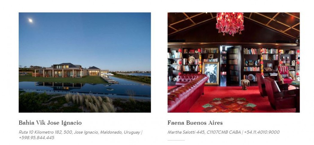 Characteristically over-the-top, Alan Faena’s flagship, signature property in Buenos Aires is wall-to-wall dramatic touches, from luxurious red velvet curtains to tufted red-leather sofas and mirrored armoires—all in stark contrast to the renovated, industrial-looking grain mill that the building occupies. Faena has installed a series of lively restaurants on-site, too: Bistro Sur, the chandelier-clad fine dining destination; El Mercado, Faena’s take on an old-school Argentinian cantina (and where dishes are prepared in a huge brick oven); The Library Bar, which becomes a nightlife destination after dark; and a major cocktail operation that’s fitting of the spectacular, crown-shaped fountain installed in the hotel pool’s deep end. Be sure to leave time for nightly cabaret performances and a few hours in the marble-walled hammam.Fasano has hotels all over Brazil (you’ll find them in Rio, Sao Paolo, Boa Vista, and more), but their property in the Uruguay beach town of Punta Del Este, opened in 2010, is their first international project. Nestled alongside the Maldonado River, the 20 bungalows and ten suites were designed by architect Isay Weinfeld in sleek, square shapes that are high-design and a completely refreshing aesthetic for a beach vacation. The interiors are suited to the modernist exterior without feeling cold—rooms are done in soft, cozy neutrals with pristine marble and limestone bathrooms, and porches that look out over the landscape. Also on-site, you’ll find two incredible restaurants: Las Piedras, a casual café, and Fasano, their more formal dining experience, which occupies a large, view-happy sunroom. Of course, the main attraction here is the beach, accessed through Fasano’s high-touch Beach club, but there’s also a very cool onsite pool (carved into a naturally occurring rock formation), and concierge can arrange tennis, golf, horseback riding, and reservations at restaurants in the area’s quaint town.