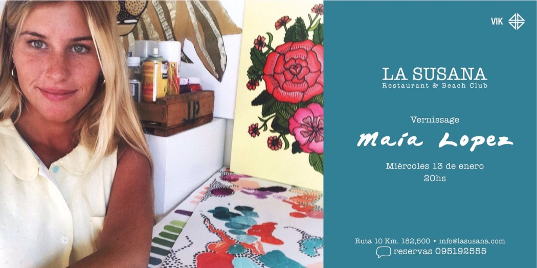 Vernissage MAIA LOPEZ – La Susana hace 1 año Miércoles 13 de Enero 20 Hs. Ruta 10 Km. 182.5 info@lasusana.com 095 192 555
