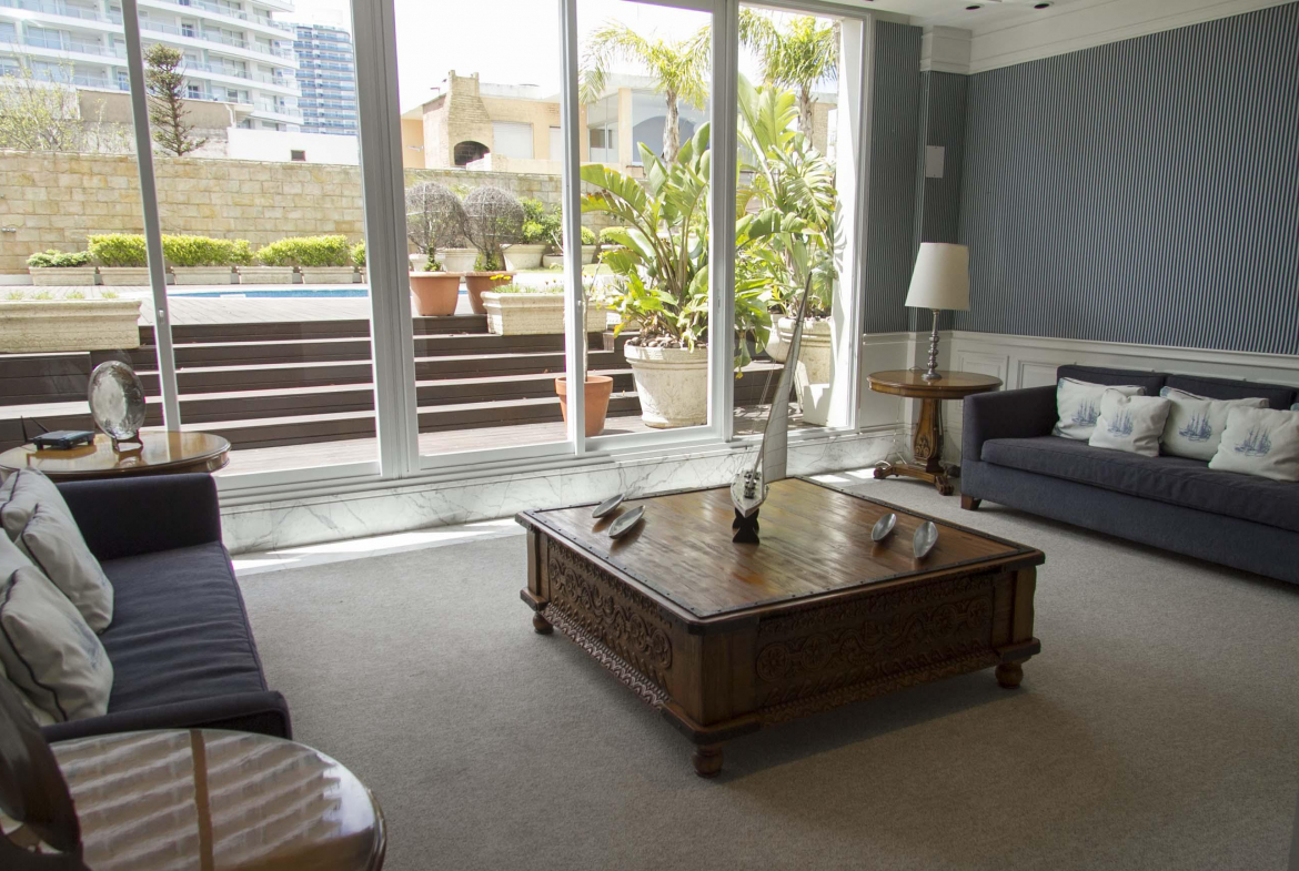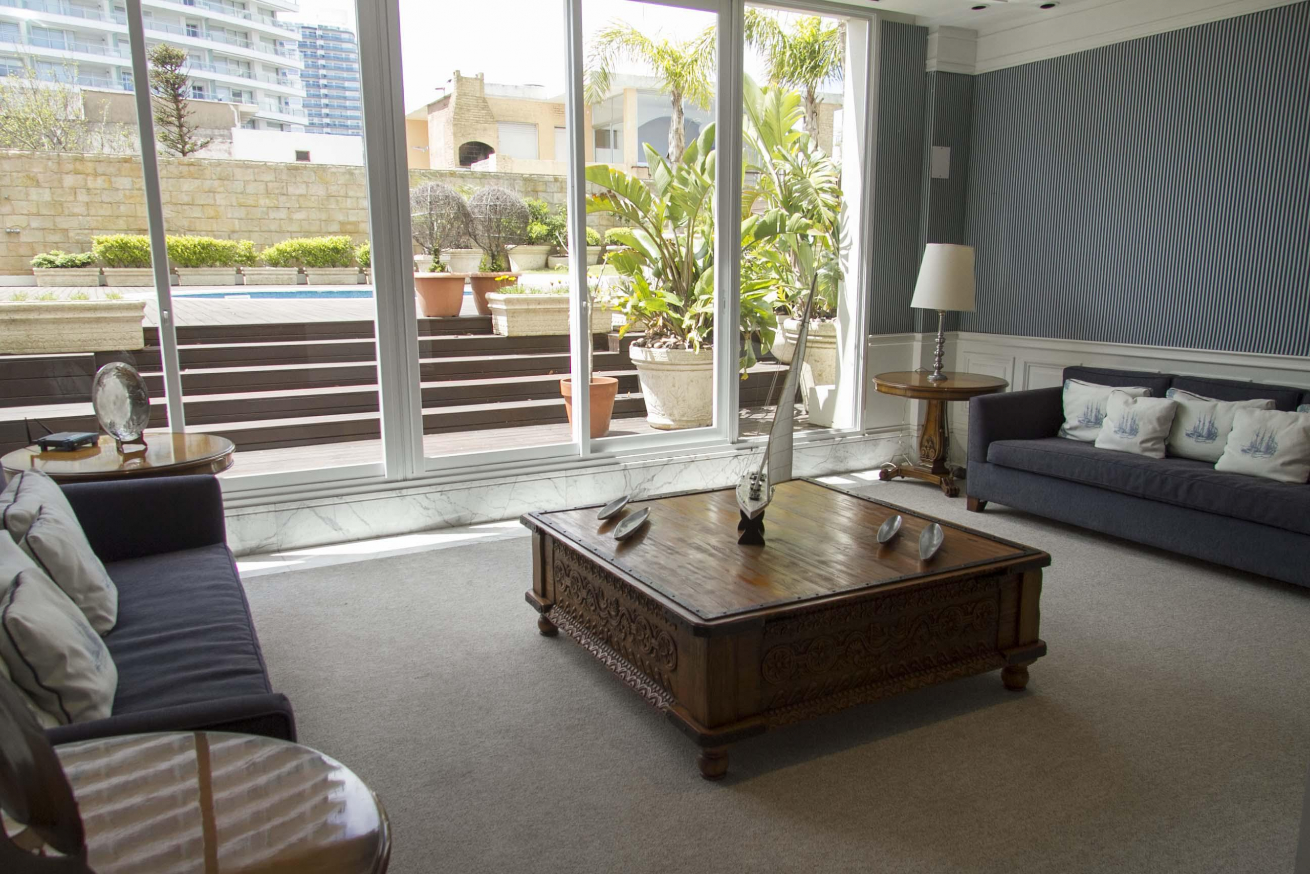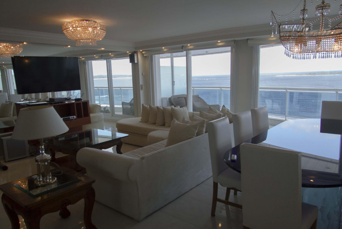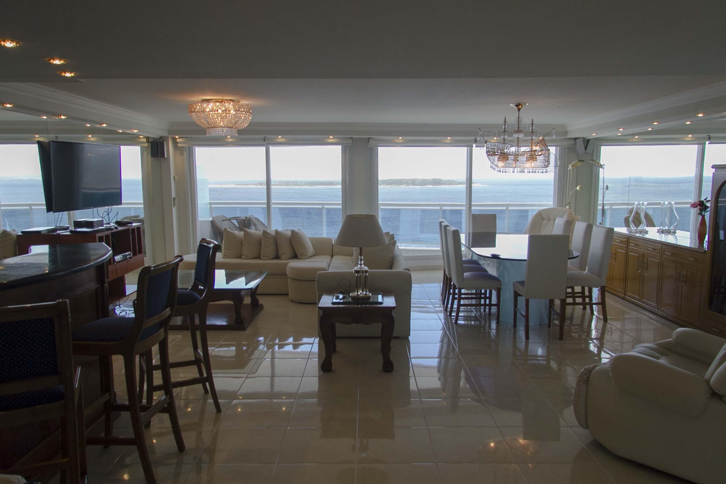 Gran estar con living, comedor integrado y bar con una vista exclusiva al mar, toilette, y amplia cocina con dependencia de servicio con capacidad para dos personas y lavadero.