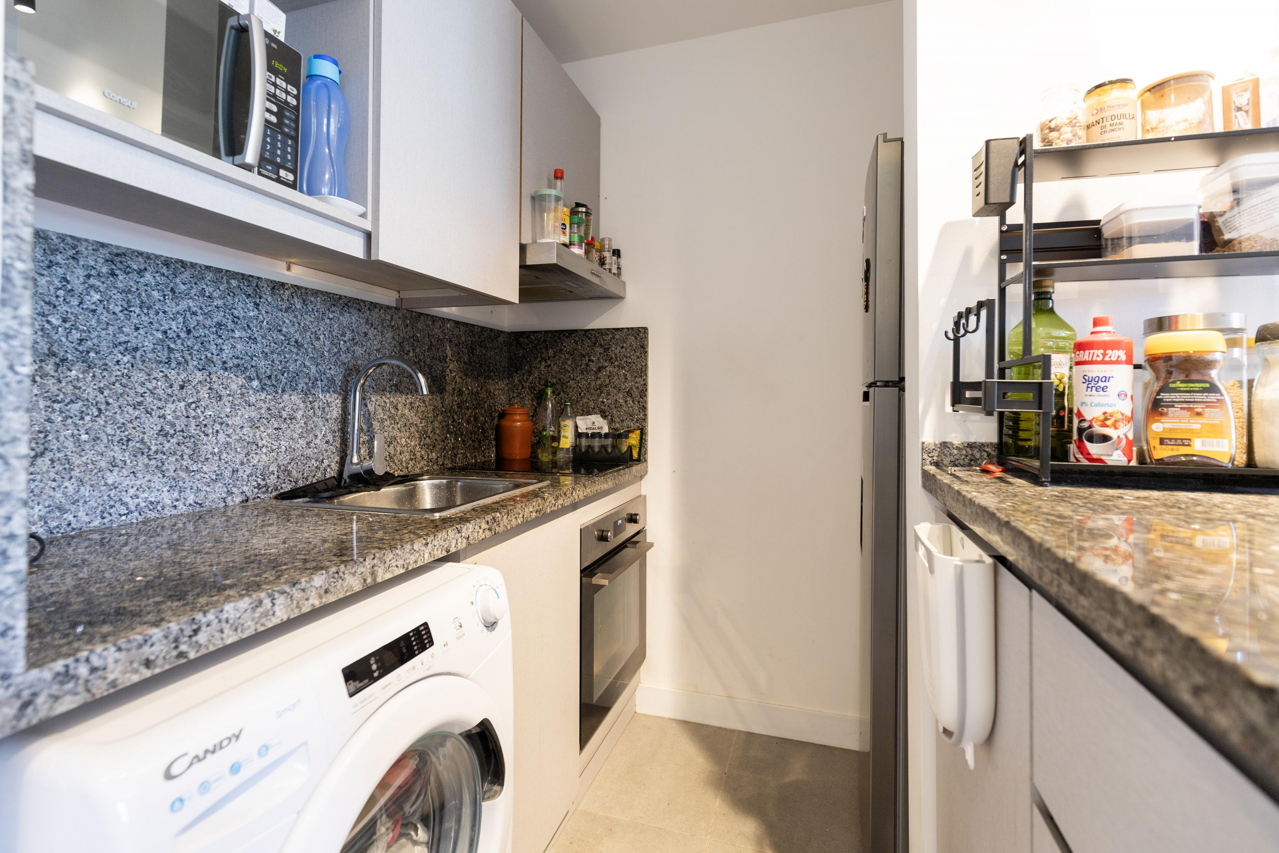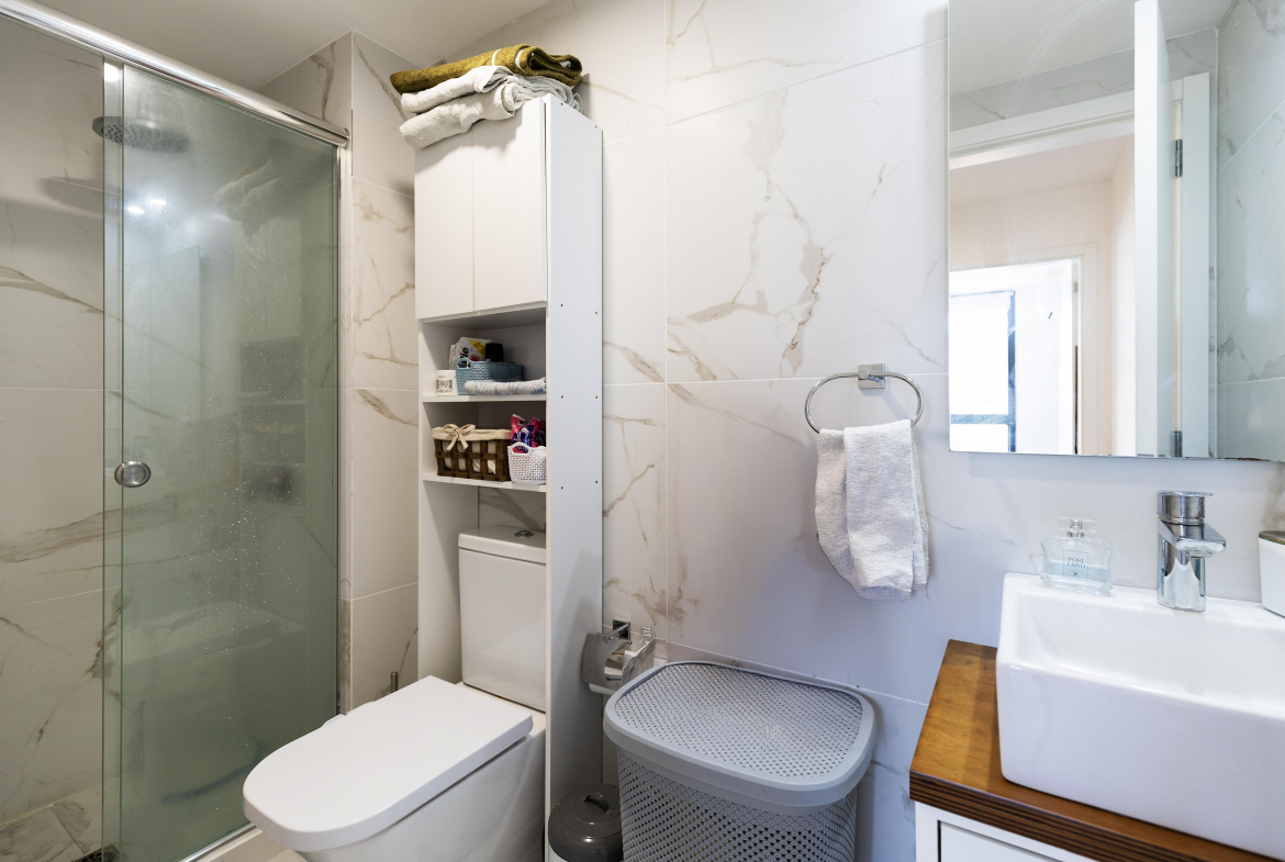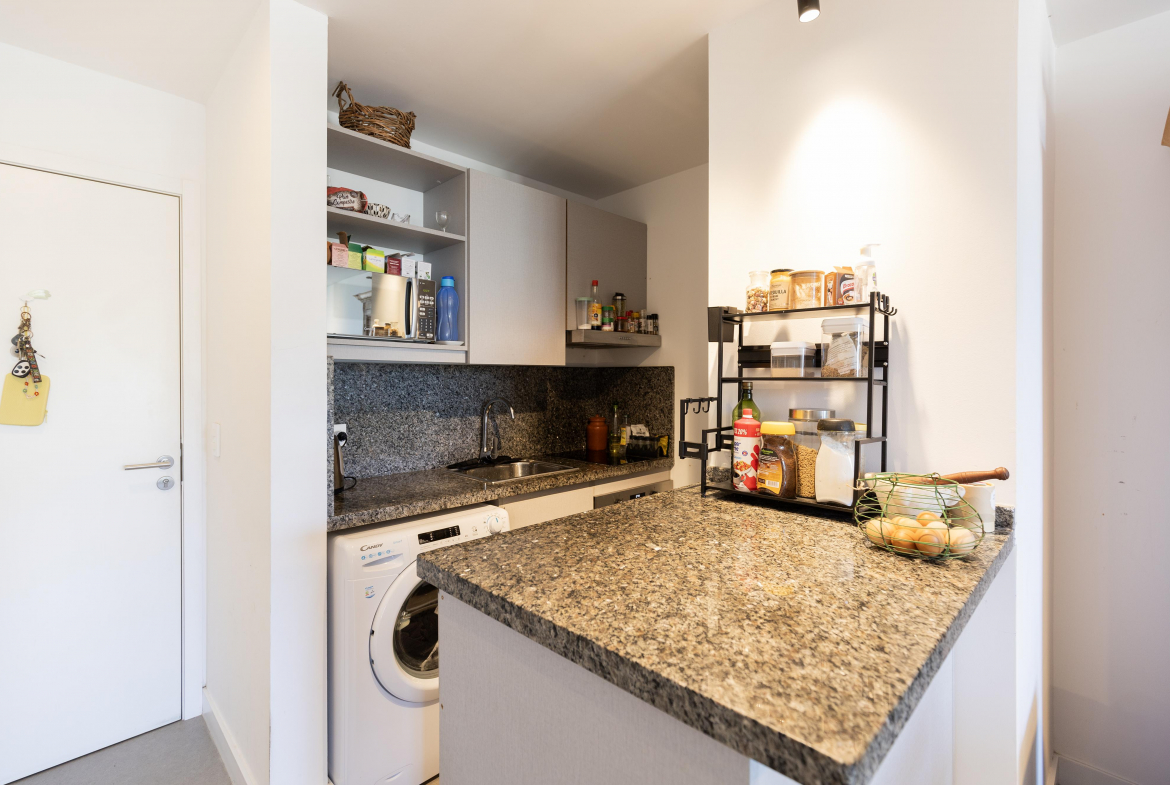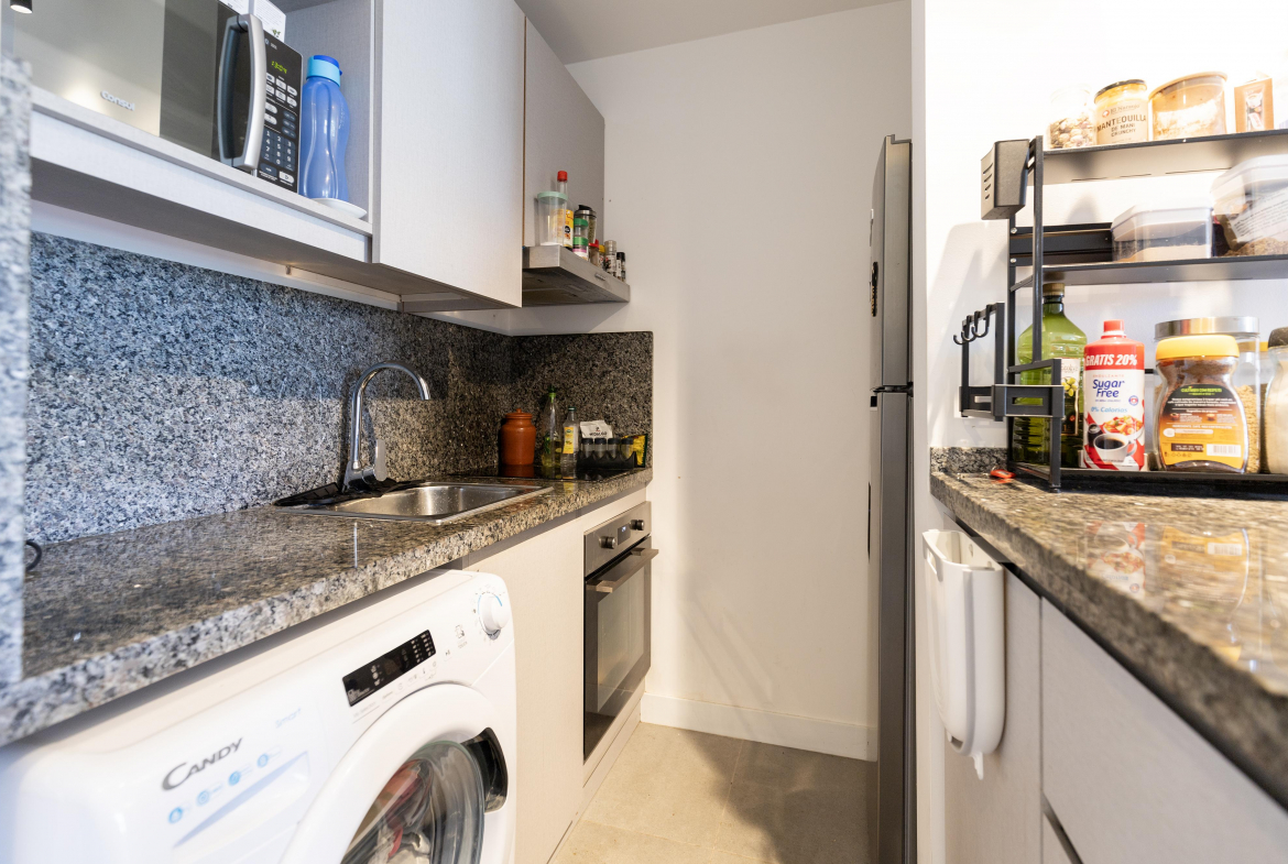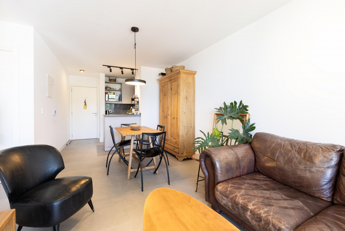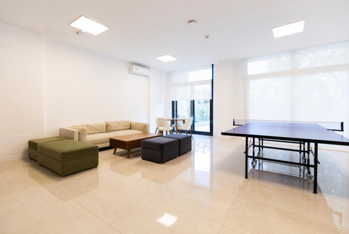 Su diseño funcional cuenta con 1 dormitorio y medio, ideal para familia pequeña. Cocheras en subsuelo, estacionamiento exterior, tres ascensores.