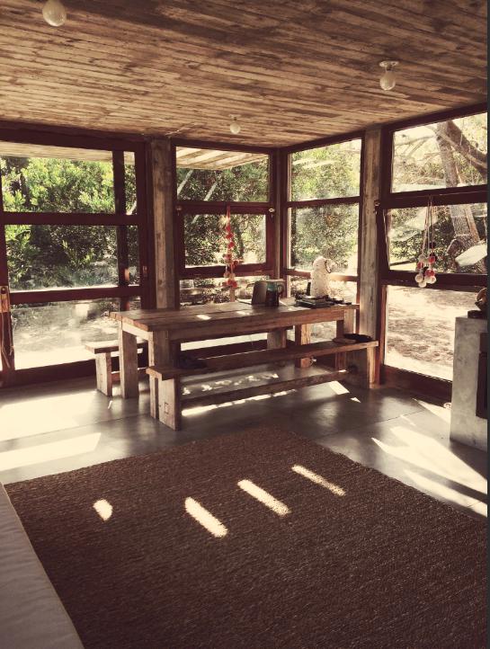 Living comedor con cocina integrada (hogar a leña), todo vidriado con mucha luz y vista al jardin.