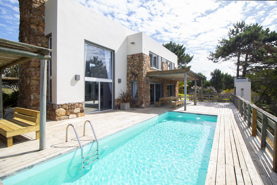 El exterior sin dudas es uno de los puntos más fuertes, por un lado la vegetación de árboles autóctonos le brinda sombra en algunos sectores y a su vez un gran deck con parrillero y pérgola que cubre una mesa de comedor, acompañan a la piscina. Desde este sector de la casa, se puede contemplar la muy linda vista a las chacras y lagos cercanos.