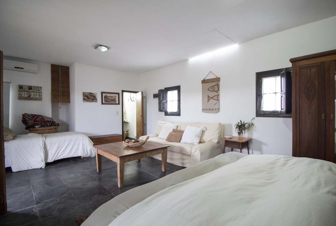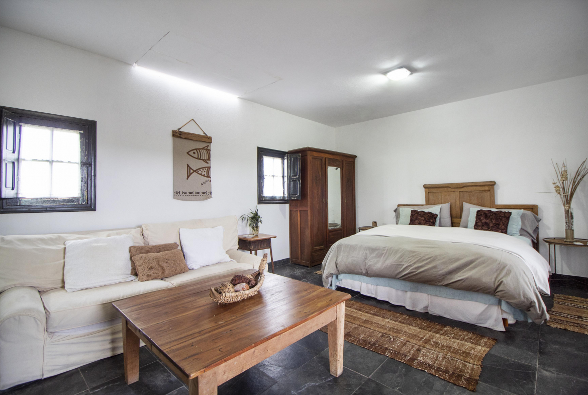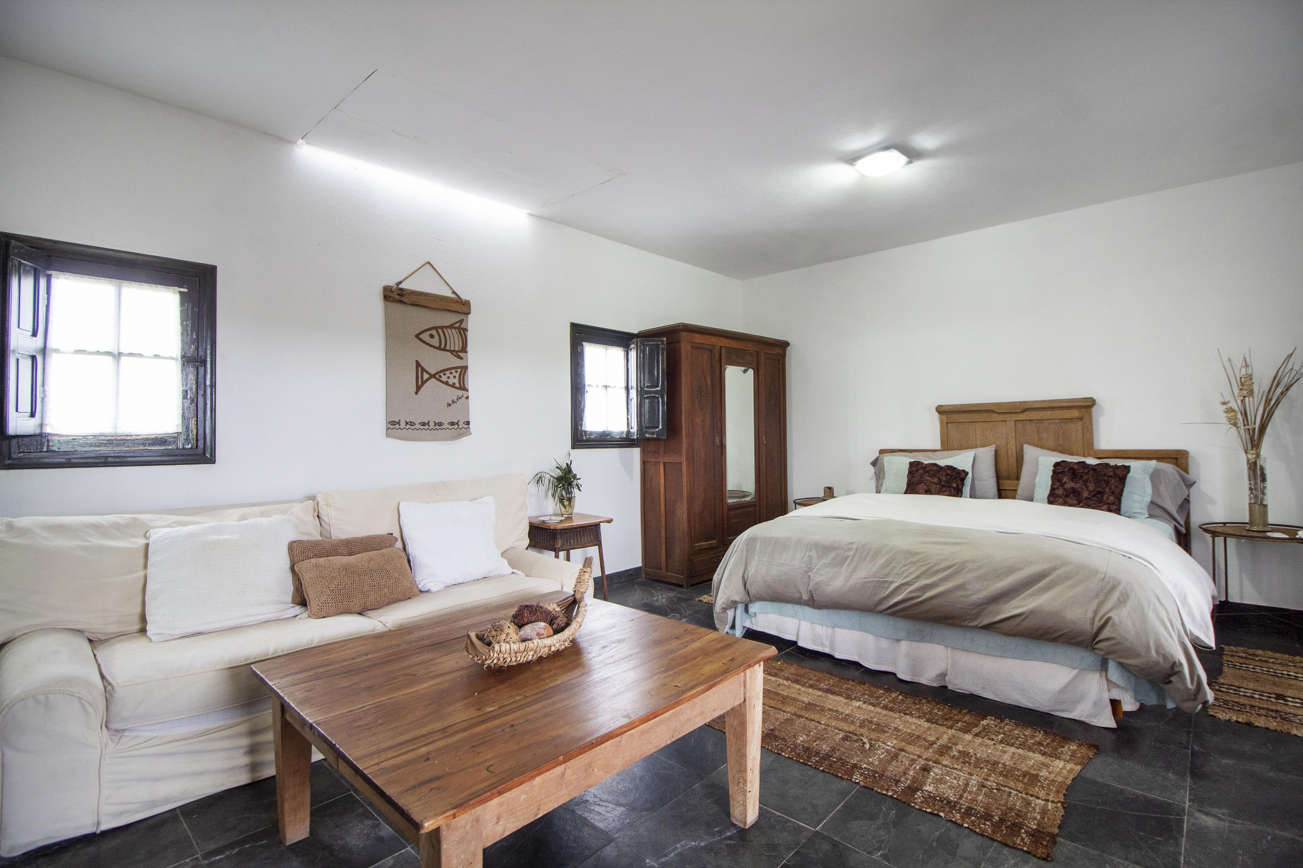 Independiente de la casa, un amplio dormitorio en suite con cama king y una cama single extra.