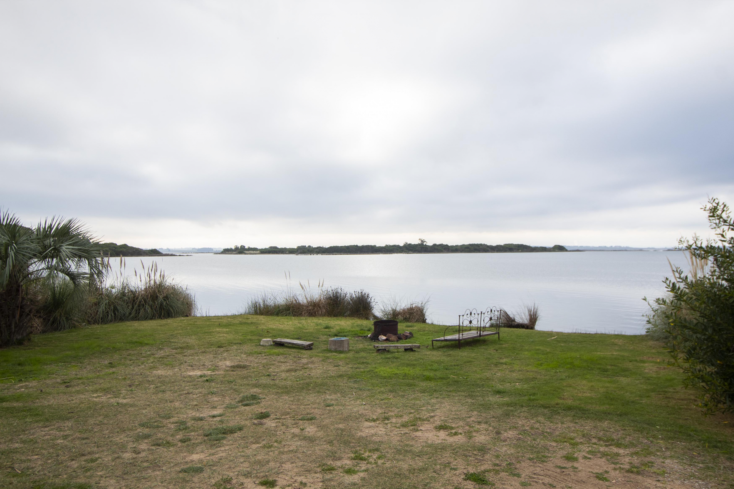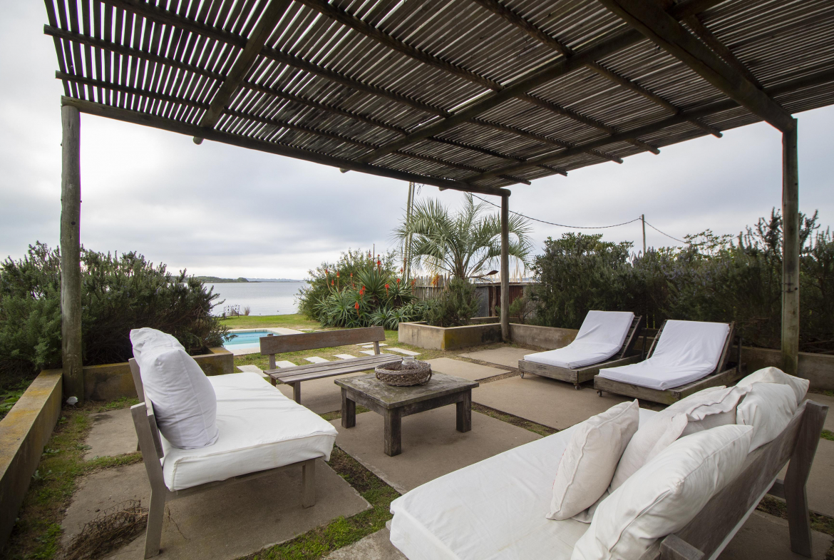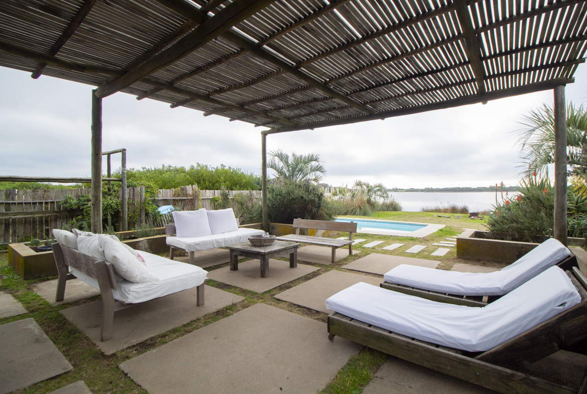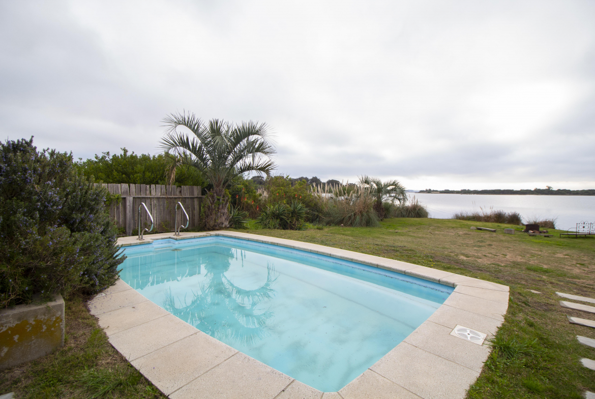 Al frente, jardin con deck, con camastros junto a la piscina, teniendo de fondo la laguna.