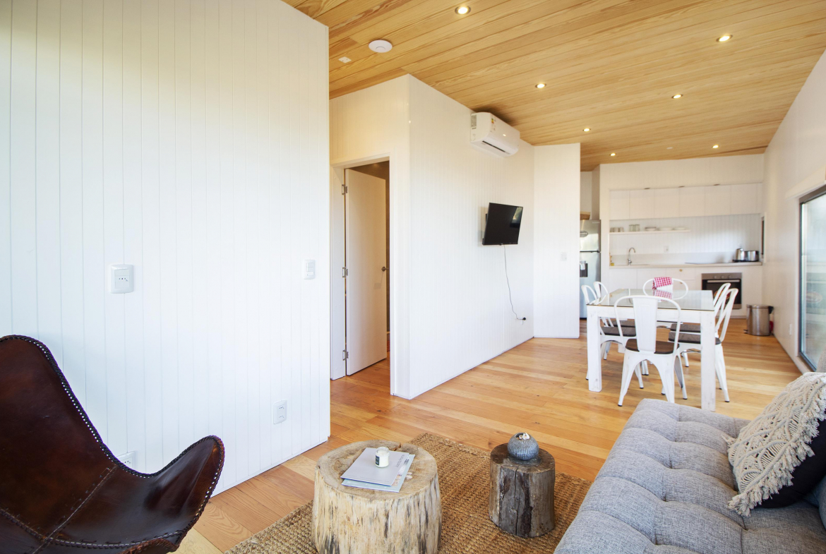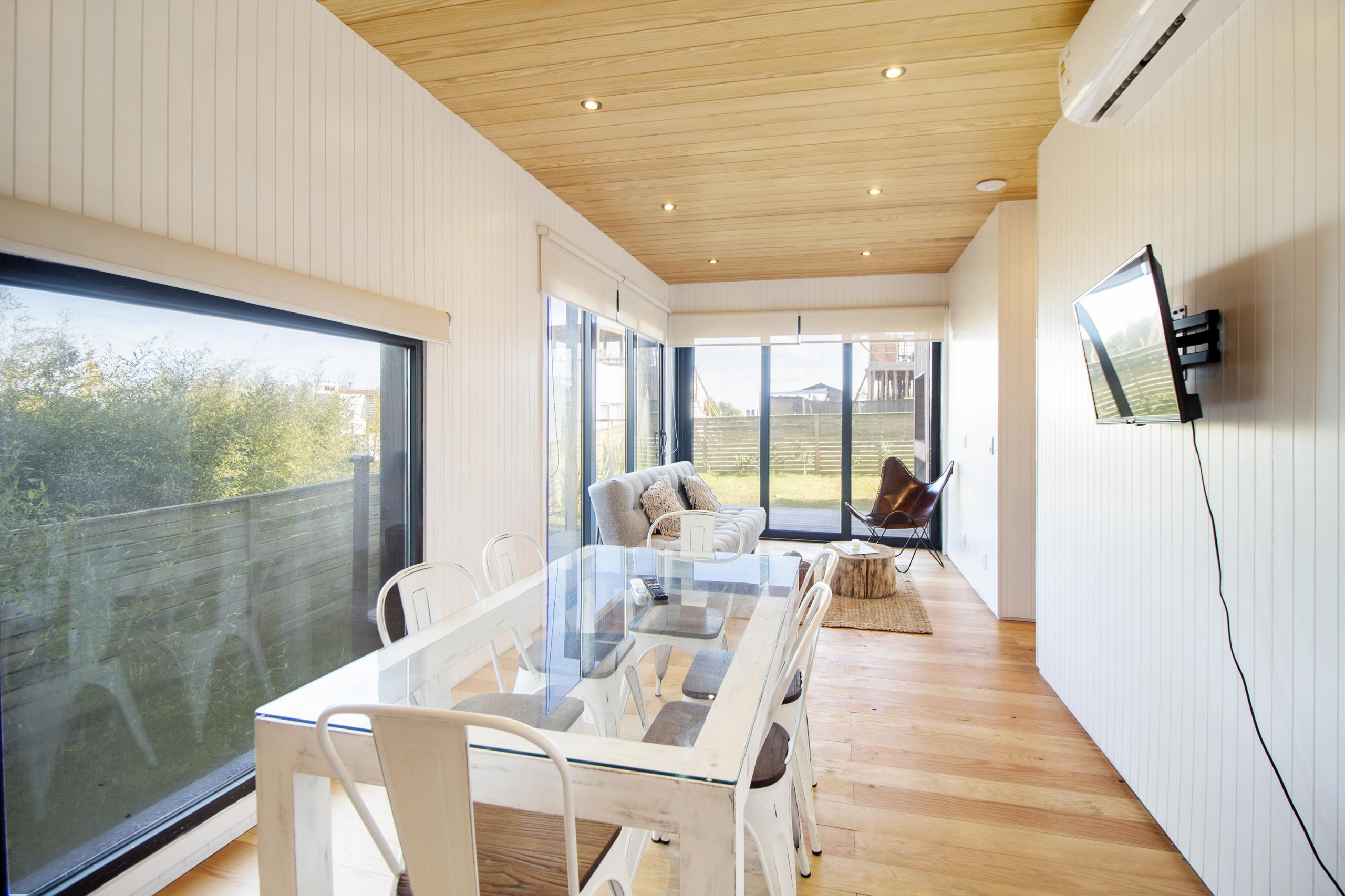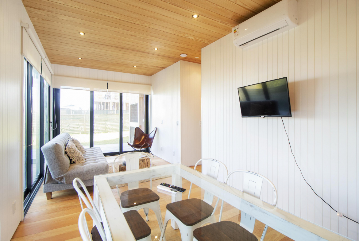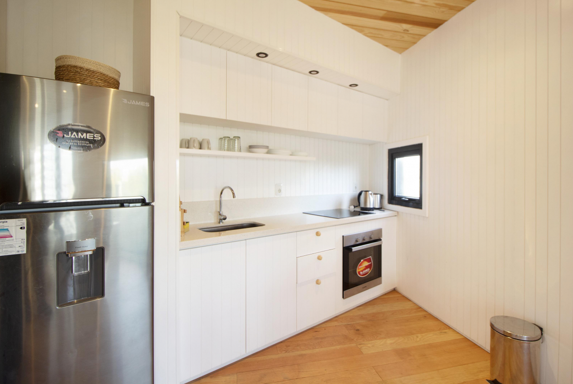 Cocina totalmente equipada, television smart, wifi, ropa blanca. Hacia el atardecer, parrilla cubierta, con comedor exterior, pequeño jardin delimitado con cerco verde, y parrillero para disfrutar del lugar.