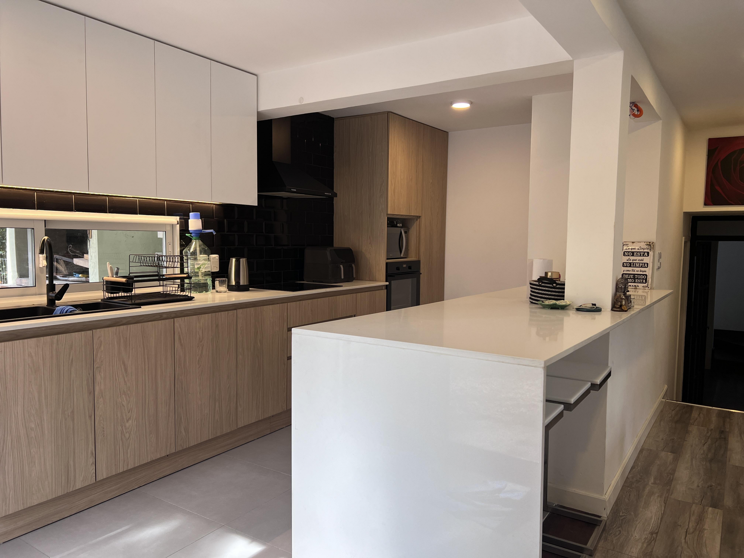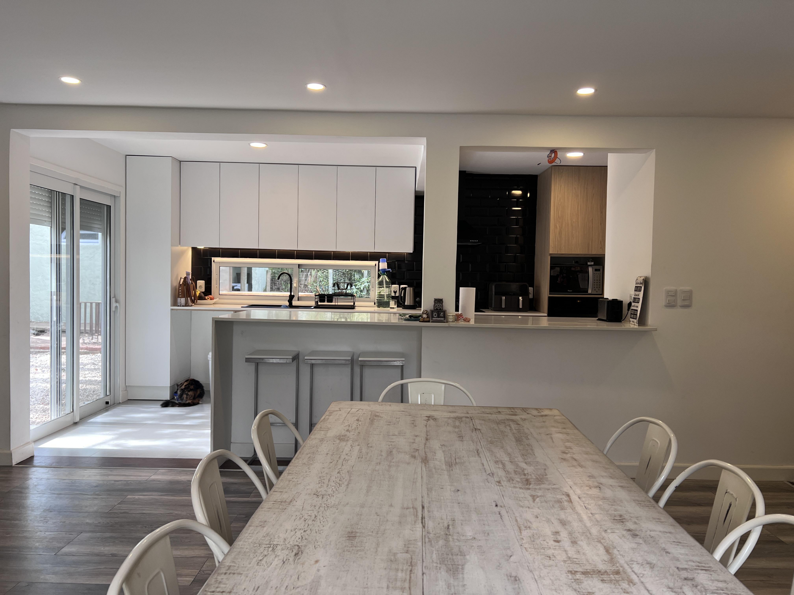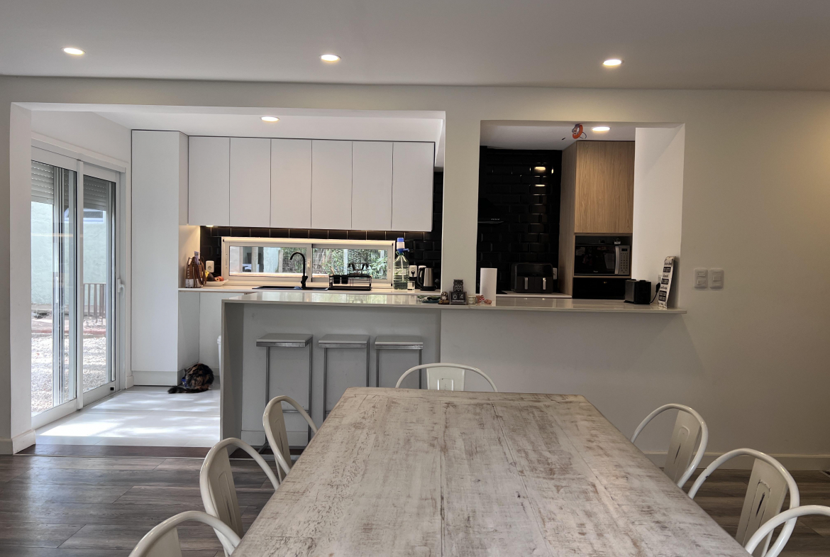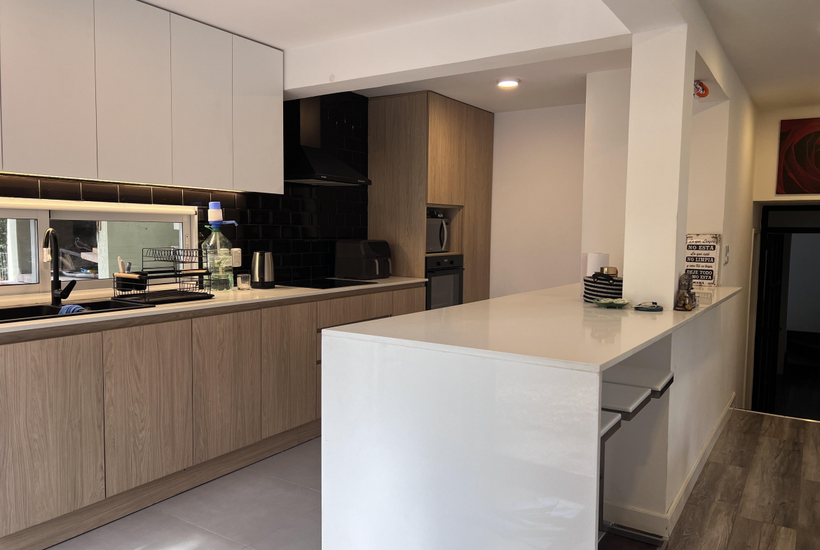 Cocina equipada diseñada para disfrutar en familia o amigos, con isla o barra desayunadora, conectada al exterior para facilitar eventos o desayunos al sol.