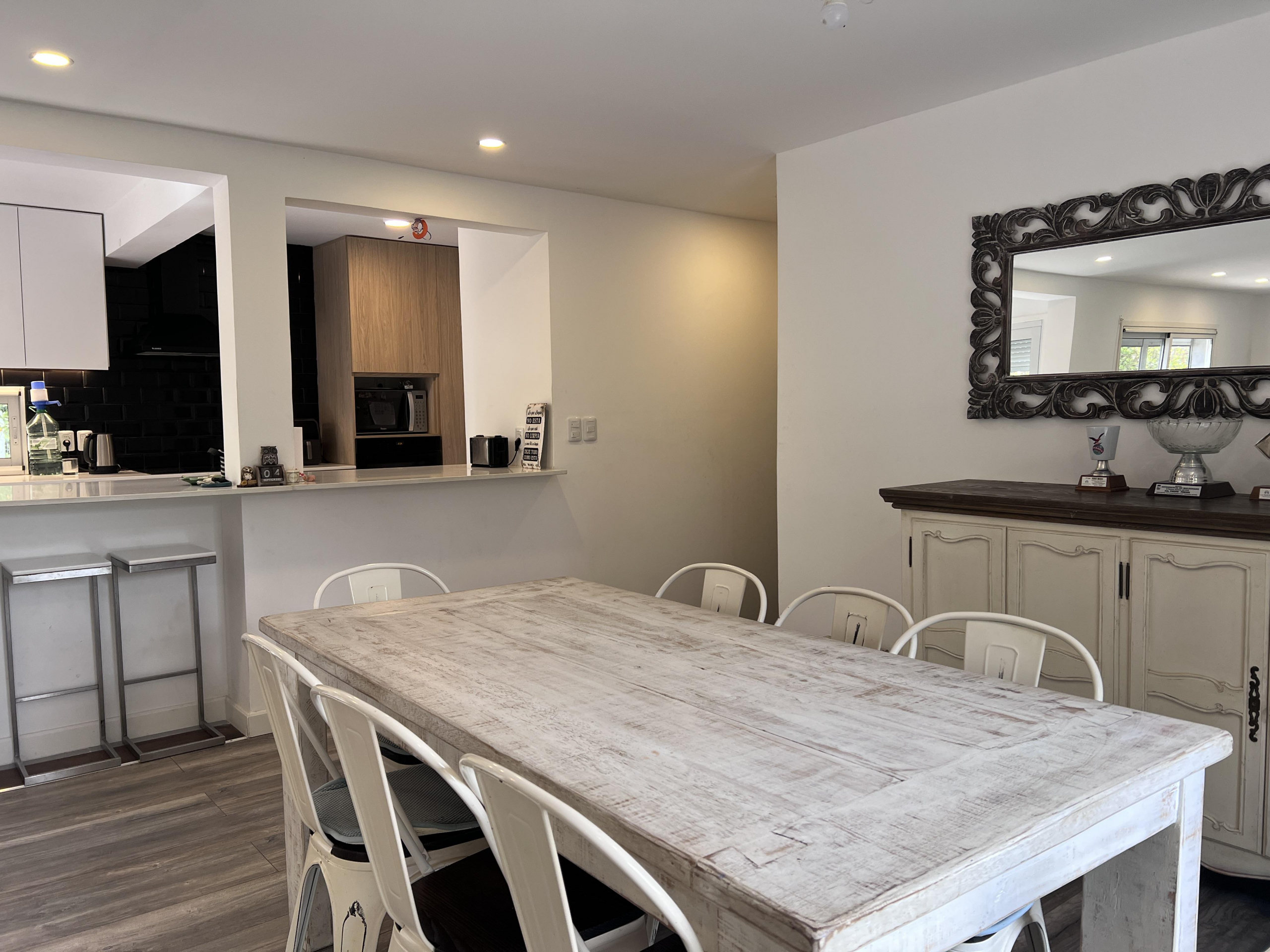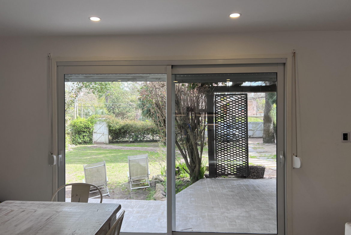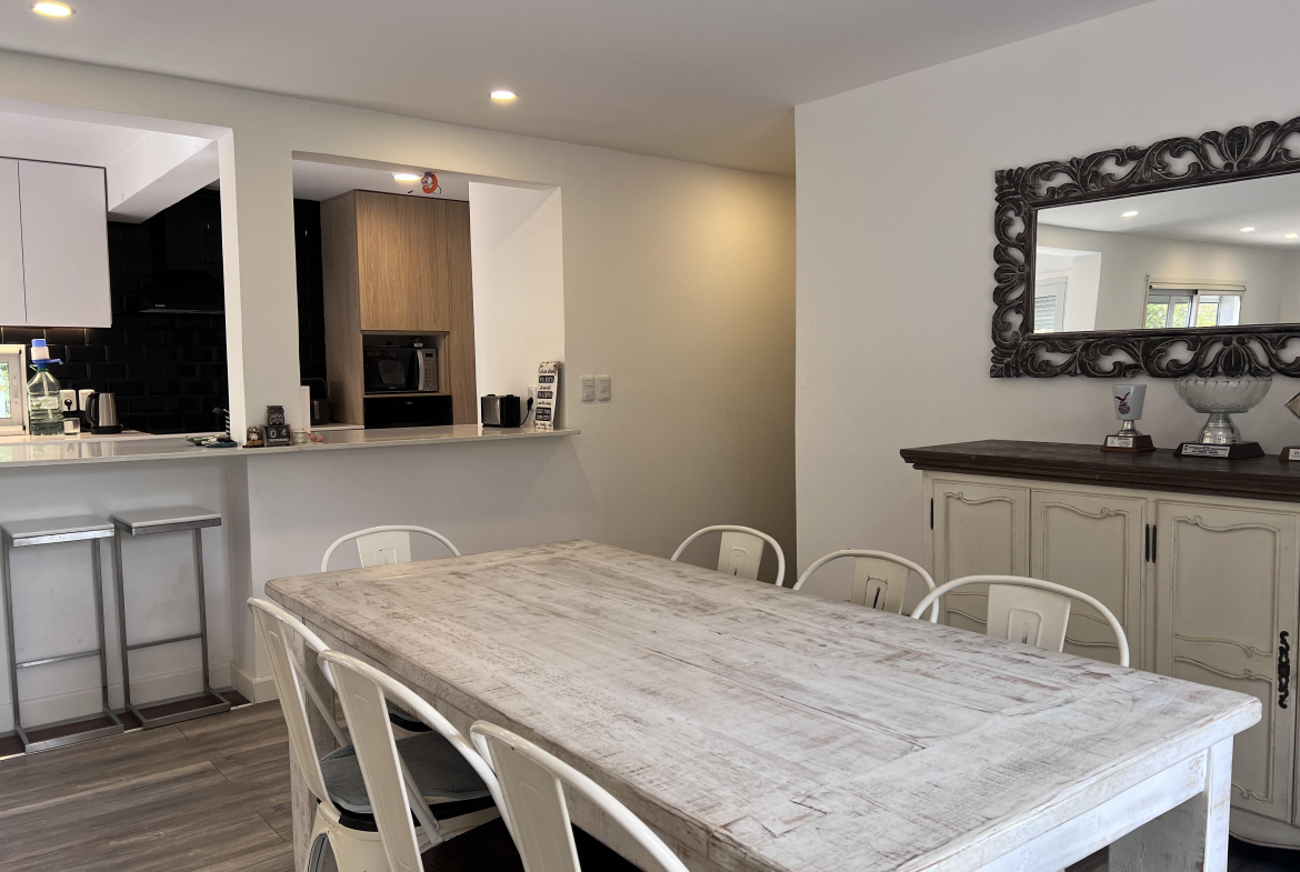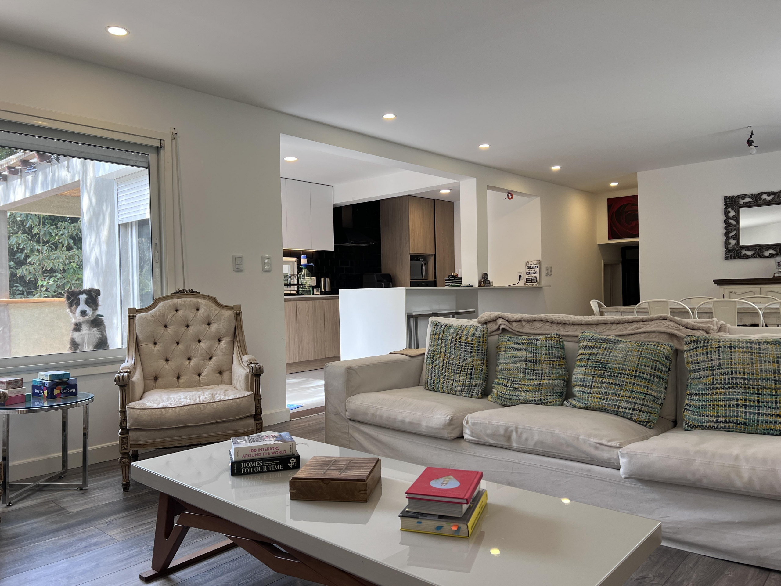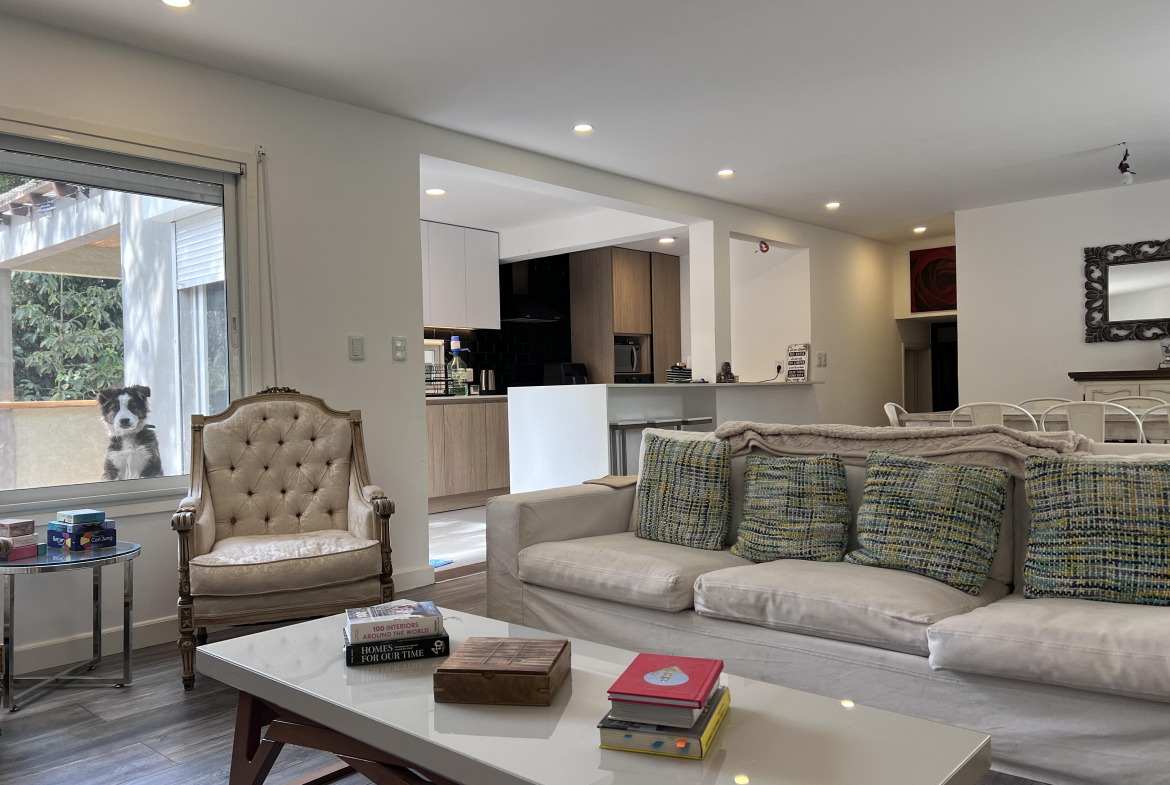 Amplio living-comedor de diseño contemporáneo, con grandes ventanales que se abren al jardín, permitiendo disfrutar la luz, la brisa y el verde del entorno