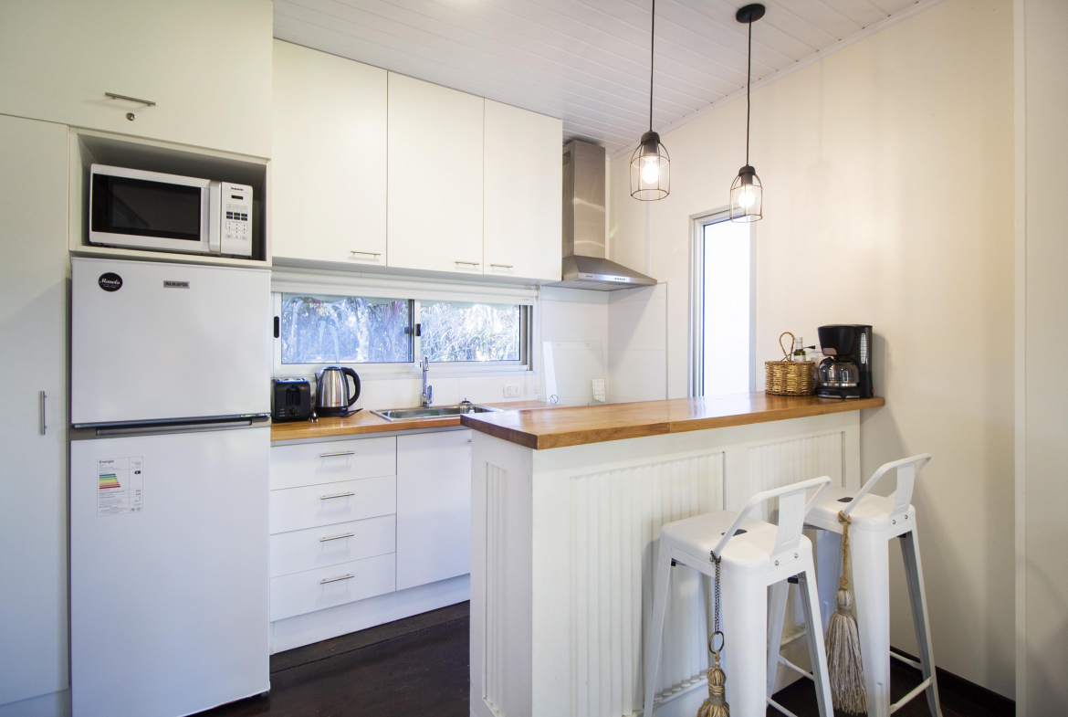 Large sliding windows connect with the house and a cozy, open kitchen with integrated living and dining room. Good storage space. Bedroom en suite. All rooms with split.