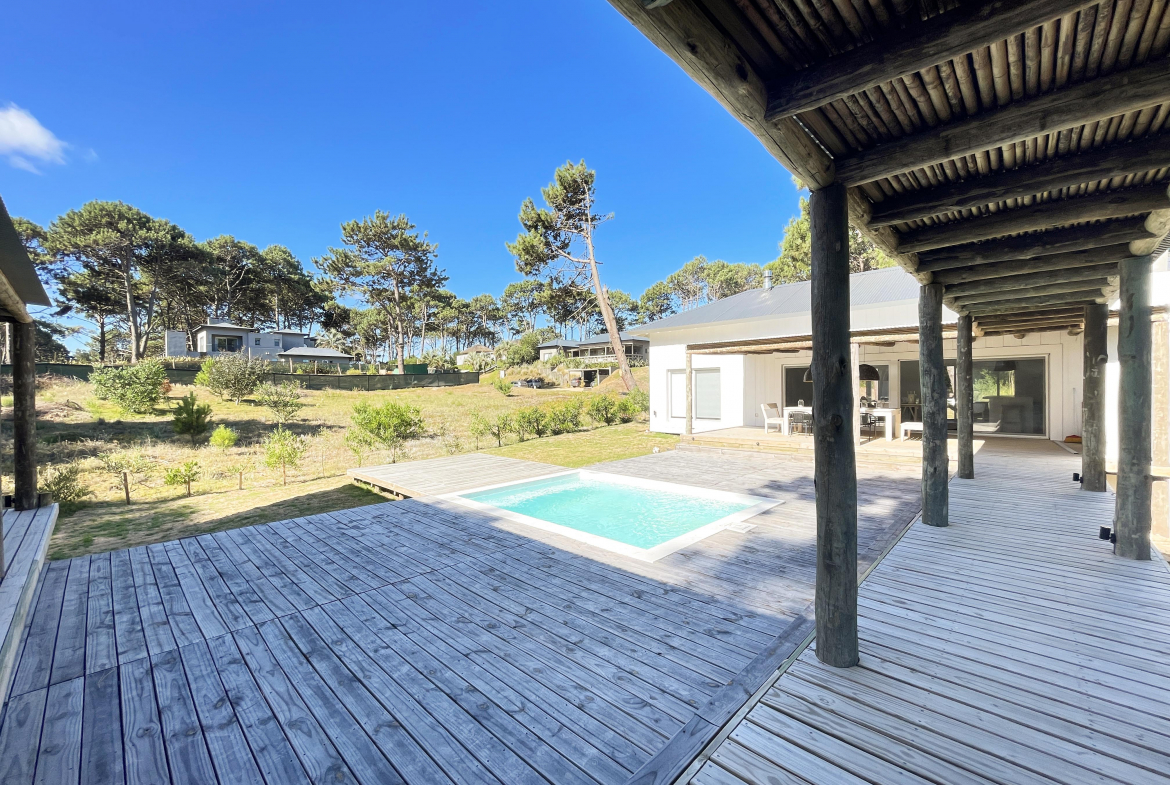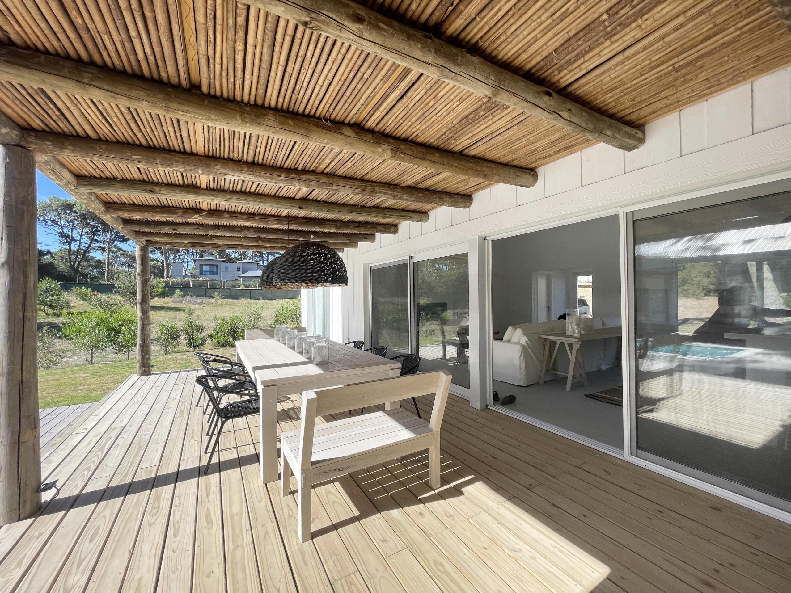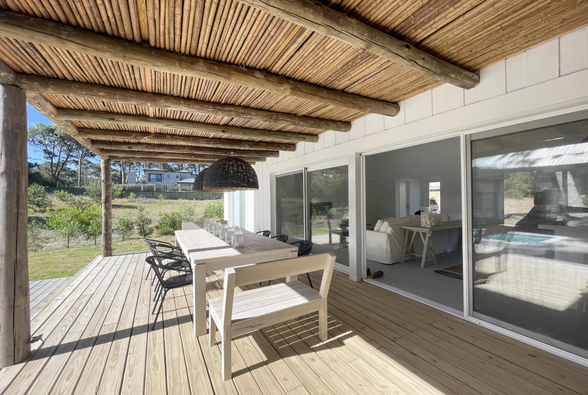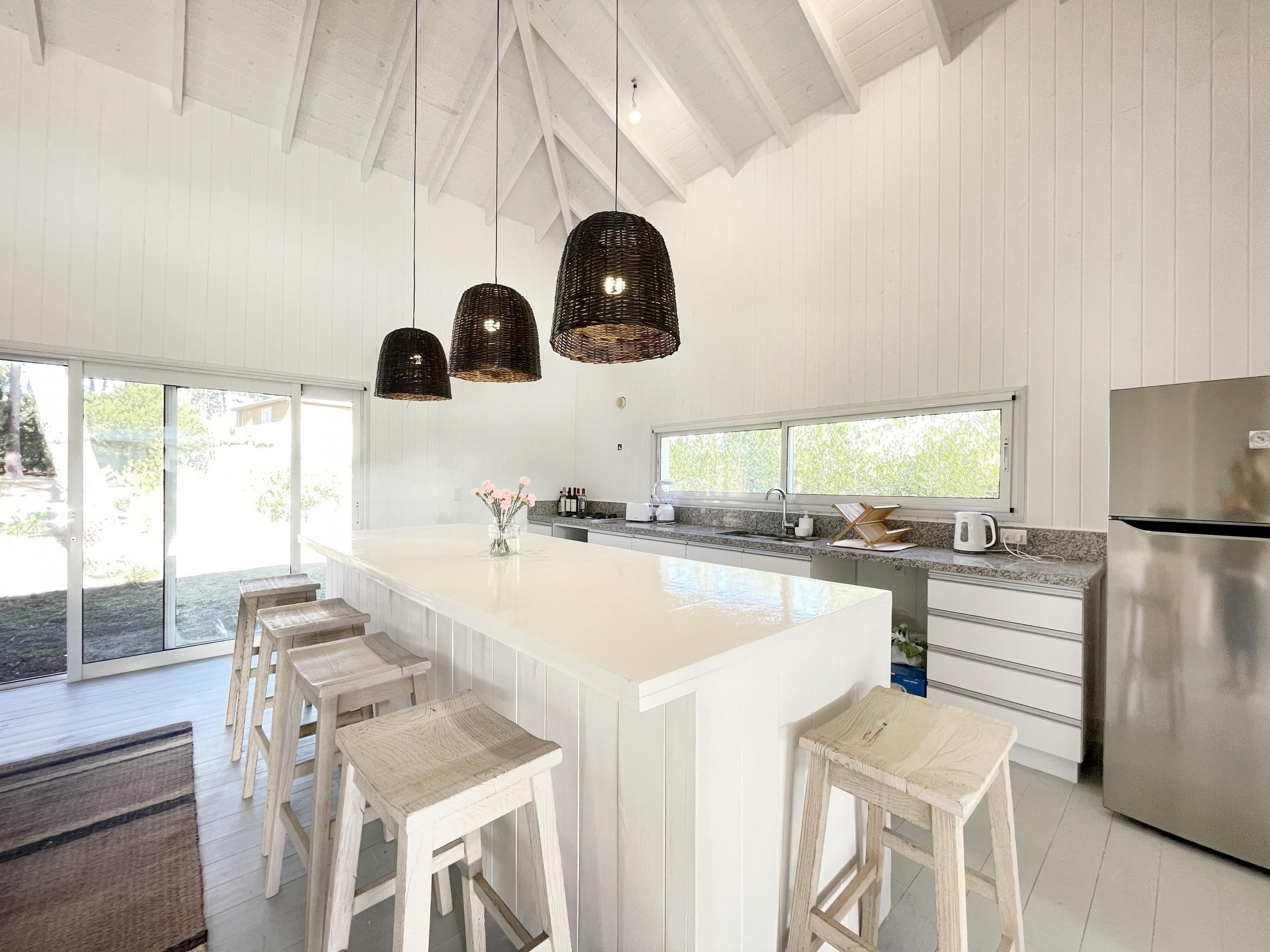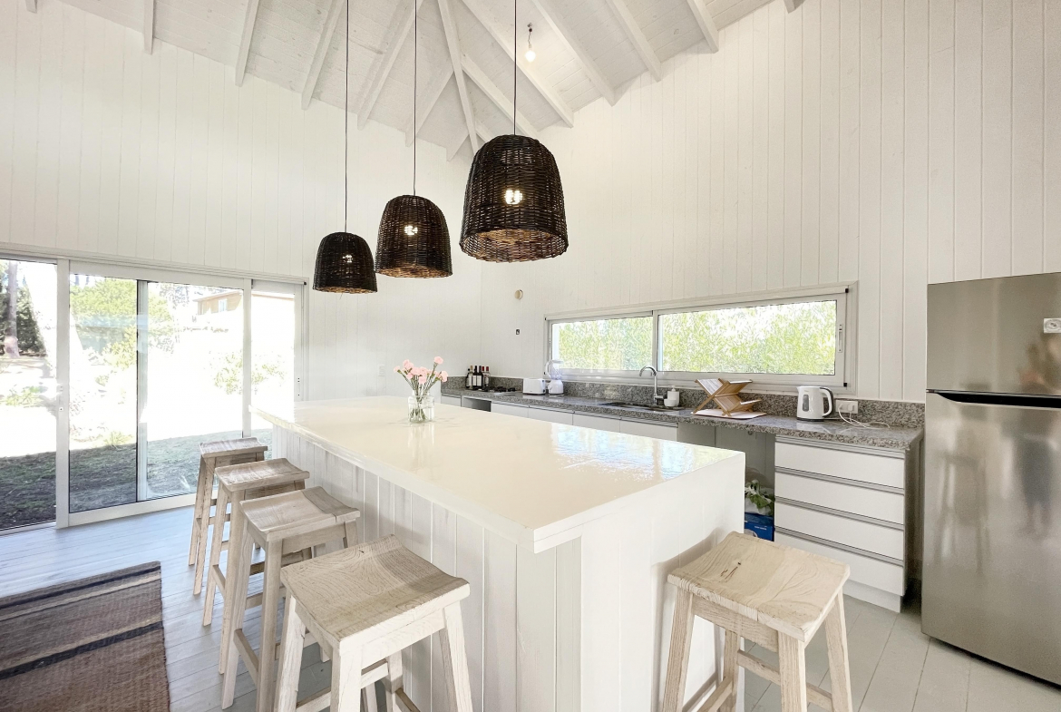 Desarrollada toda en una planta, consta en volumen principal con espacios comunes, toillete y master suite. Espacioso living comedor y cocina integrados con amplios ventanales al deck.