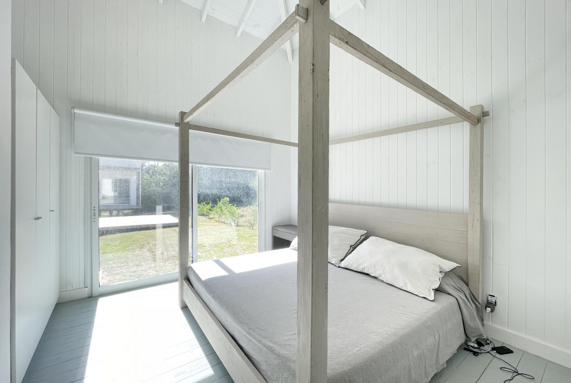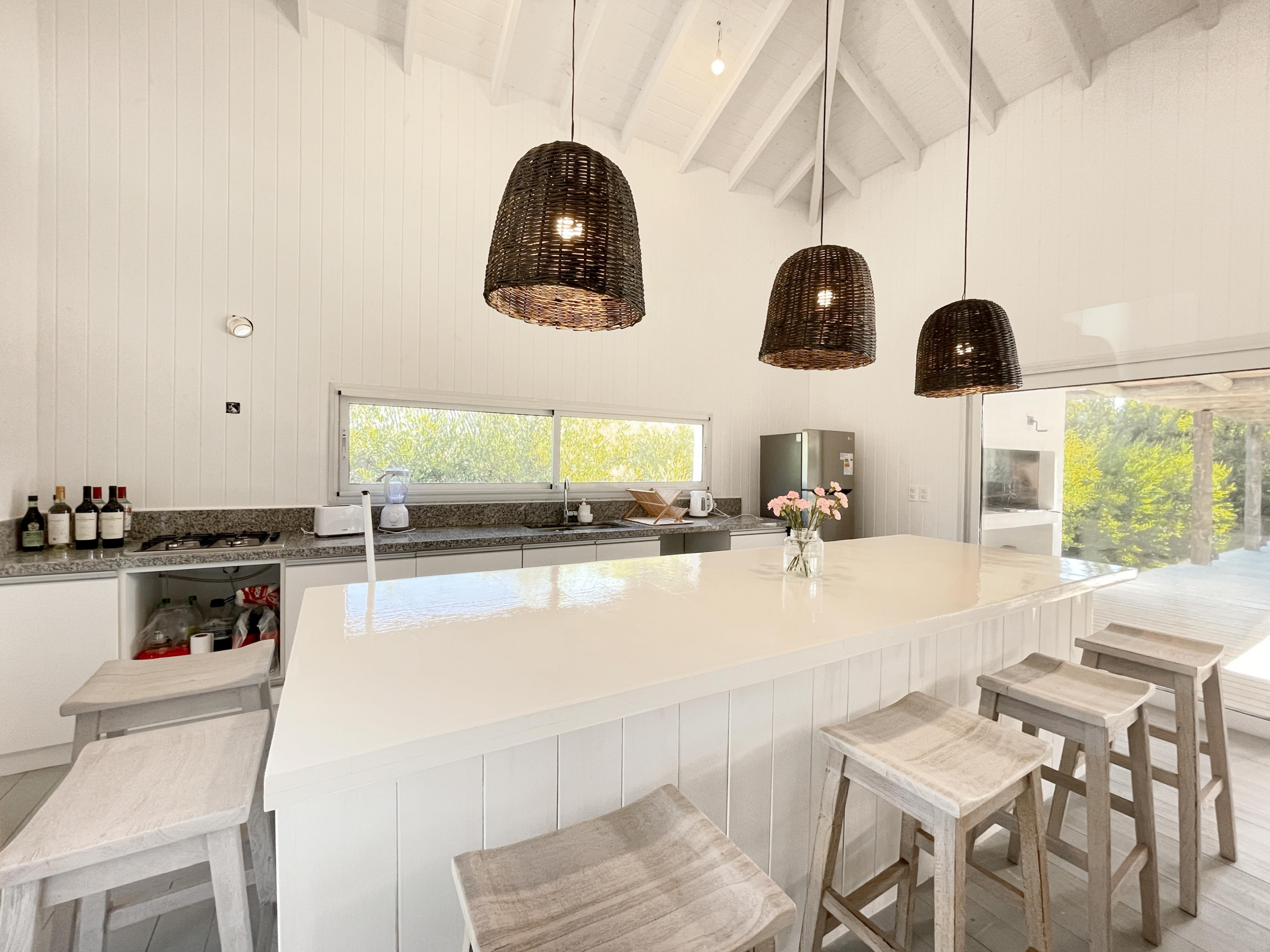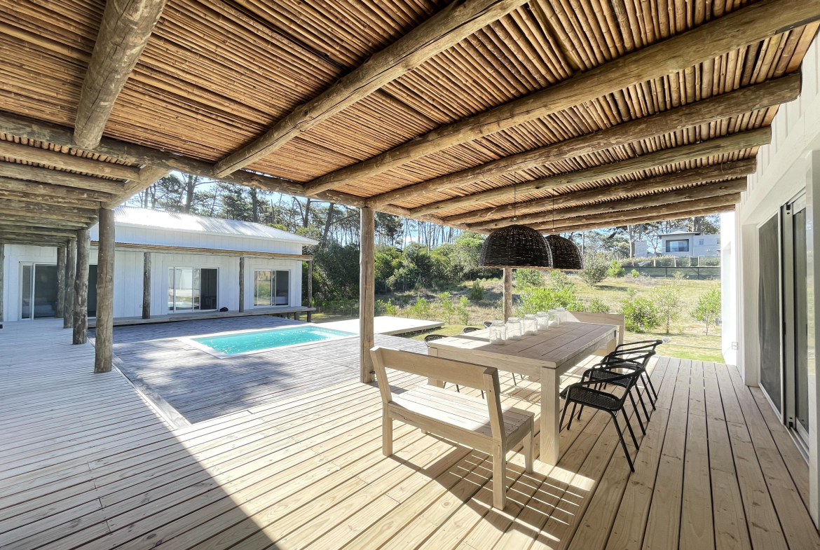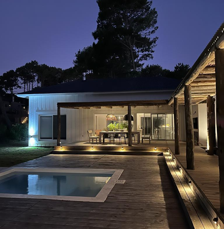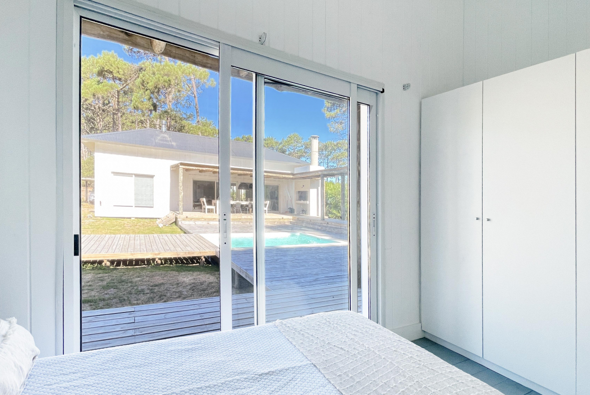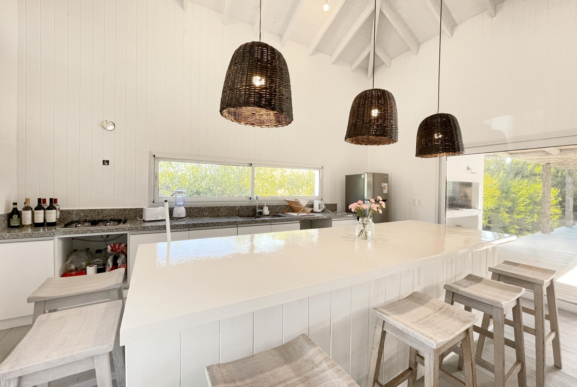 Desarrollada toda en una planta, consta en volumen principal con espacios comunes, toillete y master suite. Espacioso living comedor y cocina integrados con amplios ventanales al deck.