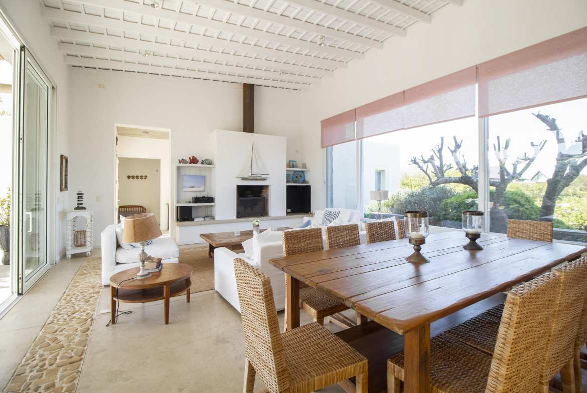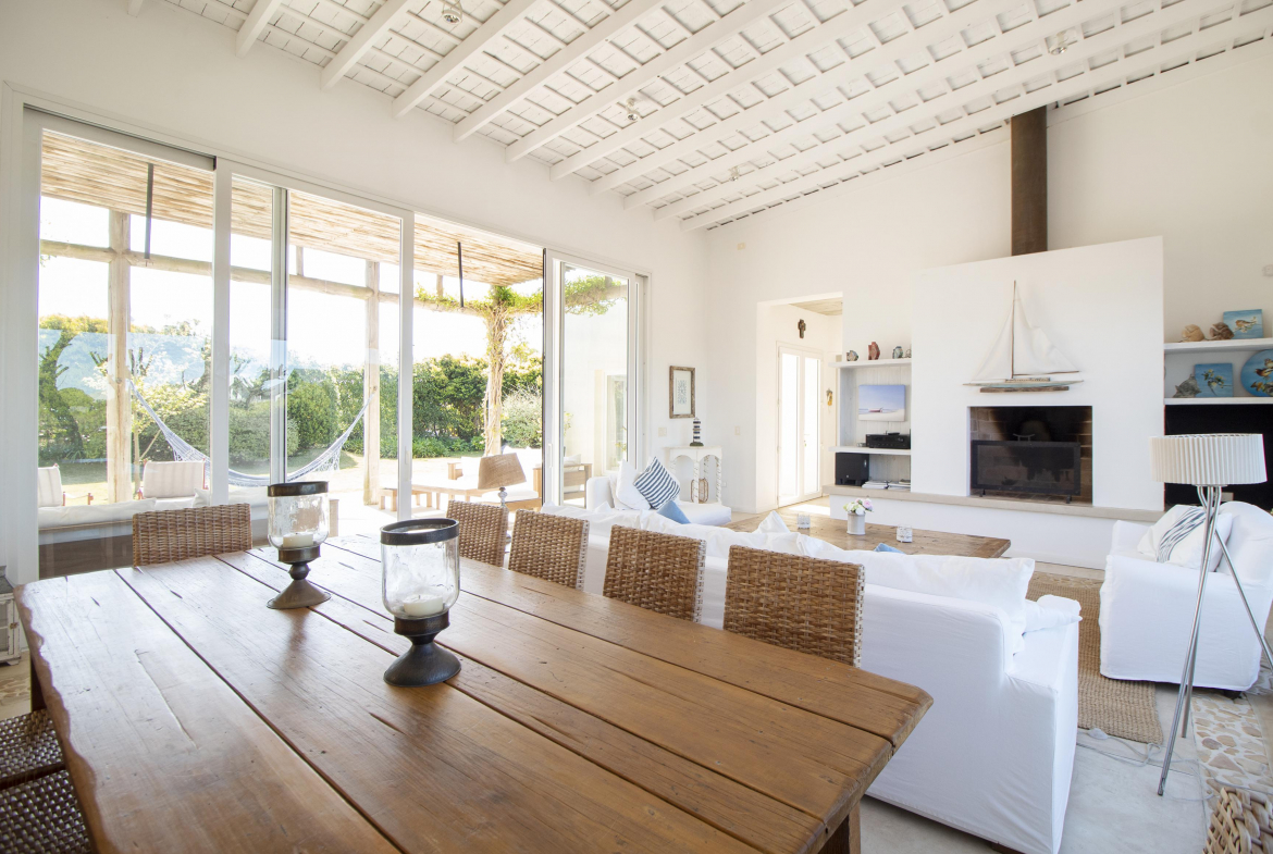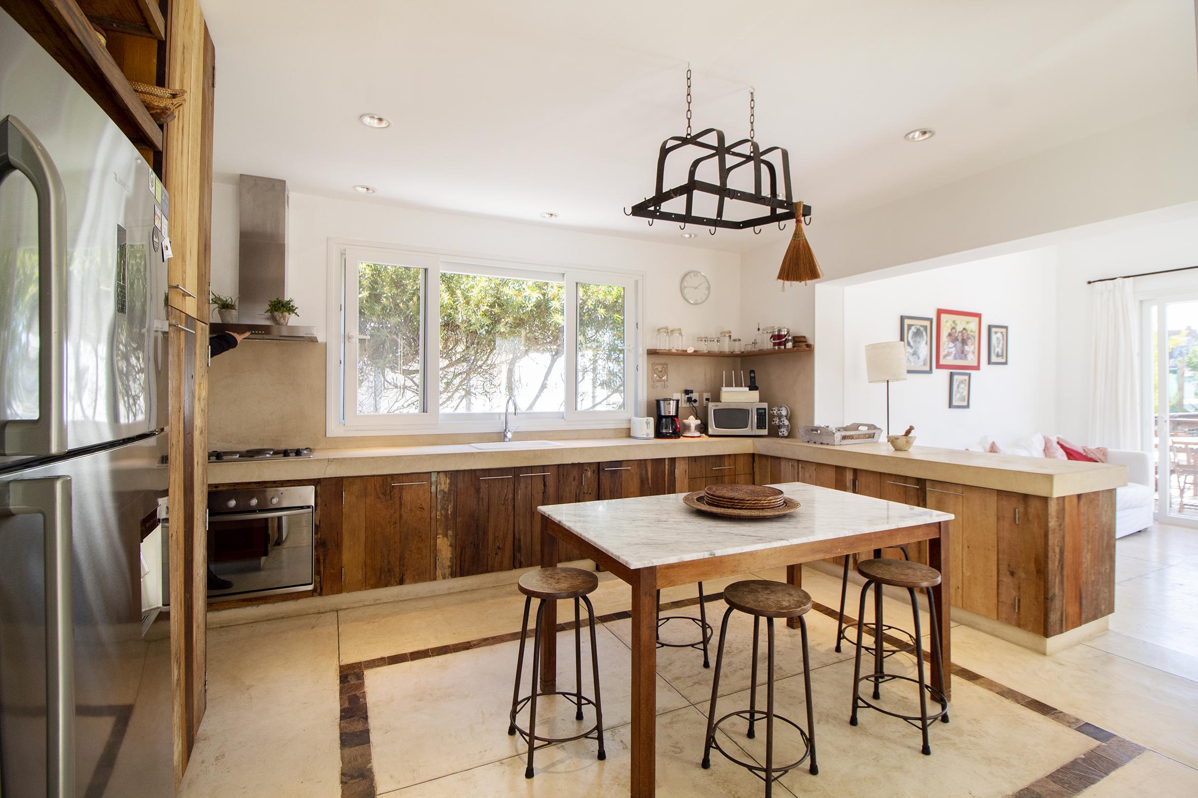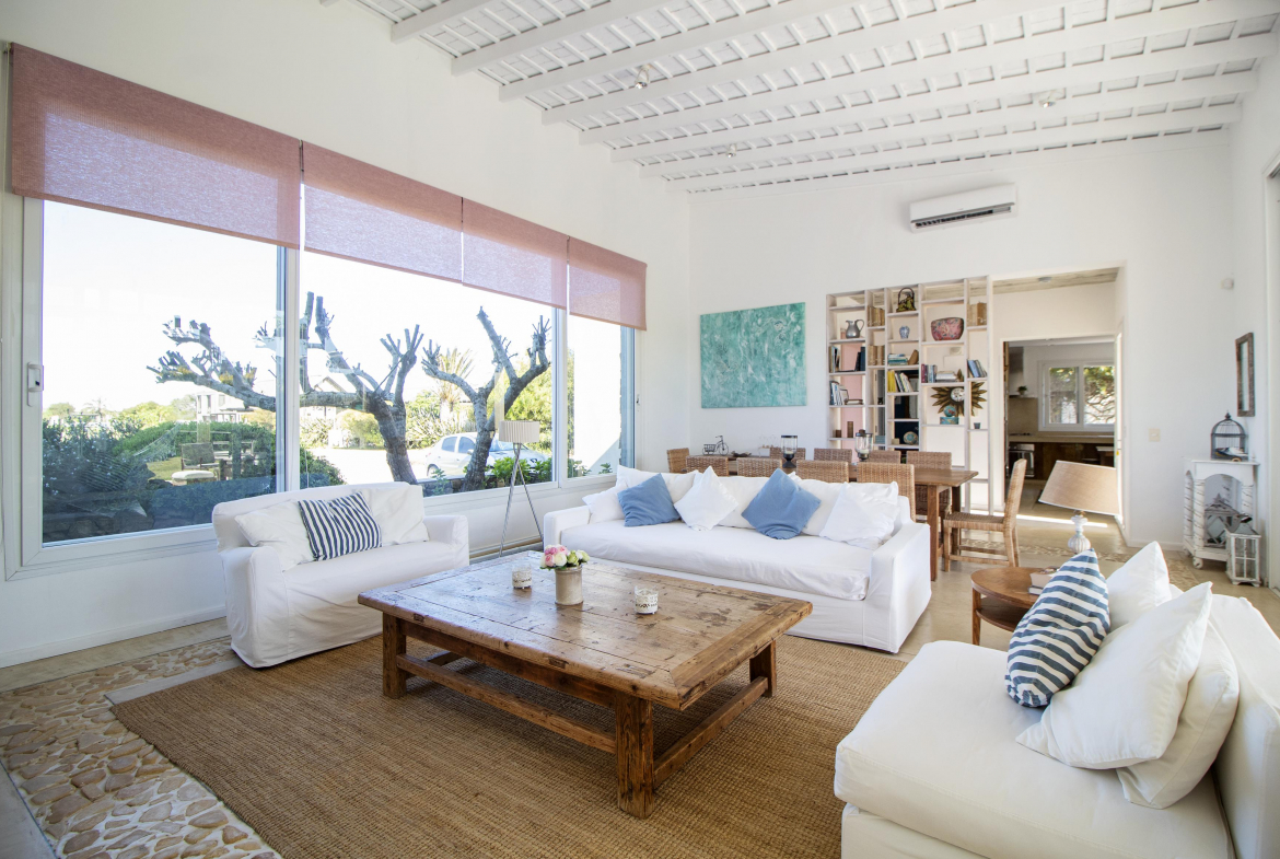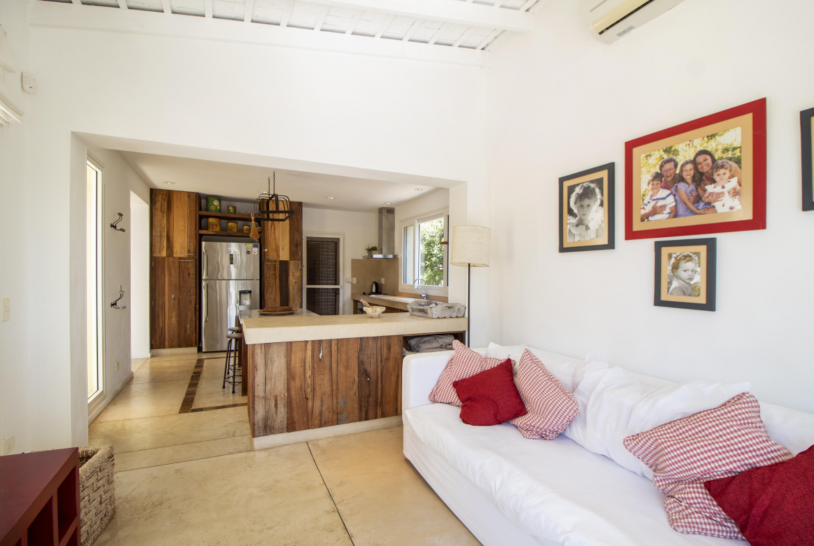 a la izquierda, living comedor con amplios ventanales que conectan la casa con la galeria y el jardin. Toillete. cocina abierta e integrada con barra a una sala de tv.