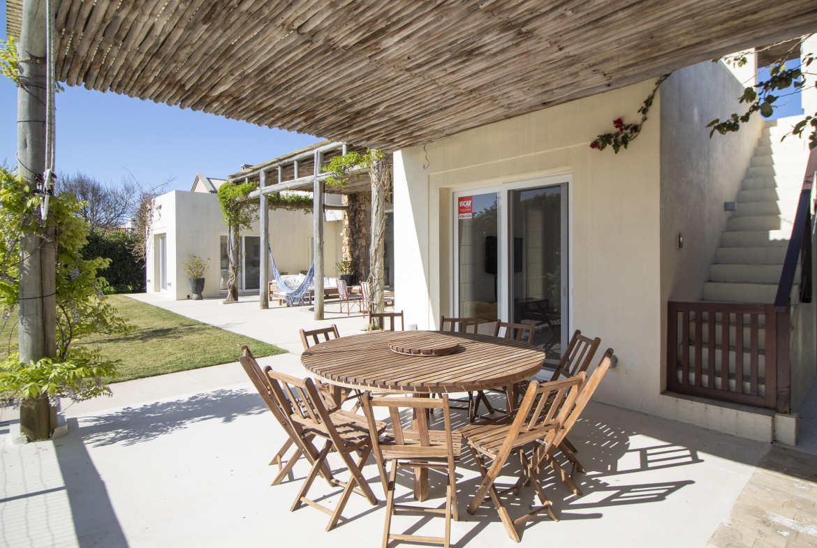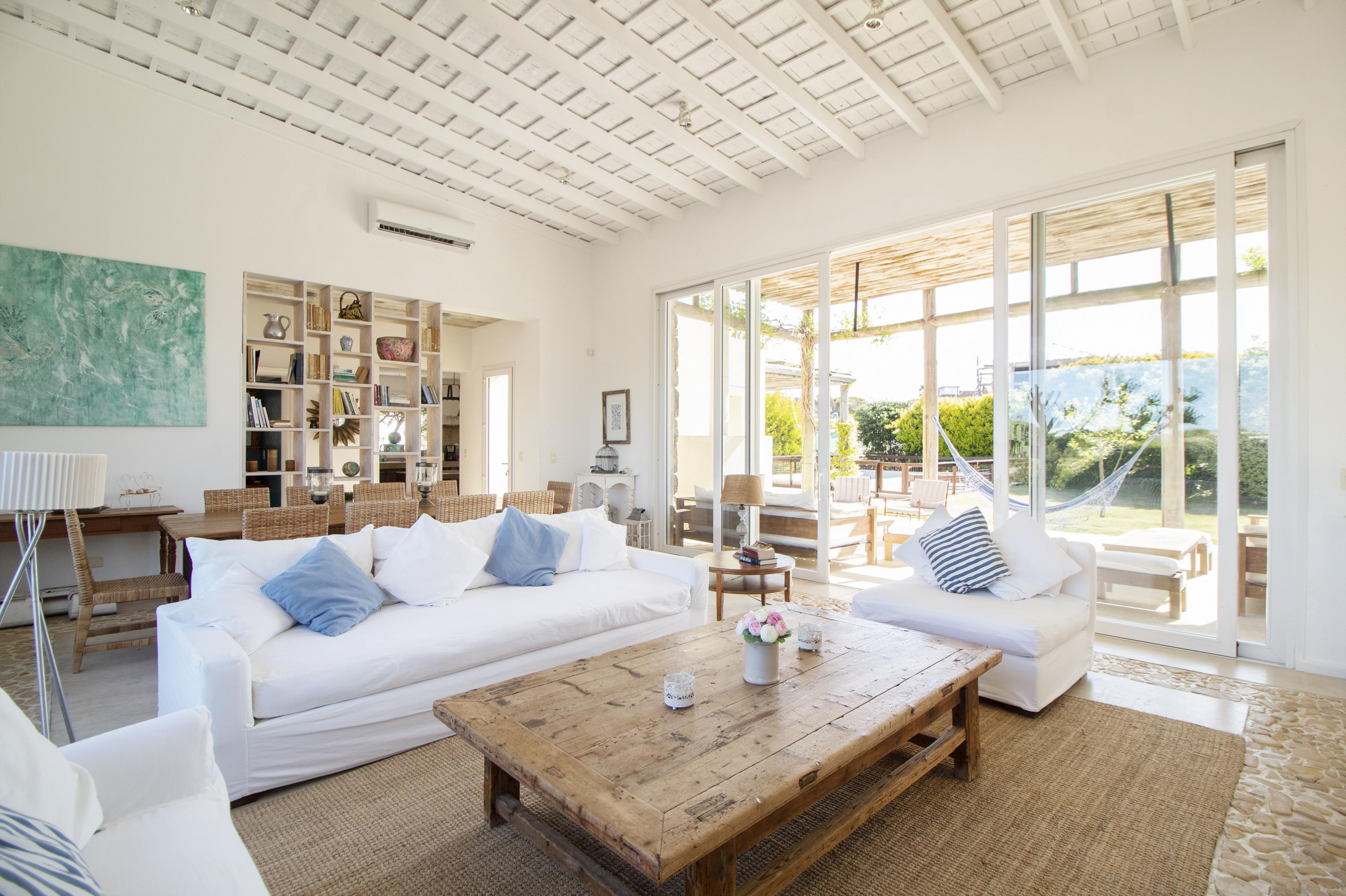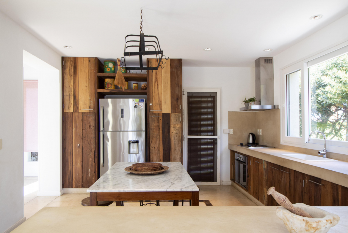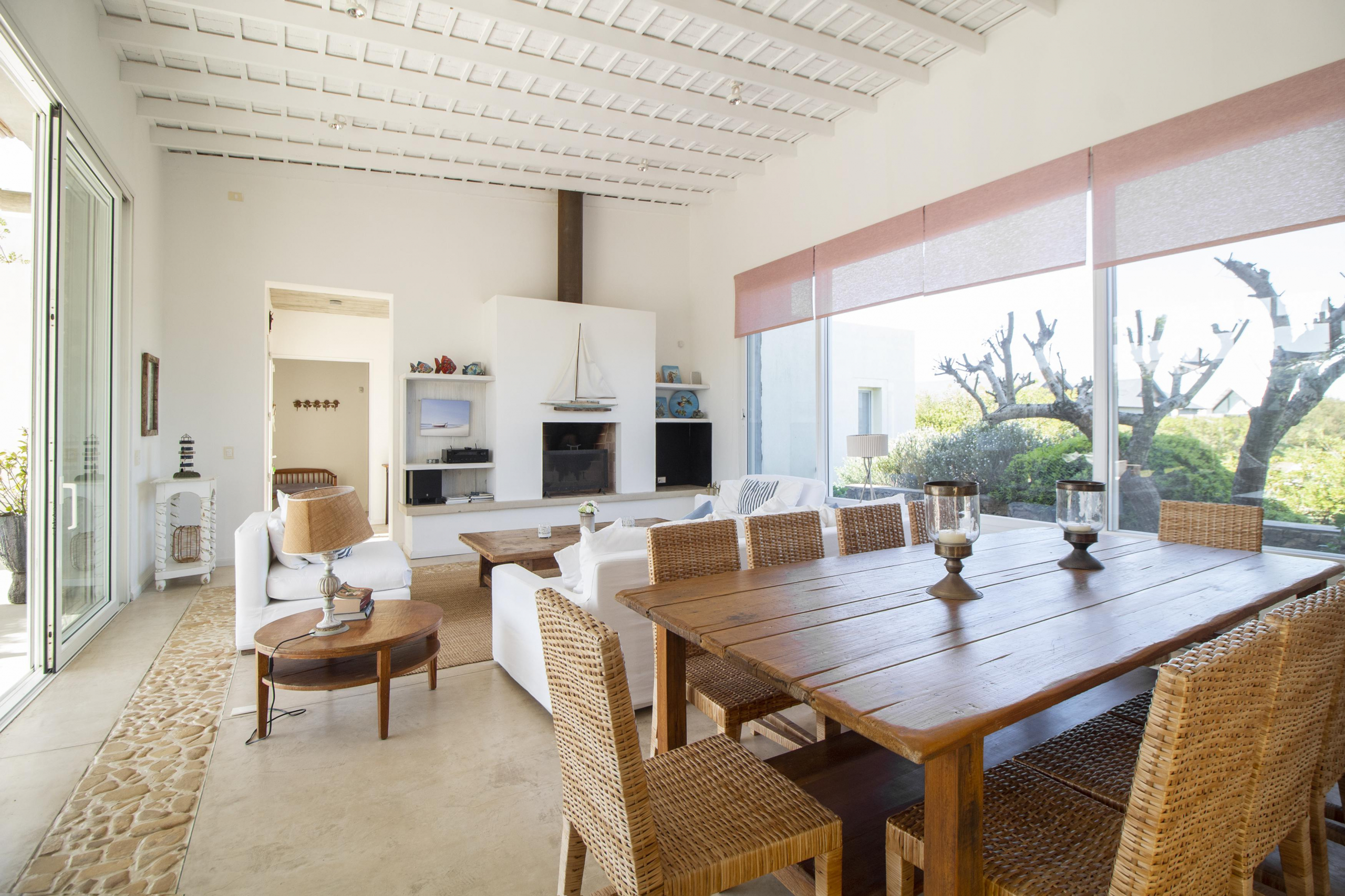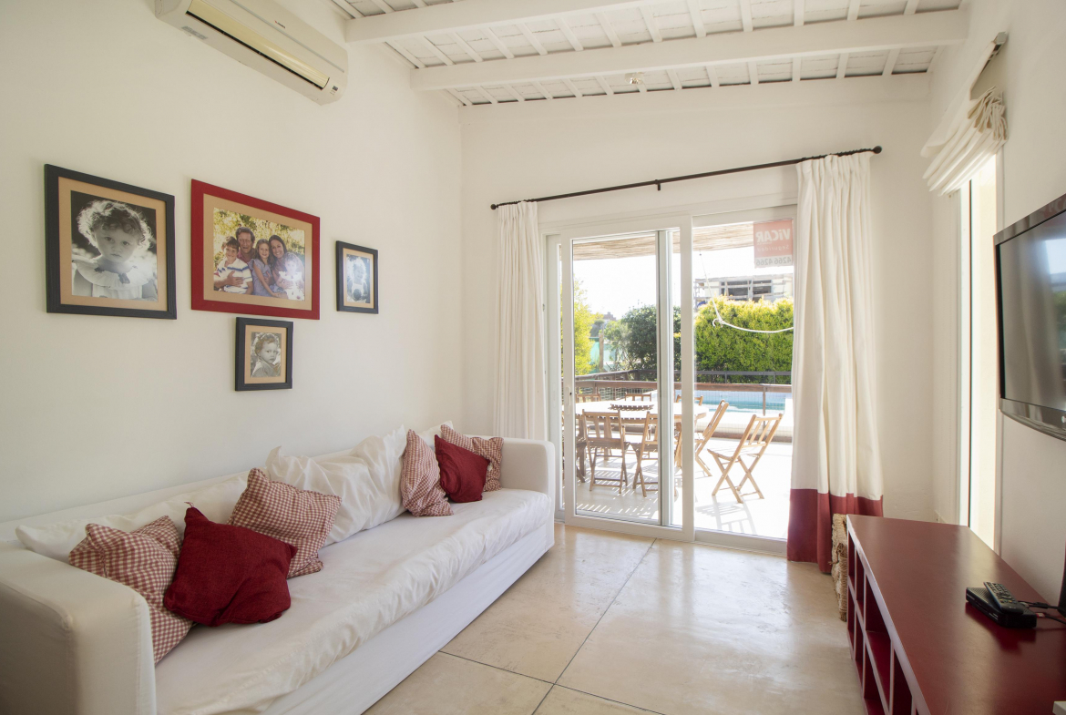 a la izquierda, living comedor con amplios ventanales que conectan la casa con la galeria y el jardin. Toillete. cocina abierta e integrada con barra a una sala de tv.