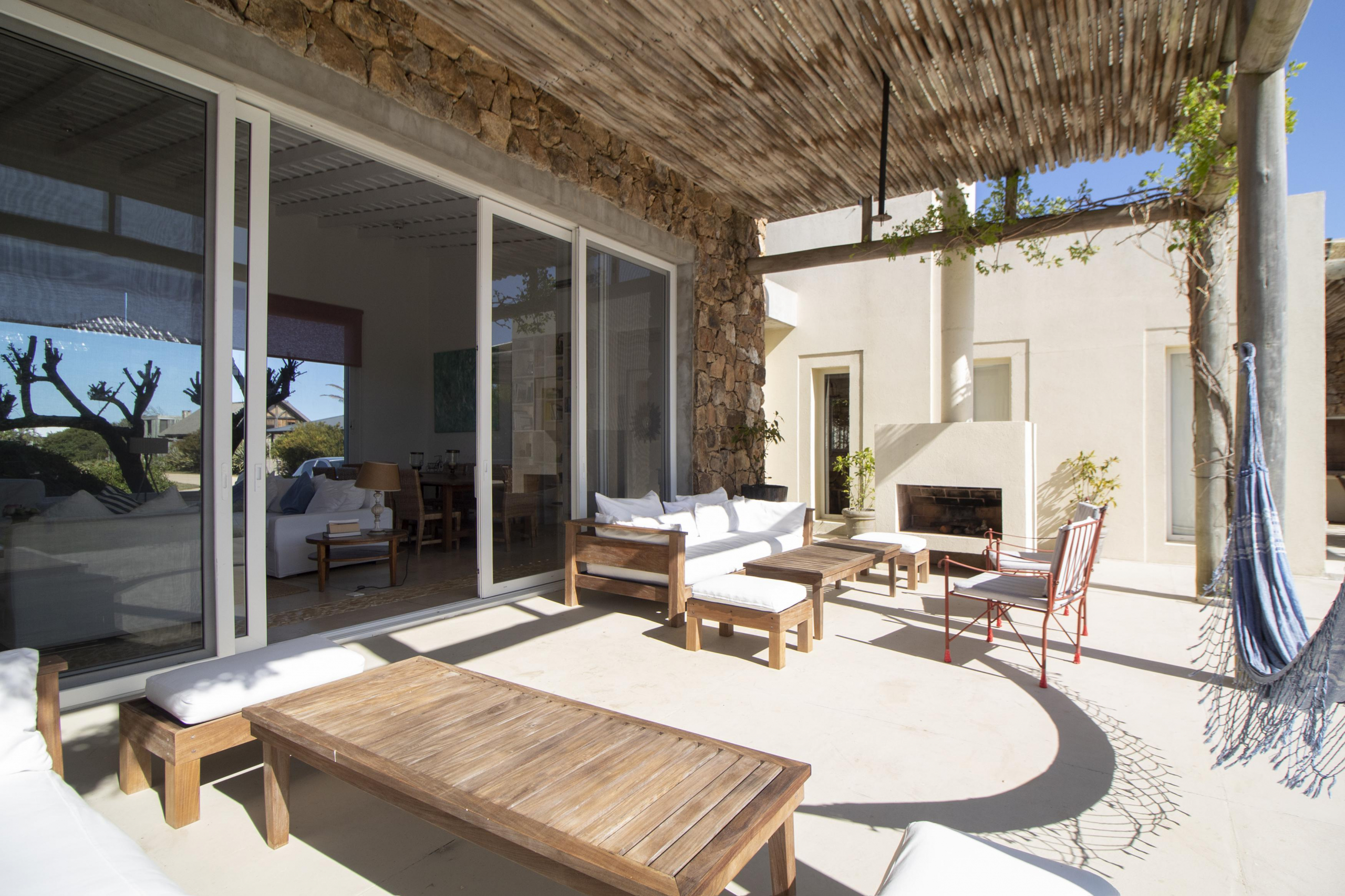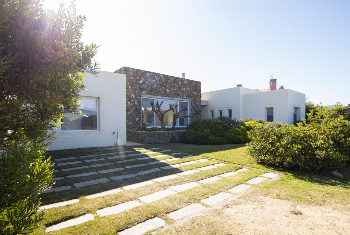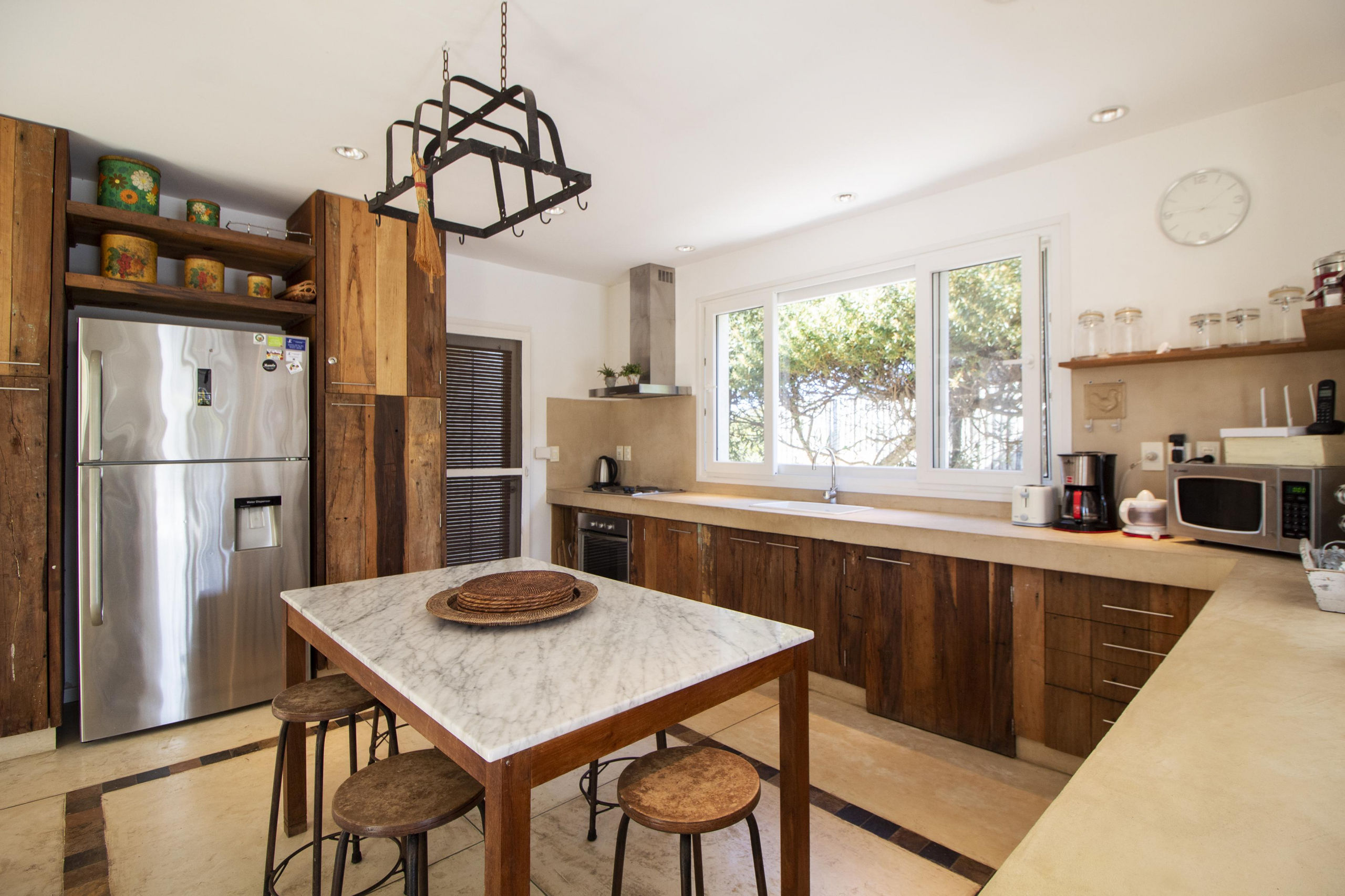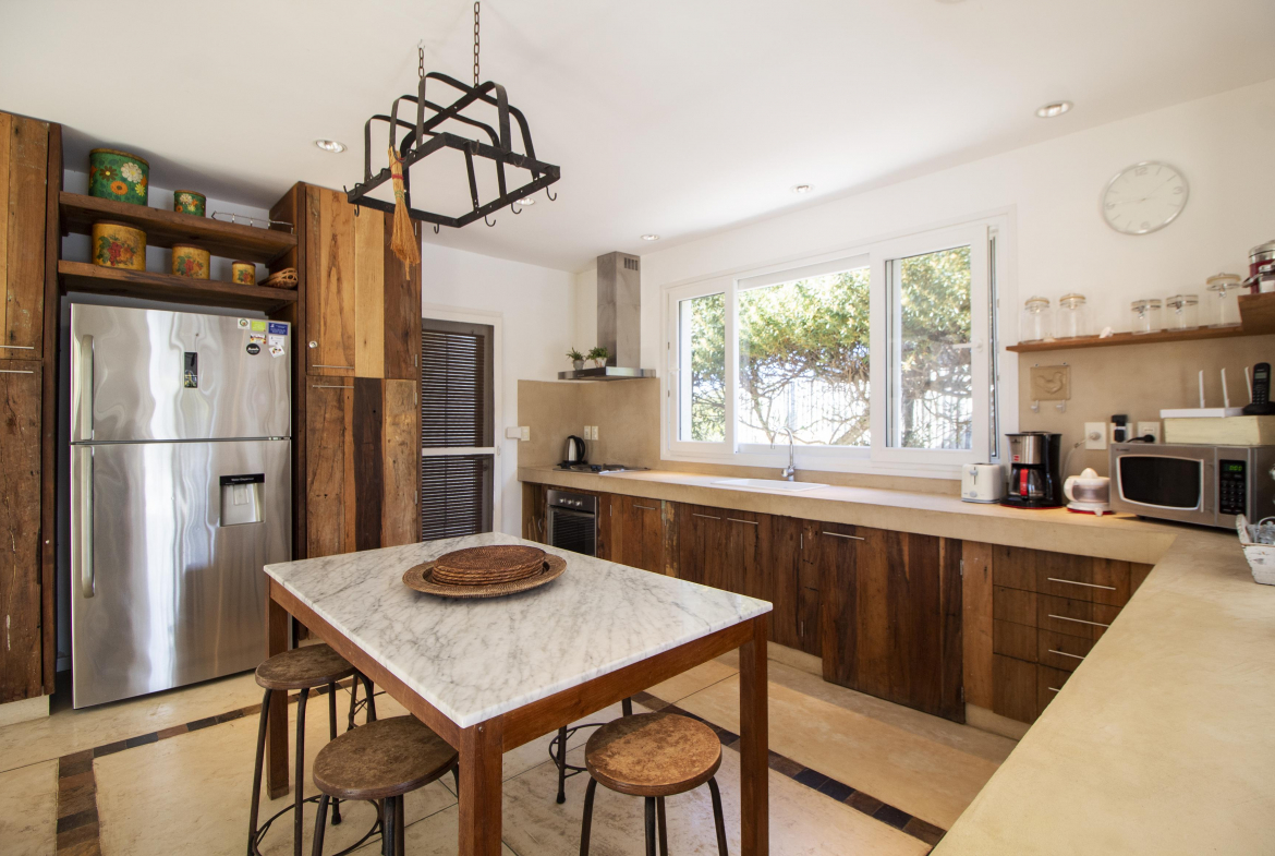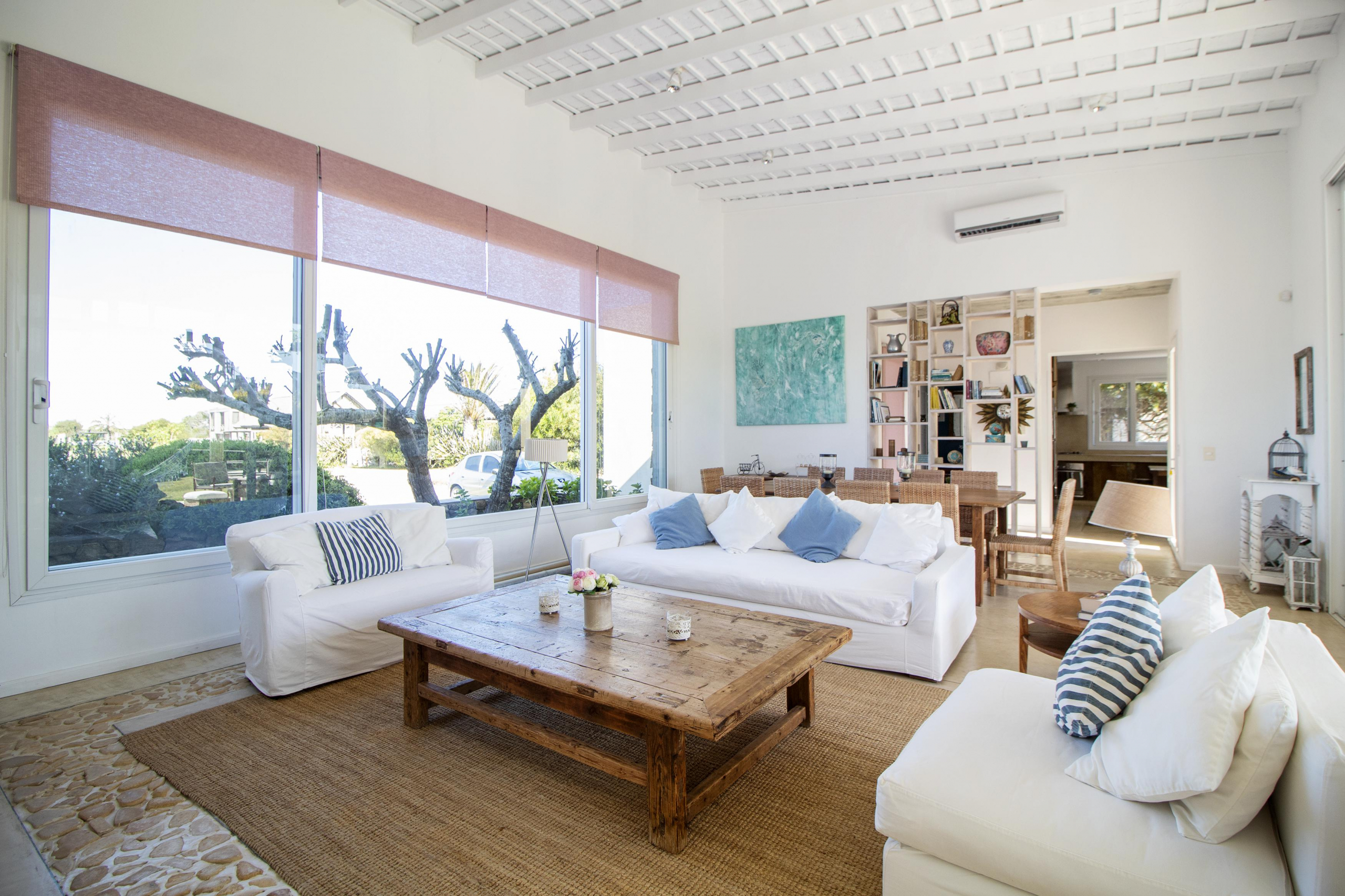 a la izquierda, living comedor con amplios ventanales que conectan la casa con la galeria y el jardin. Toillete. cocina abierta e integrada con barra a una sala de tv.