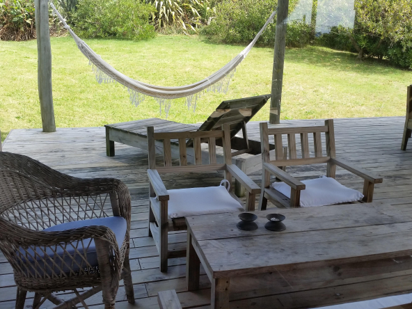 Casa de solida construcción y clásica de José Ignacio. Ubicada a pasos de la playa brava y con una linda vista hacia esta, encontramos esta casa de tres dormitorios, uno de ellos en suite. El estar principal cuenta con un lindo living de buena capacidad con salida a terraza y parrillero. El comedor integrado se encuentra a continuación de la cocina separado por un pasa plato o barra. En el exterior sobre un amplio deck, la casa nos brinda un muy buen parrillero con mesas y bancos.