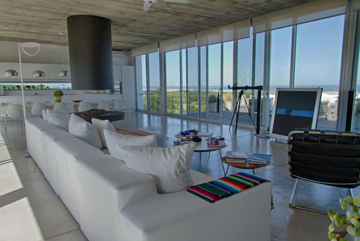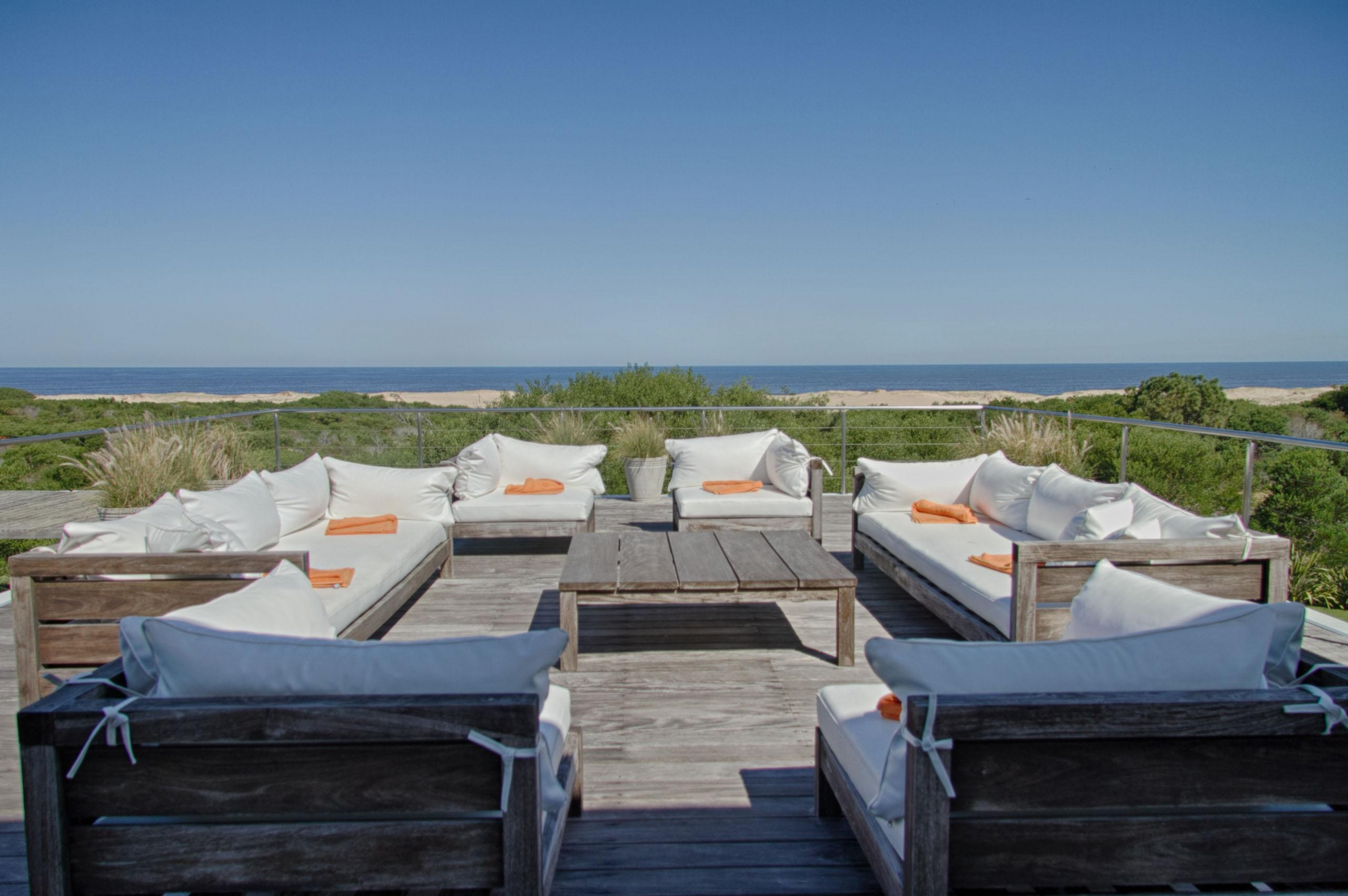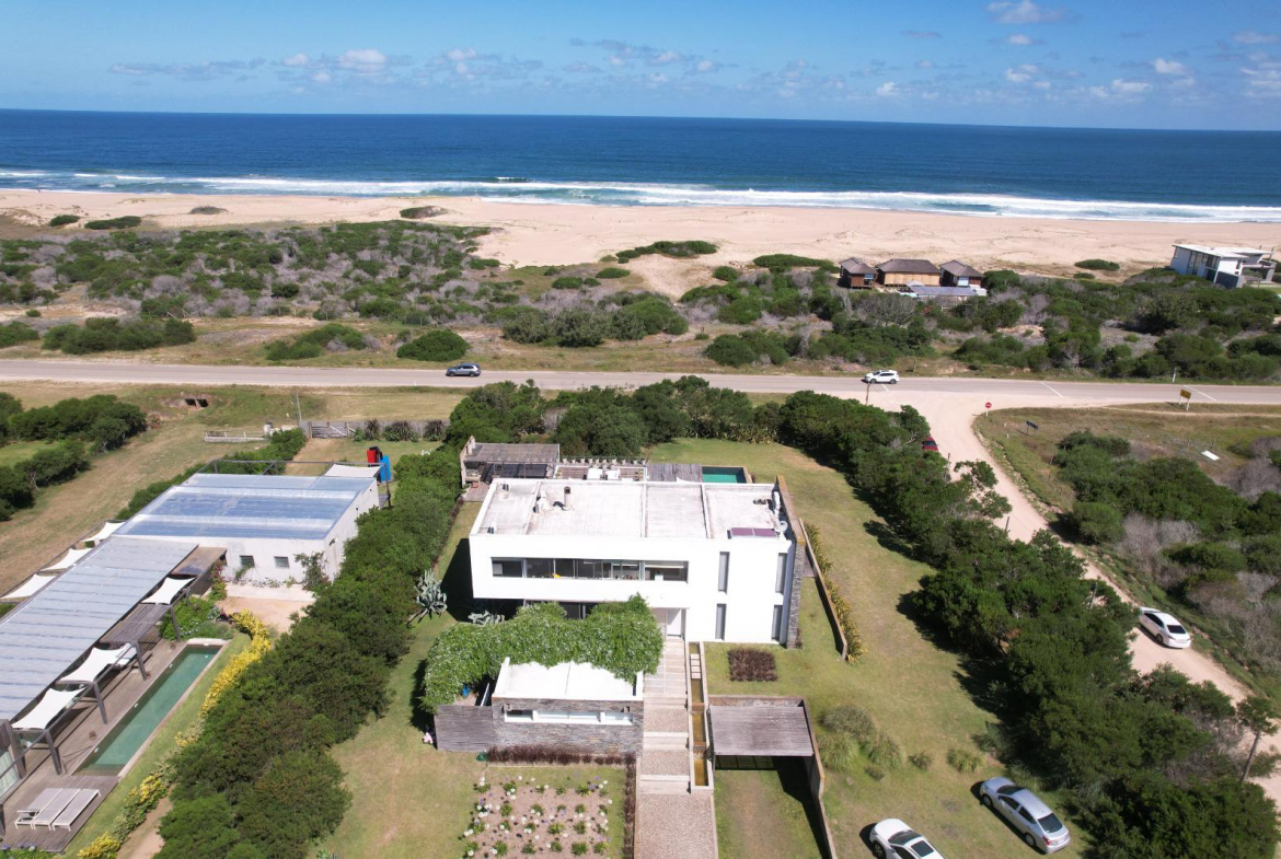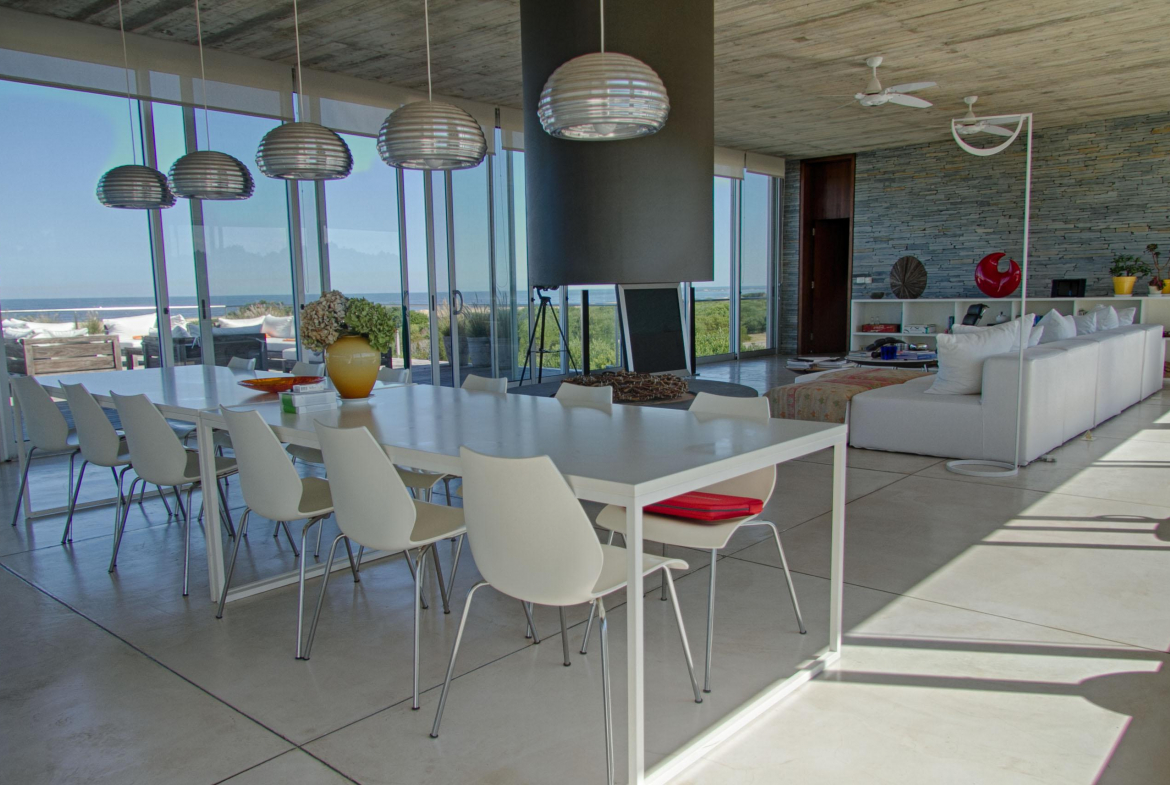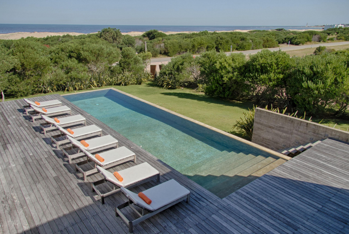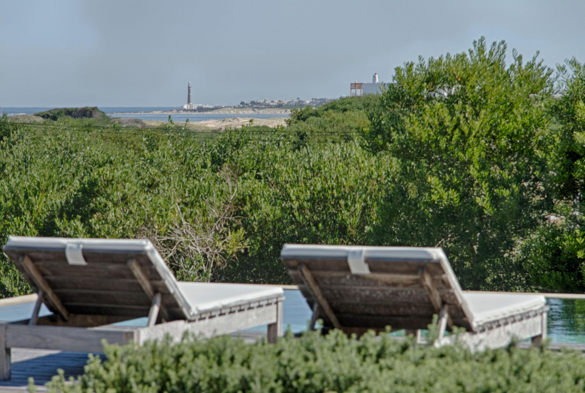 Cuenta de 4 dormitorios en suite amplios y cómodos dos en planta baja y dos en planta alta. Recepción con estudio y salida a deck y piscina. Area común en planta alta vidriada con vista al mar y al faro panorámica. Confortable living, comedor con mucha capacidad y buena cocina. Salida a deck exterior con varios sillones.