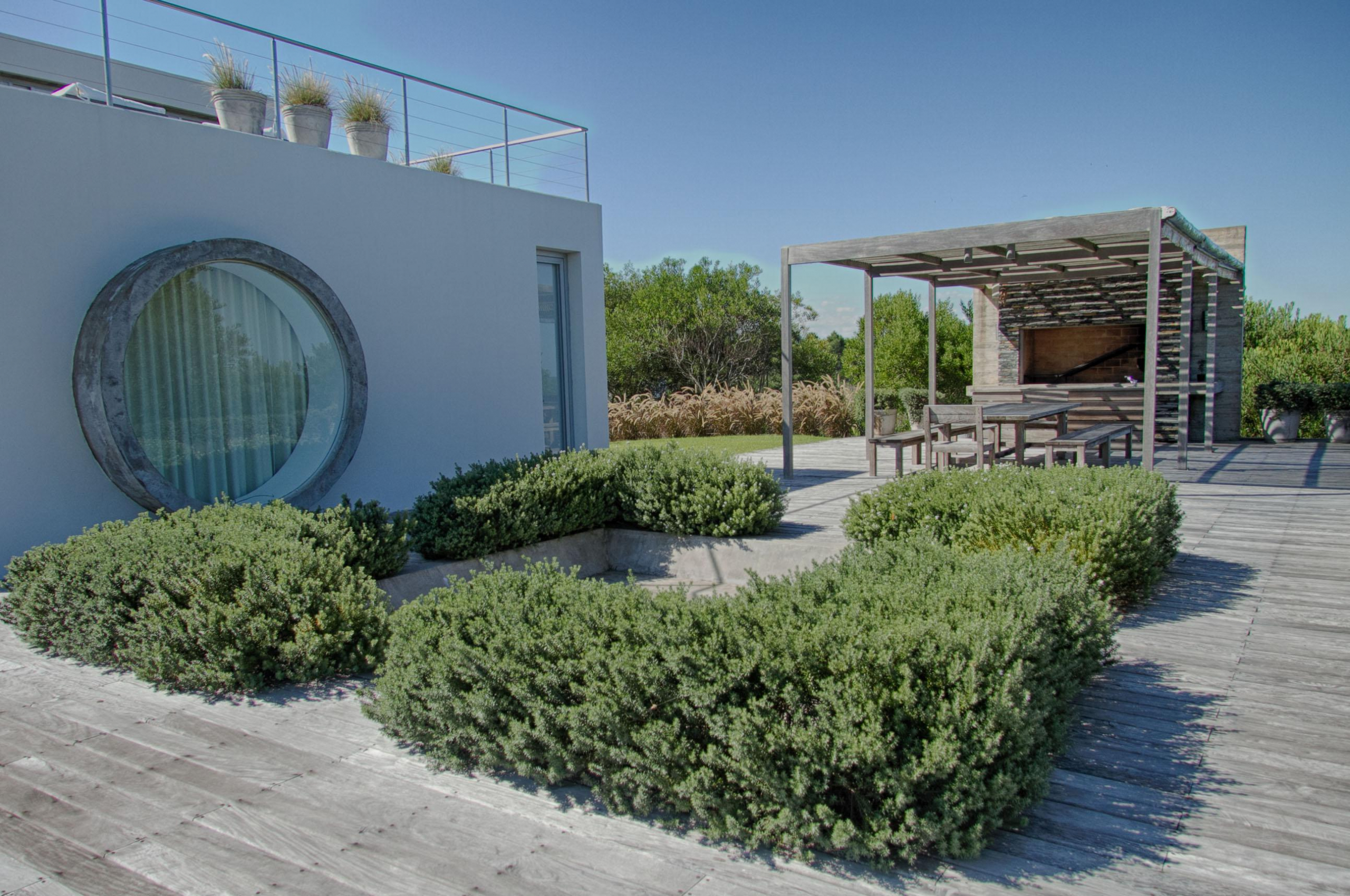 Exterior con una gran piscina fogón y parrillero más un amplio y privado jardín compuesto de arbustos y esculturas de gran porte. Dormitorio de servicio independiente y garaje con acceso interior.