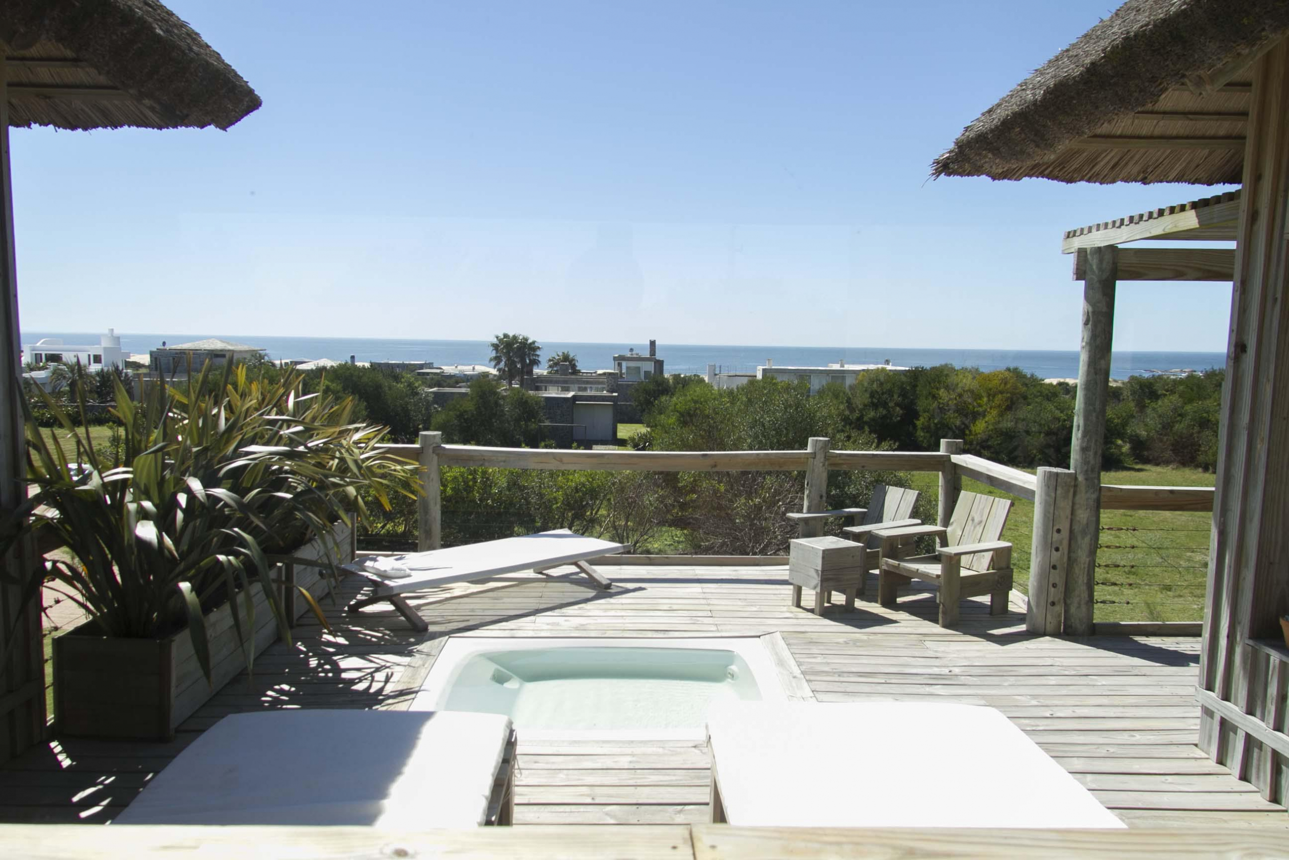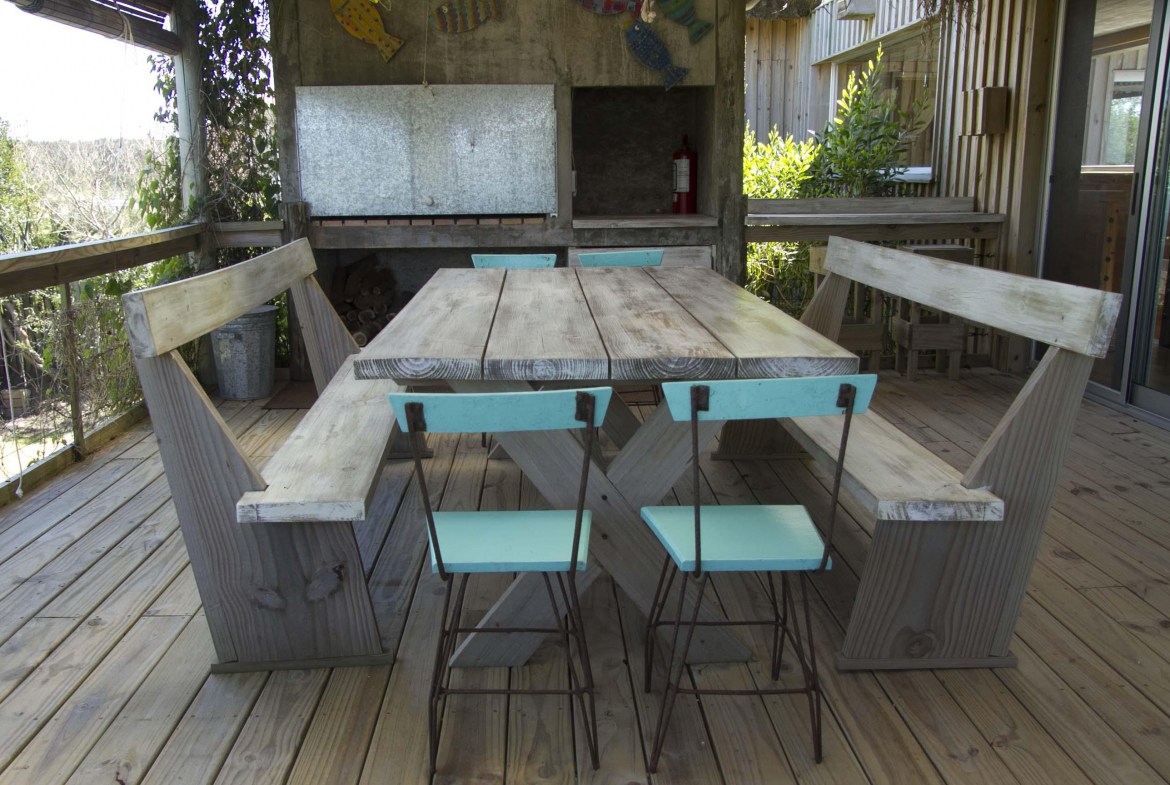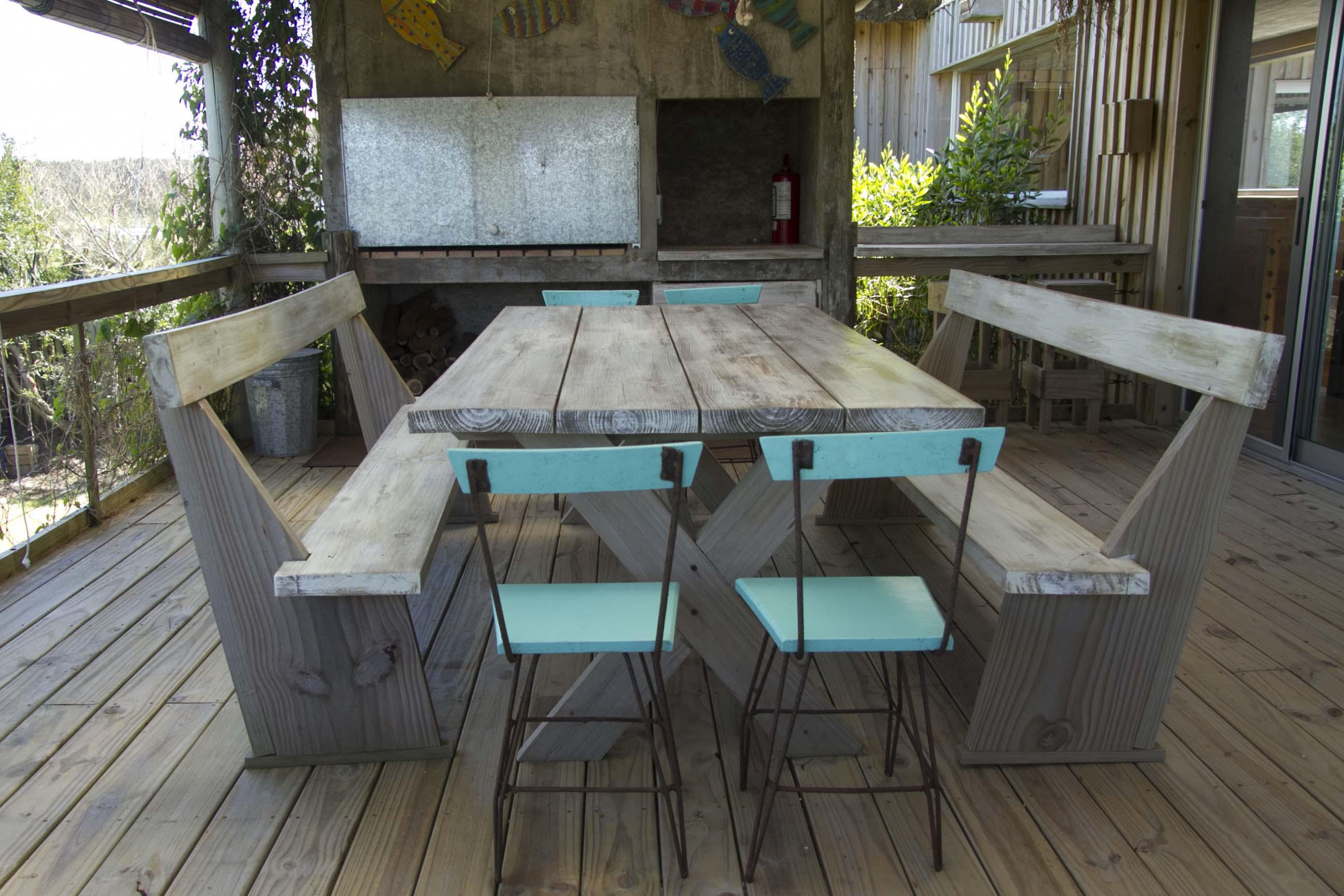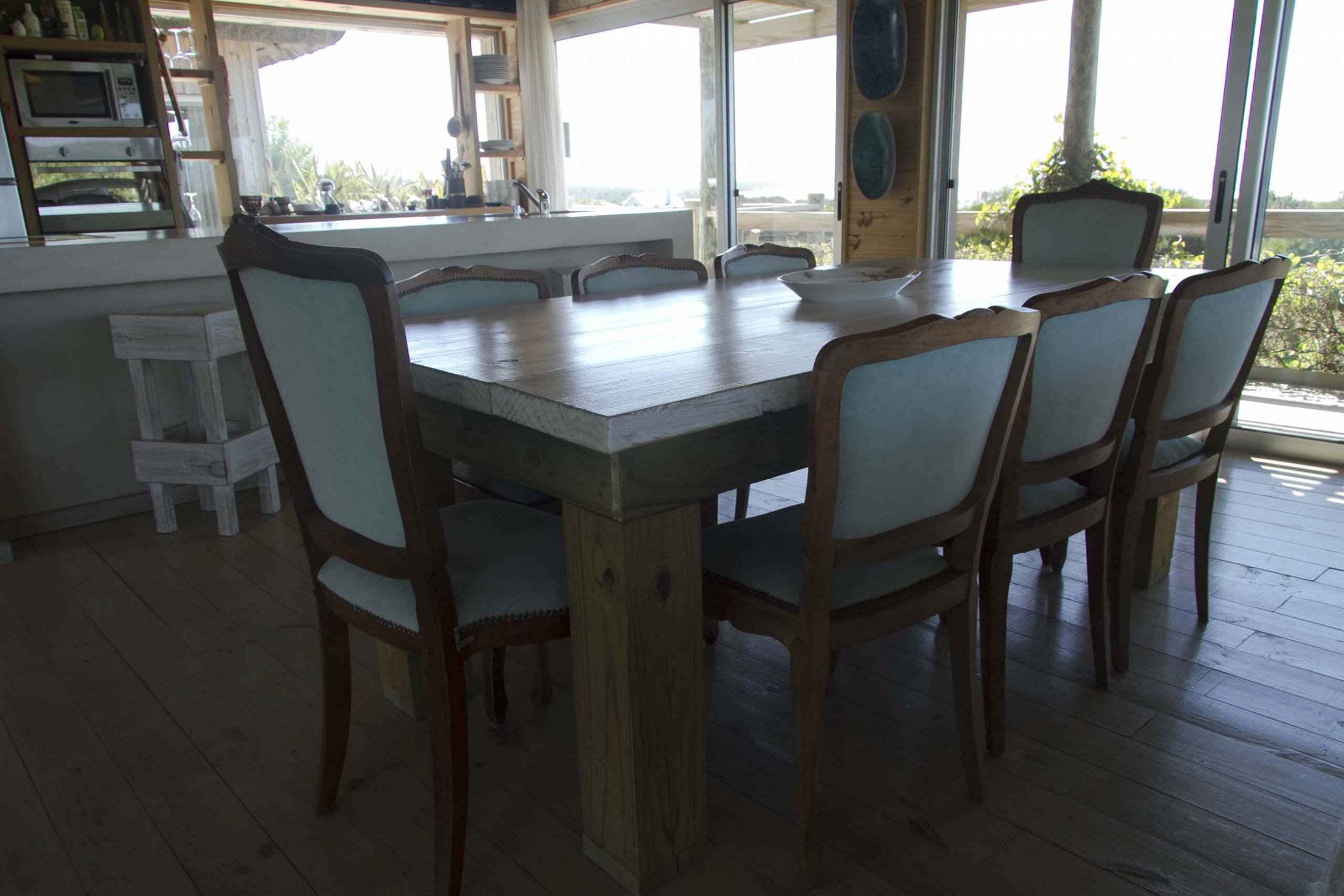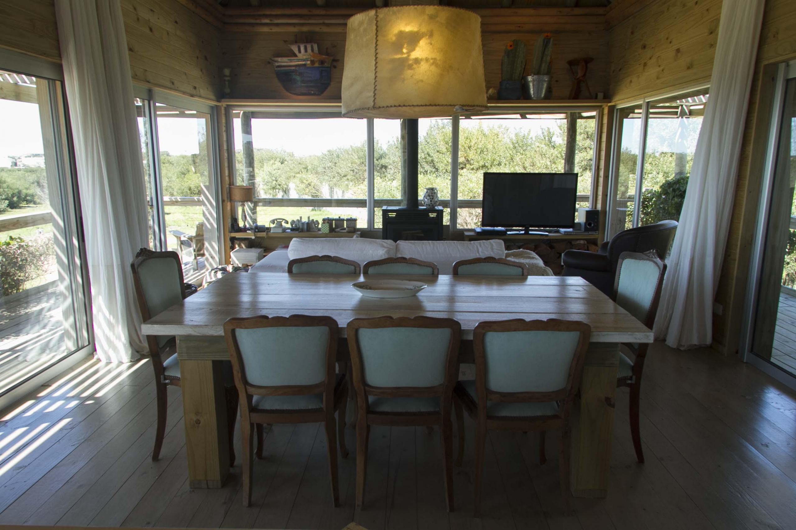 Área social en planta alta integra living, comedor y cocina todos los ambientes con vista y salida a deck con jacuzzi y parrillero con cómoda mesa y bancos.