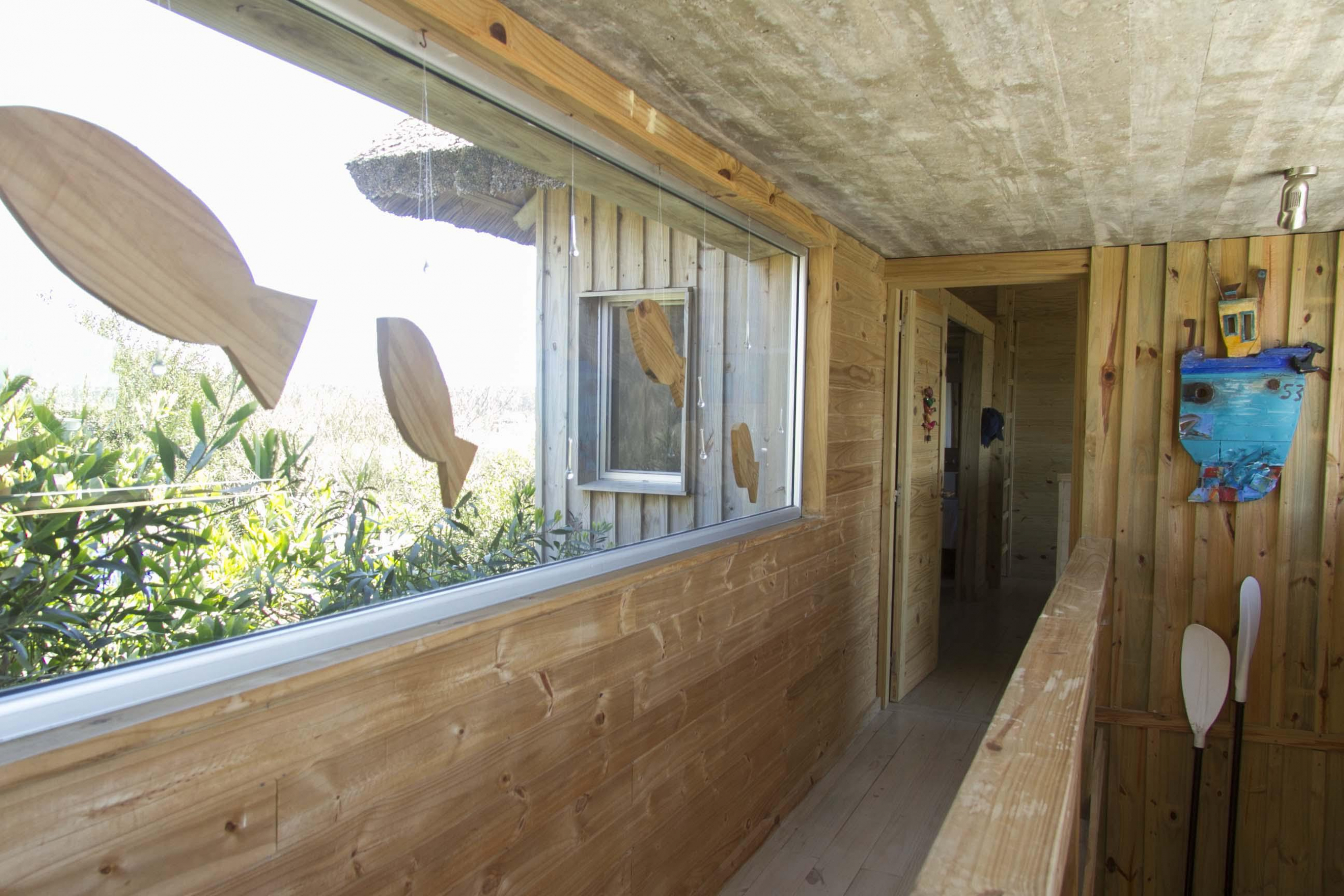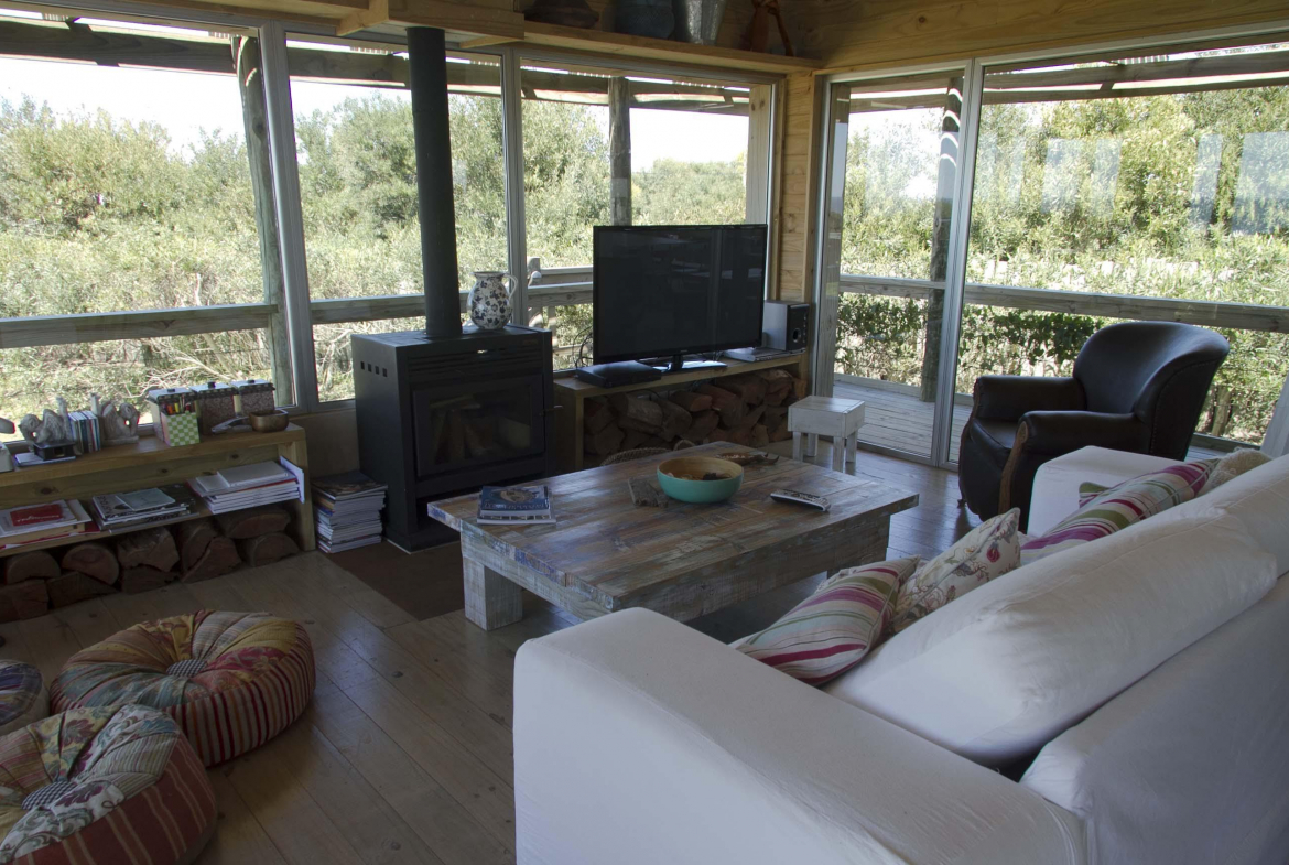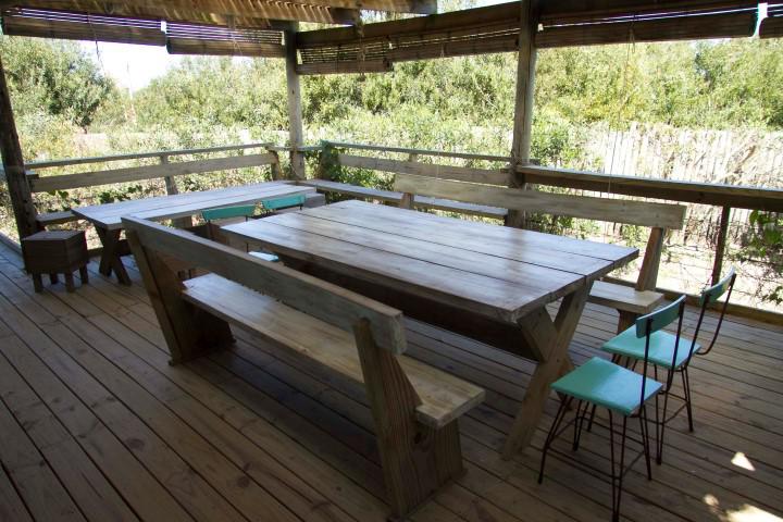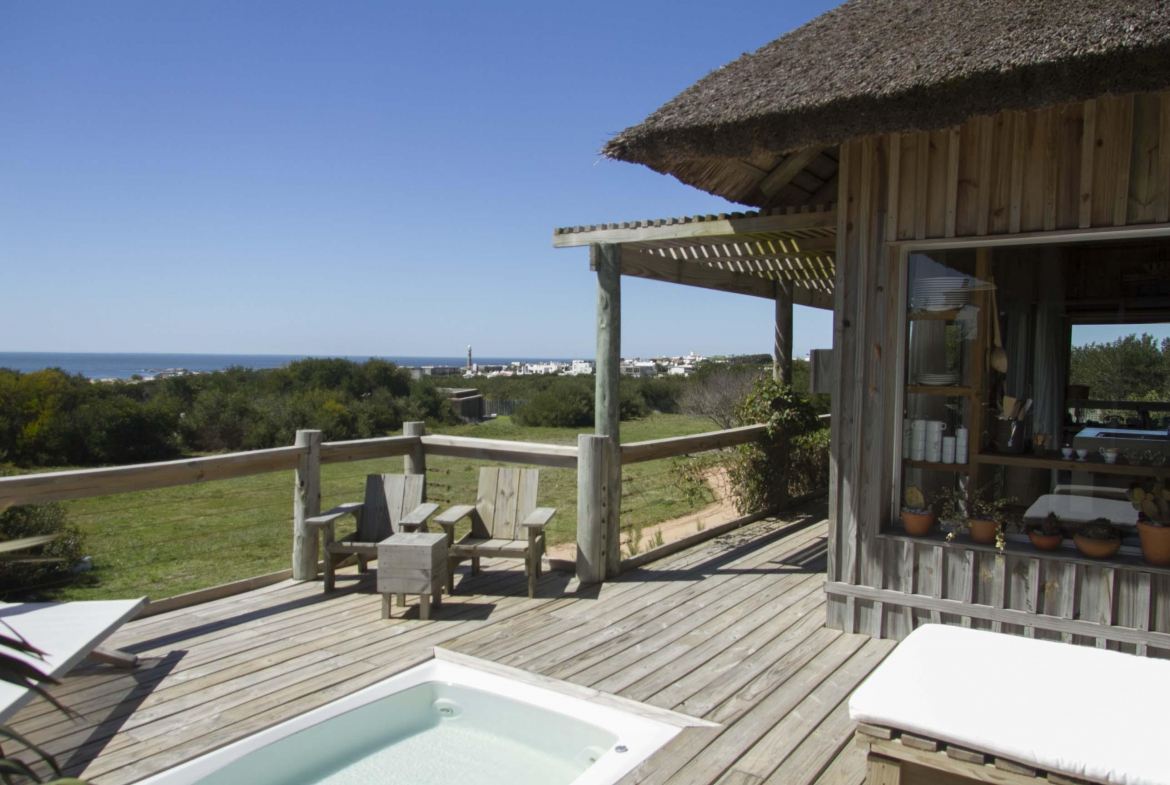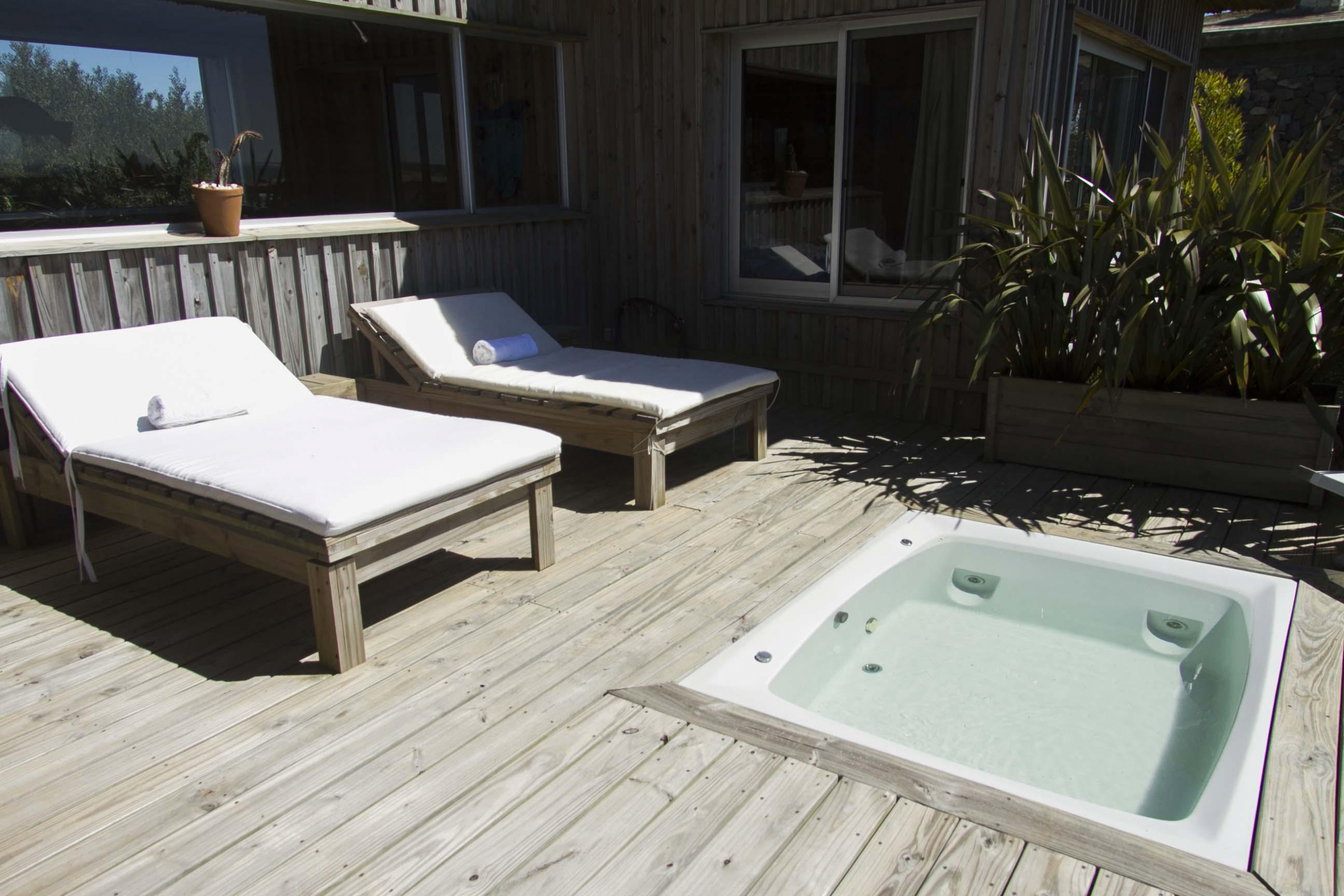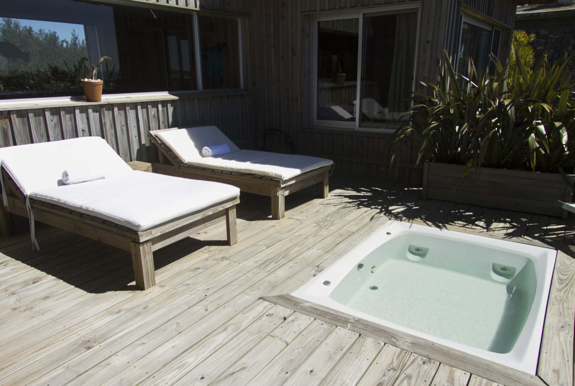 Área social en planta alta integra living, comedor y cocina todos los ambientes con vista y salida a deck con jacuzzi y parrillero con cómoda mesa y bancos.