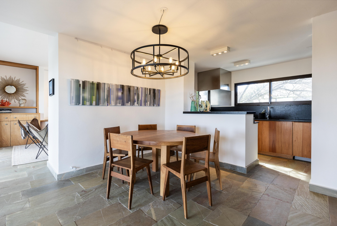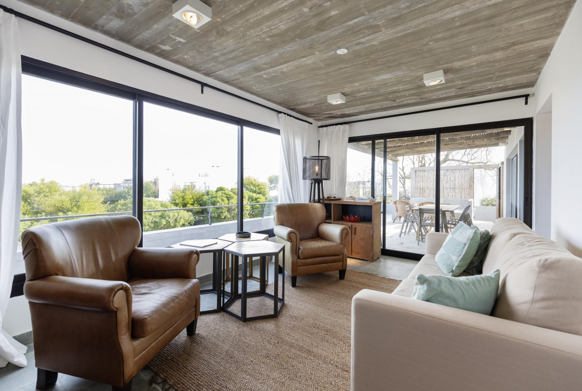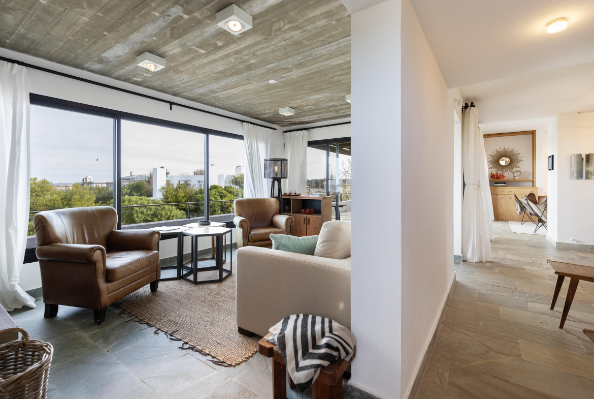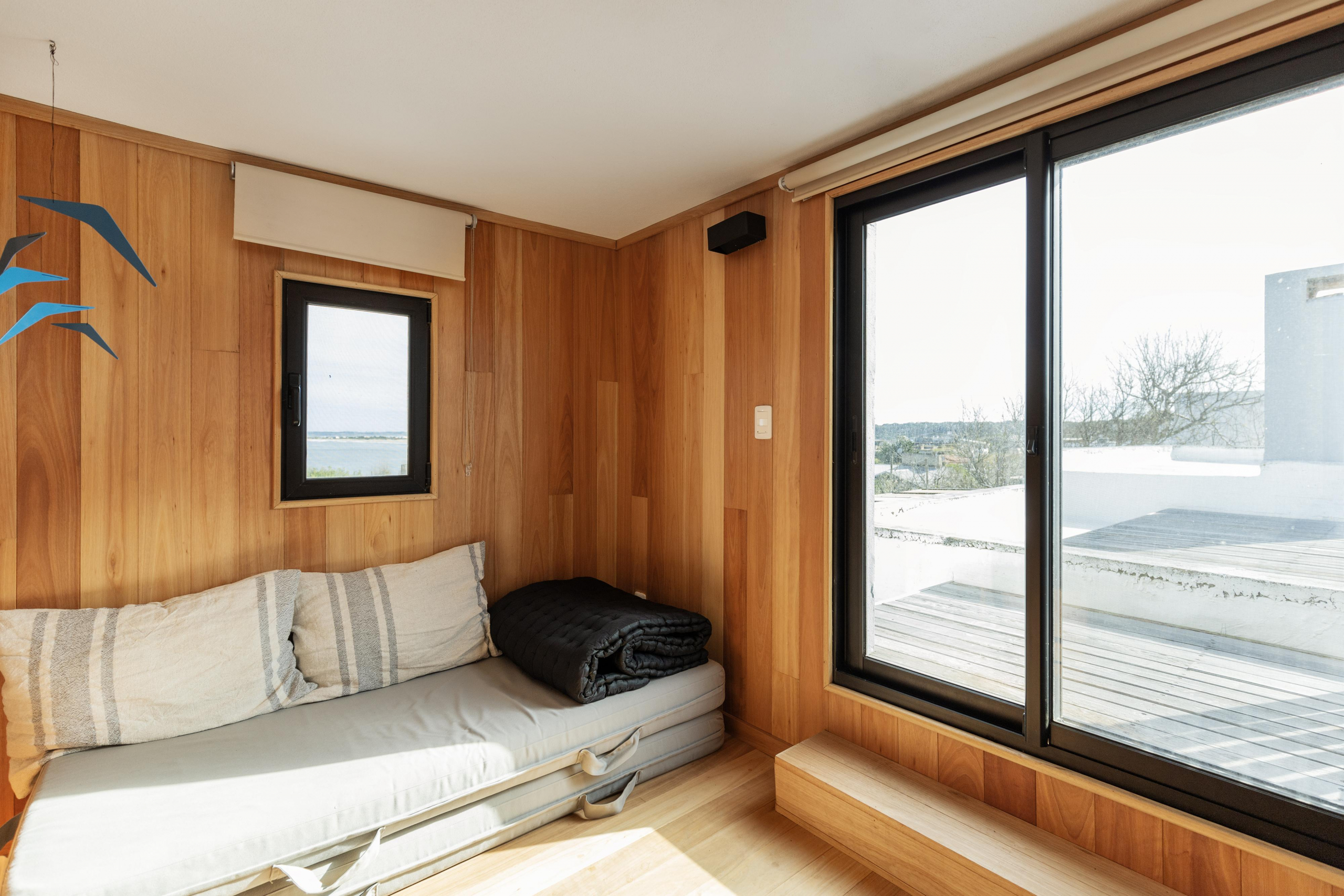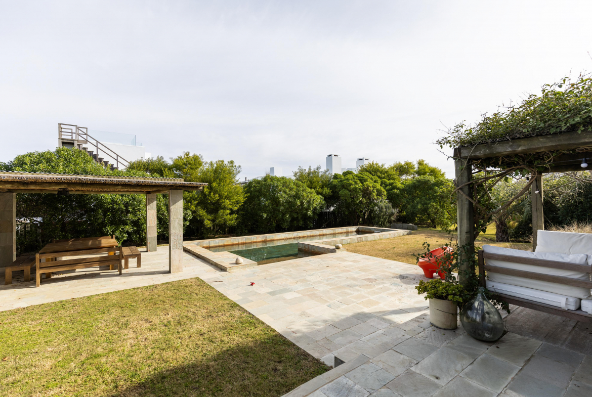 Dos dormitorios en semi suite, master suite y dependencia o dormitorio pequeño de huespedes. Arriba, living, ccina comedor y living con rincon para la tele. Galeria cubierta, con mesa exterior, con vista a la mansa. Escalera que conecta por el exterior al jardin y la piscina. Intima y acogedora casa, totalmente cercada.