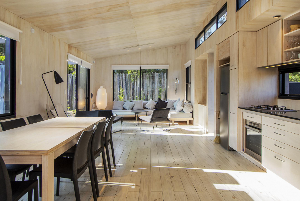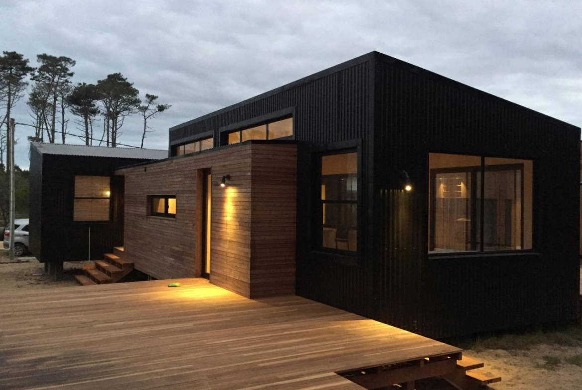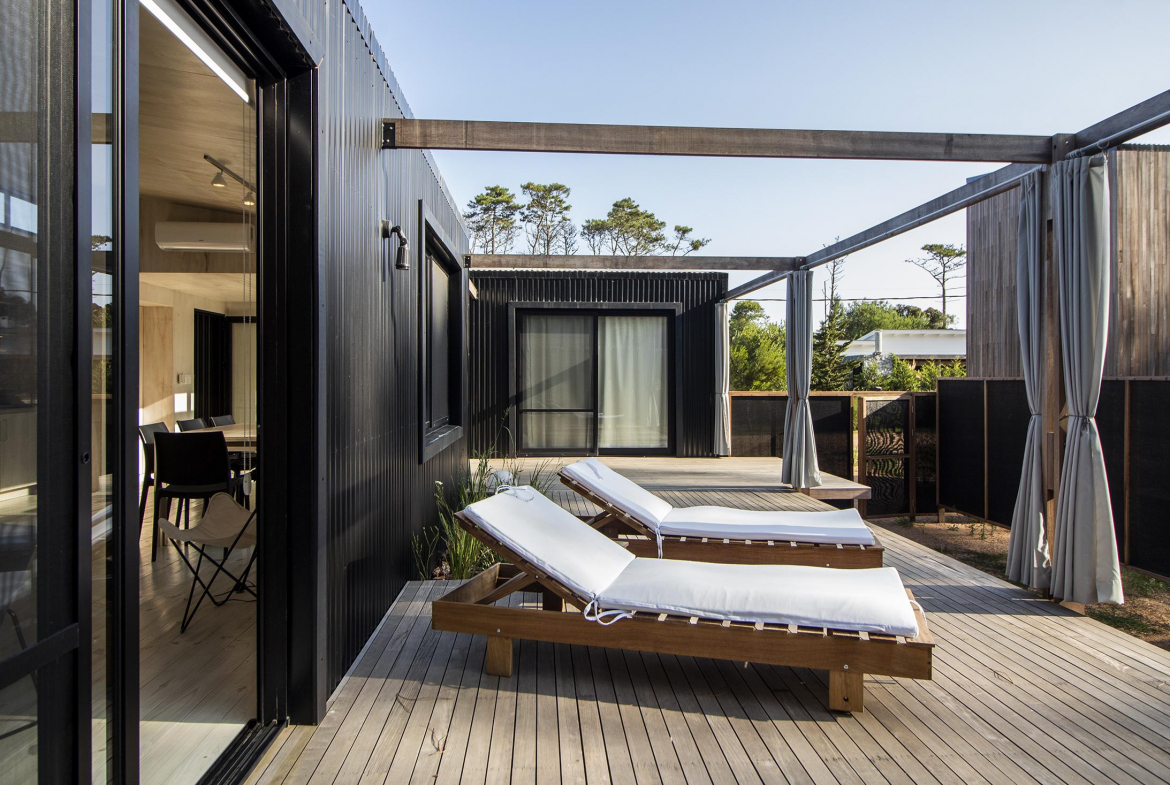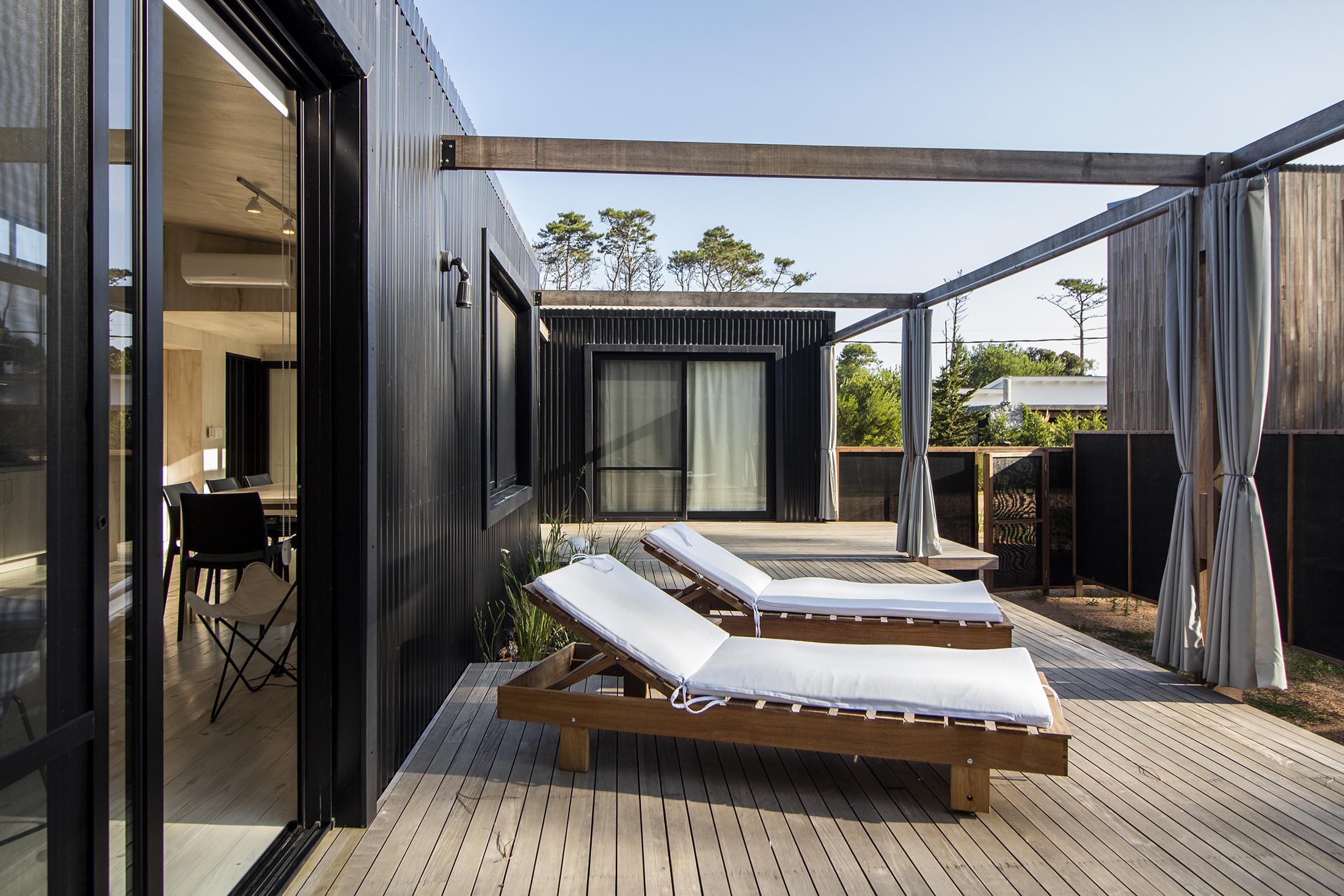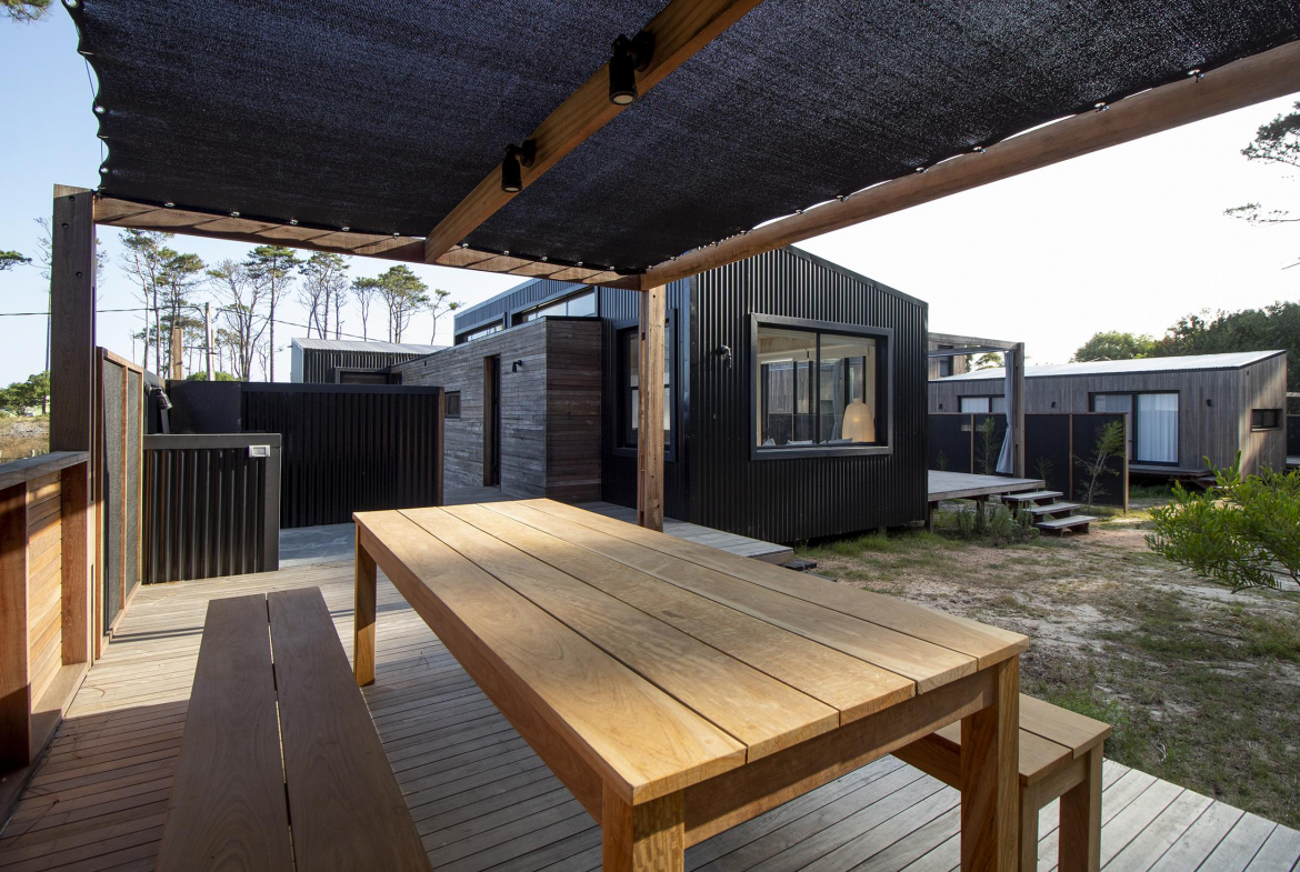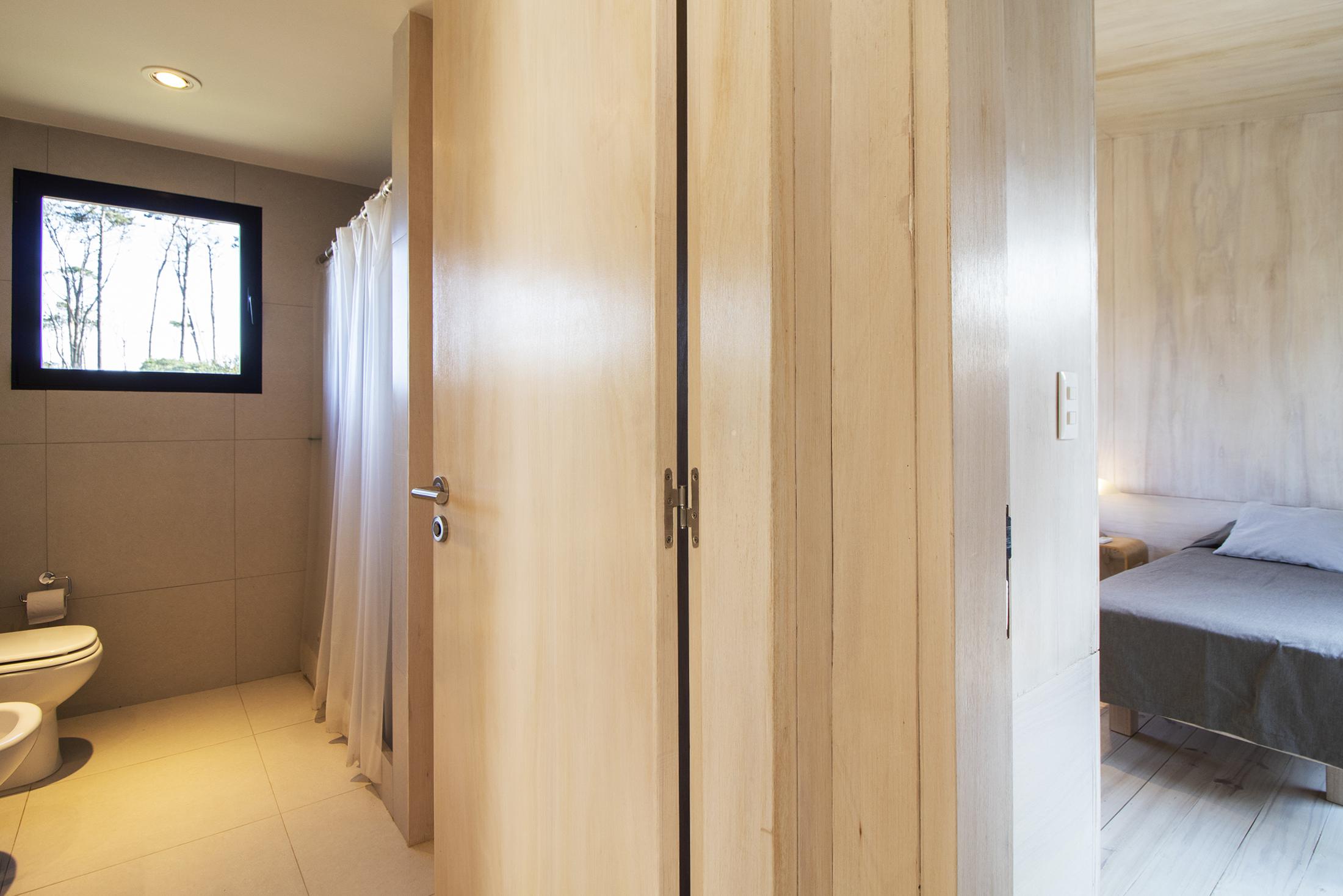 Dos dormitorios comodos con dos baños, living comedor integrado, con amplios ventanales que conectan el deck con los espacios de uso comun.