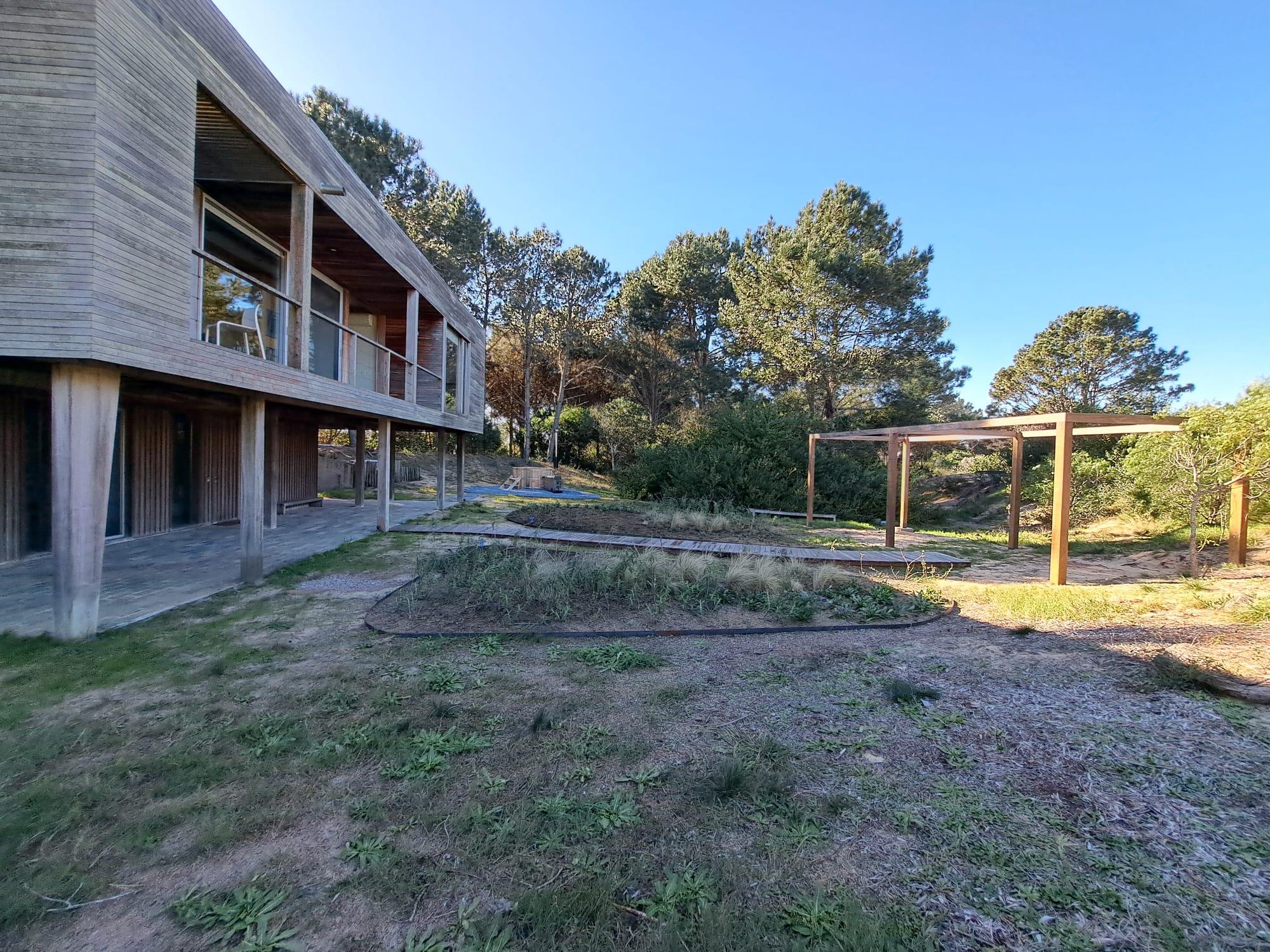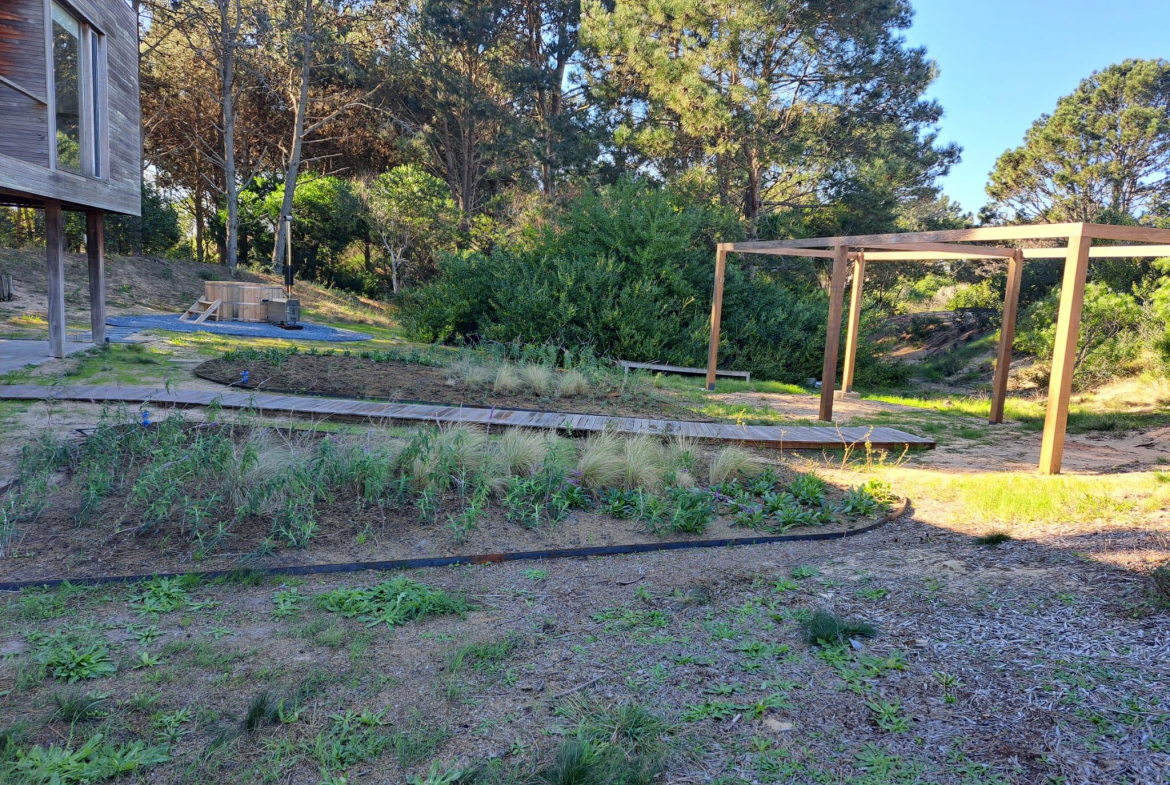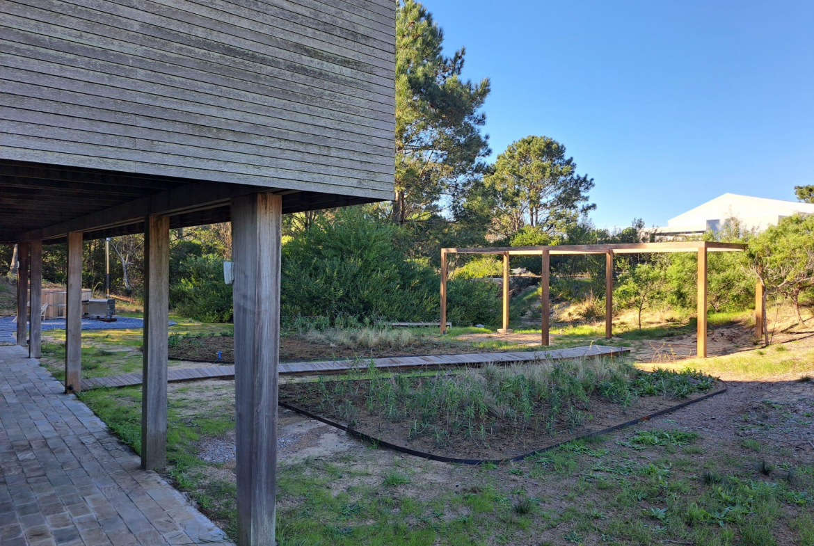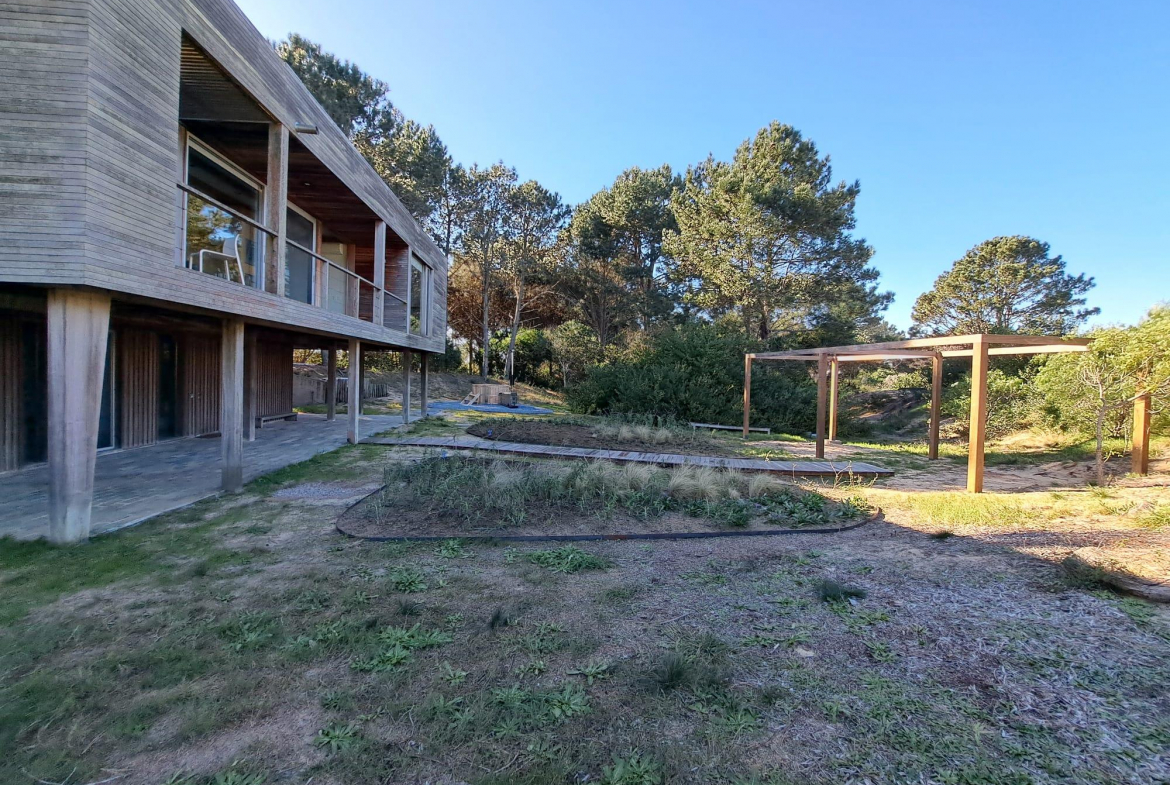 En un entorno arbolado, con arquitectura natural. Consta en planta alta con living comedor y cocina integrados, master suite, dormitorio para chicos en semi suite. En planta baja, dormitorio de huéspedes con living, cuarto dormitorio o dormitorio de servicio y lavadero. En su exterior cuenta con un hermoso jacuzzi rodeado de naturaleza.