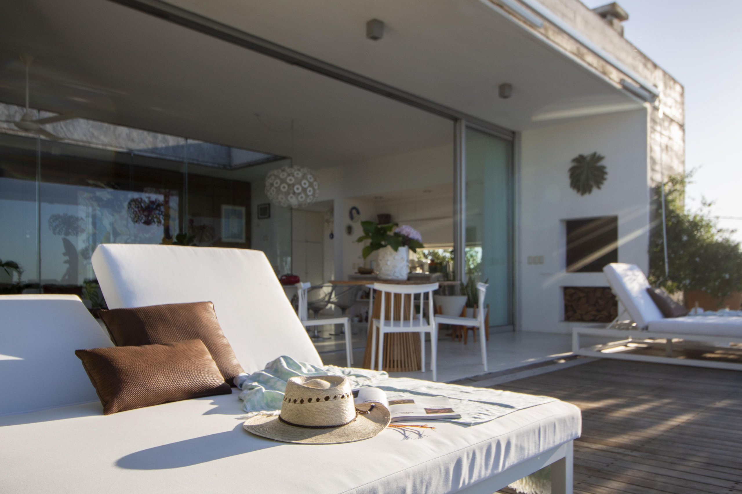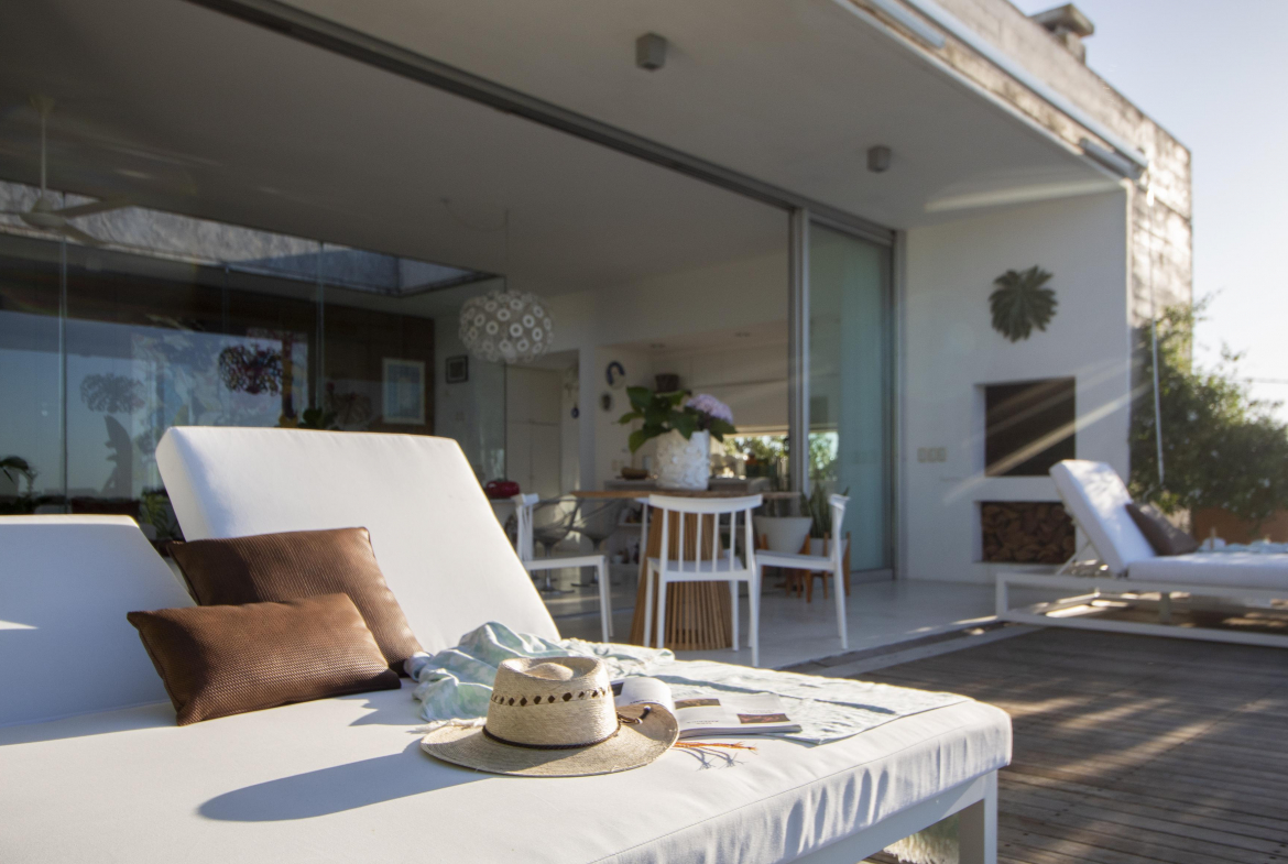 Amplia terraza sobre el deck protegida del sol por toldos Riego por aspersión