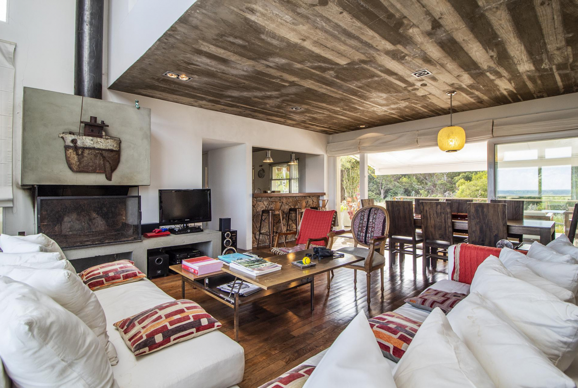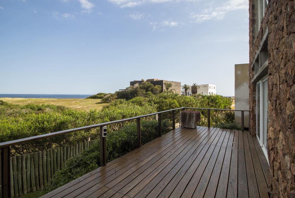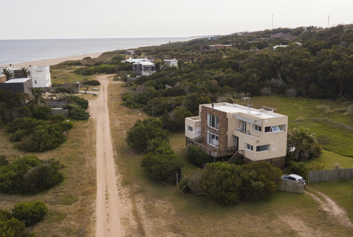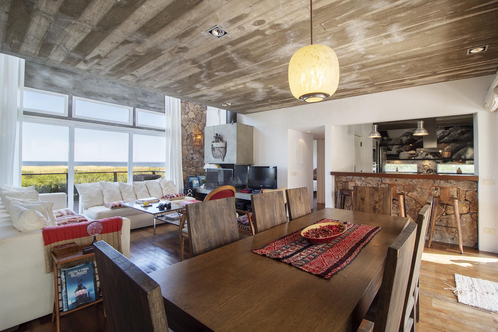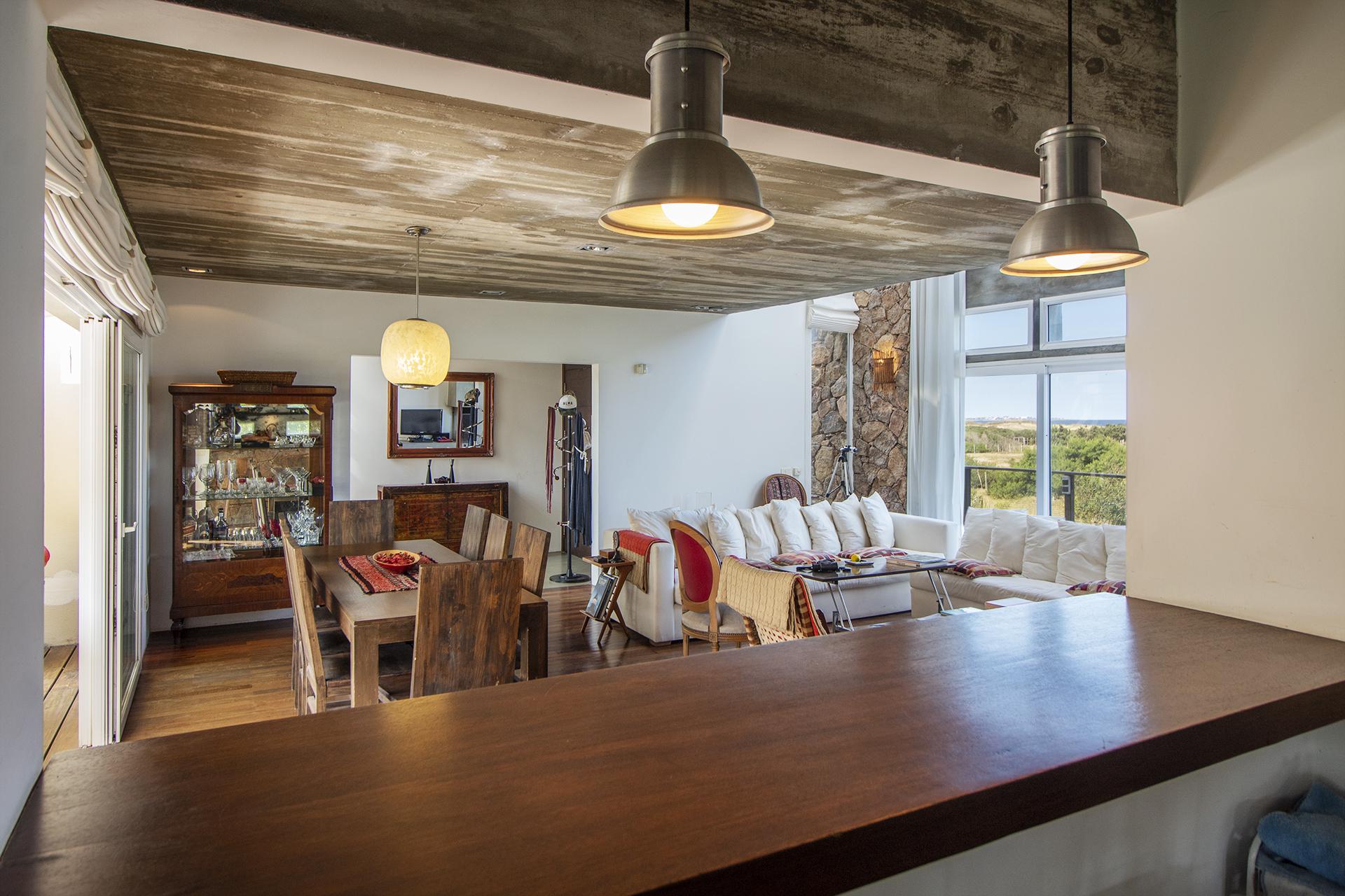 En la planta baja cuenta con Living,comedor con estufa a leña, ventanales de doble altura con vista al mar y al bosque, cocina moderna (semi integrada con isla, completamente equipada), deck al bosque con parrillero y piscina, deck al mar, un baño completo, un dormitorio y otro dormitorio en suite, toda la planta con vista al mar y al pueblo José Ignacio.