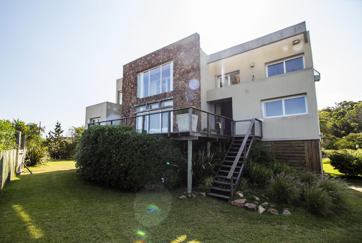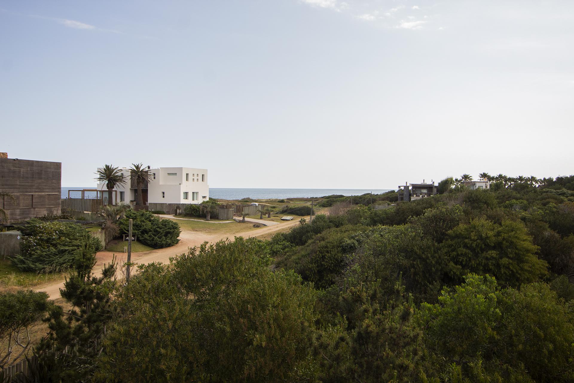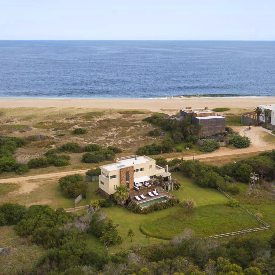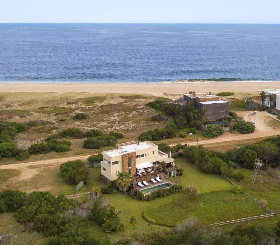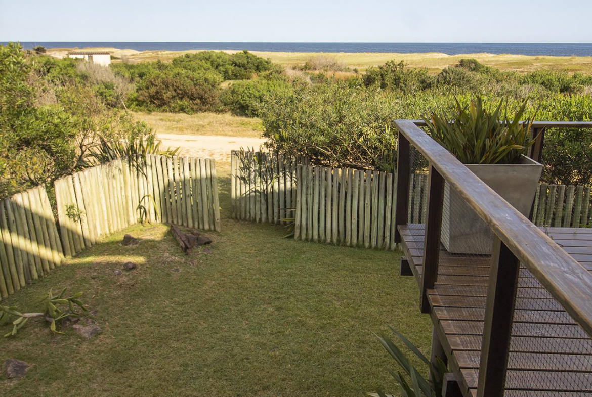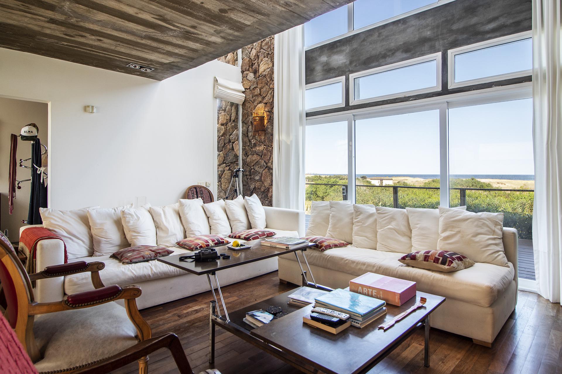 En la planta baja cuenta con Living,comedor con estufa a leña, ventanales de doble altura con vista al mar y al bosque, cocina moderna (semi integrada con isla, completamente equipada), deck al bosque con parrillero y piscina, deck al mar, un baño completo, un dormitorio y otro dormitorio en suite, toda la planta con vista al mar y al pueblo José Ignacio.