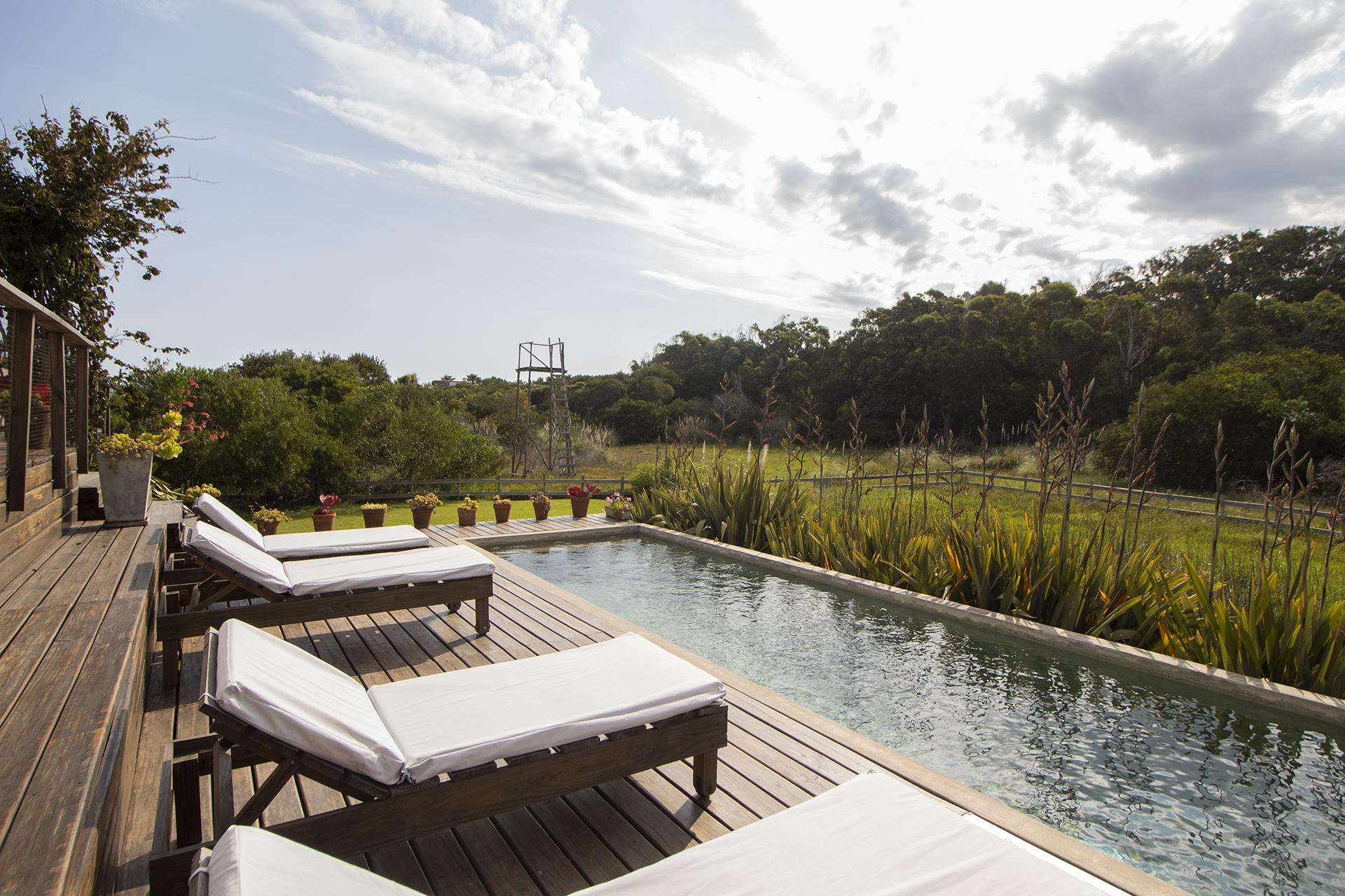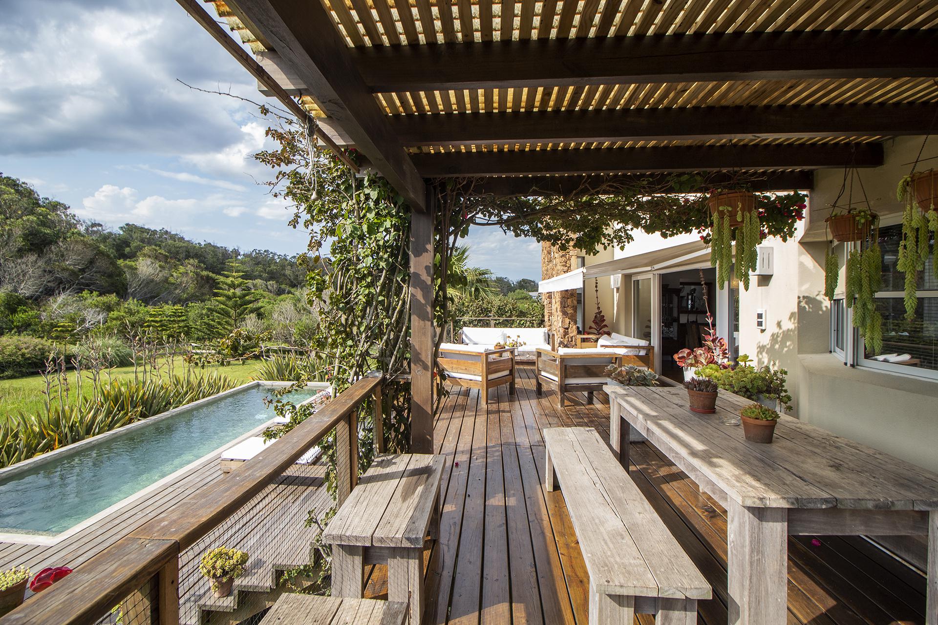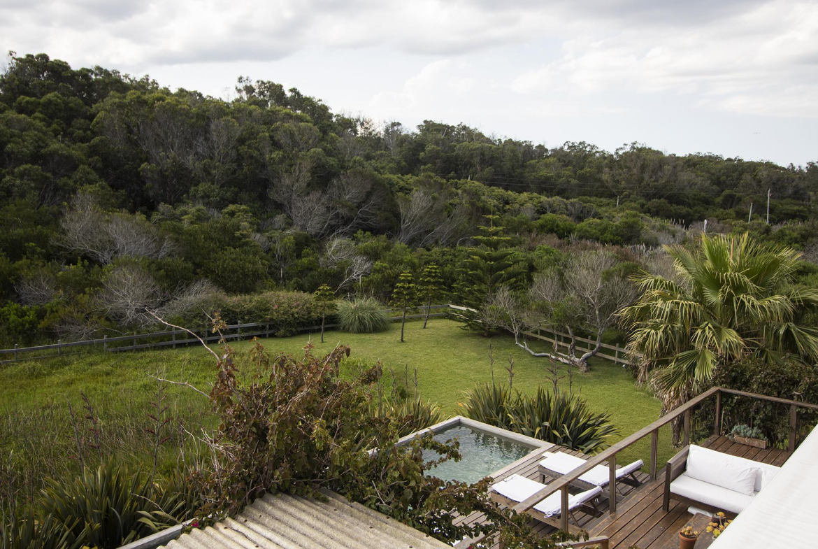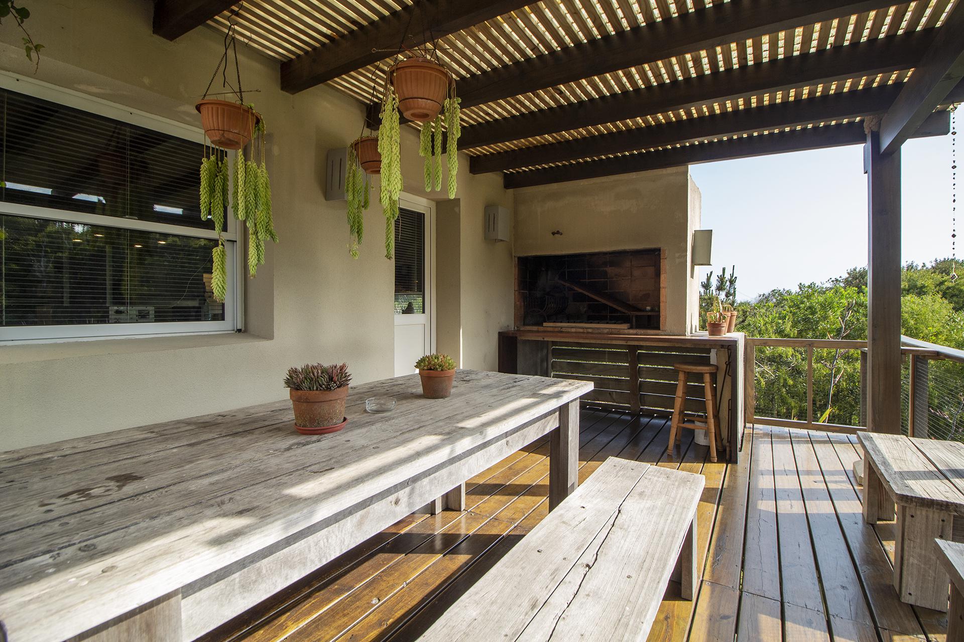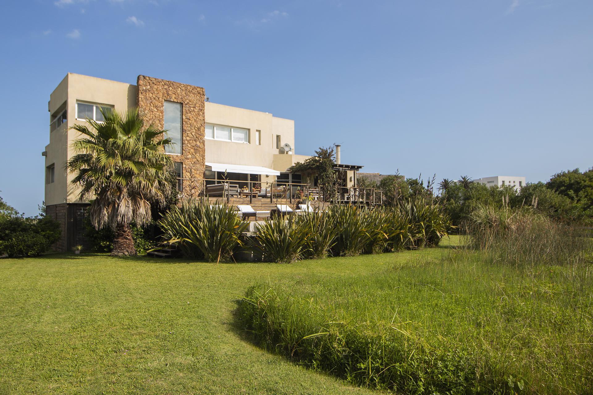 En la planta baja cuenta con Living,comedor con estufa a leña, ventanales de doble altura con vista al mar y al bosque, cocina moderna (semi integrada con isla, completamente equipada), deck al bosque con parrillero y piscina, deck al mar, un baño completo, un dormitorio y otro dormitorio en suite, toda la planta con vista al mar y al pueblo José Ignacio.