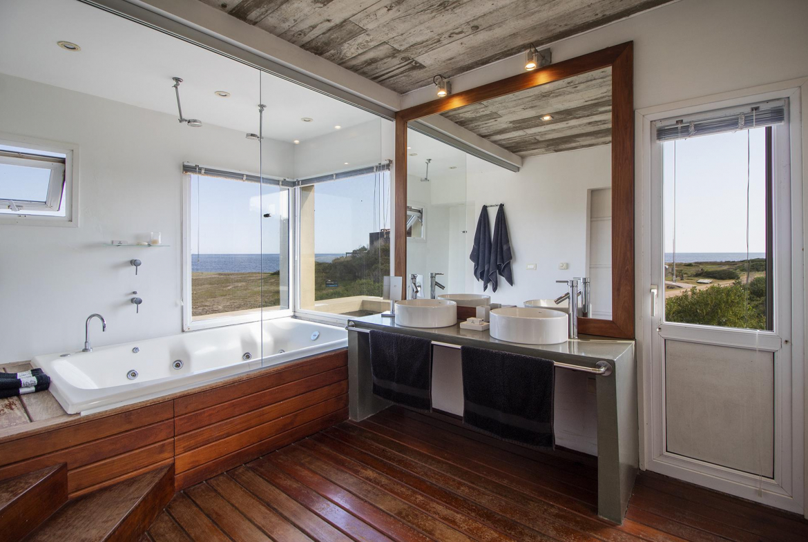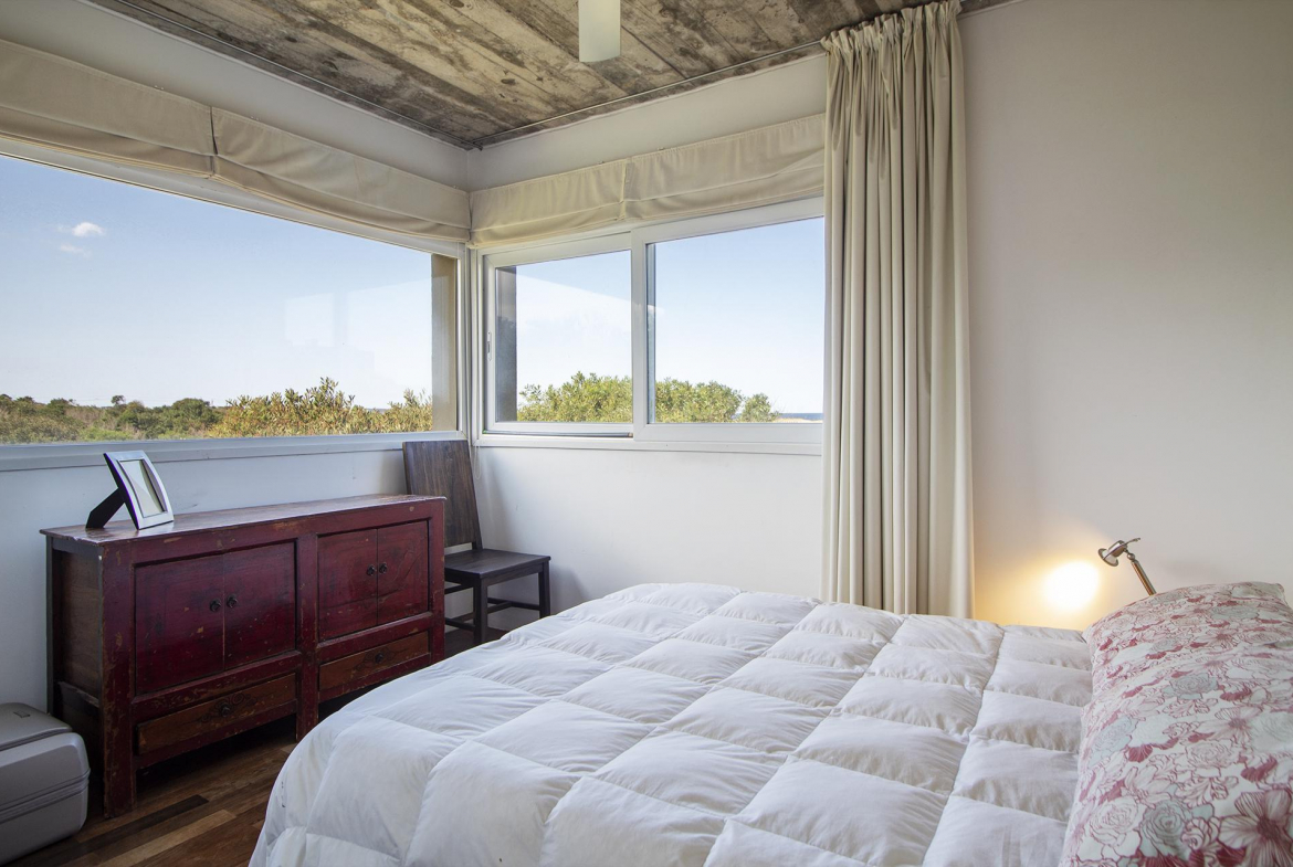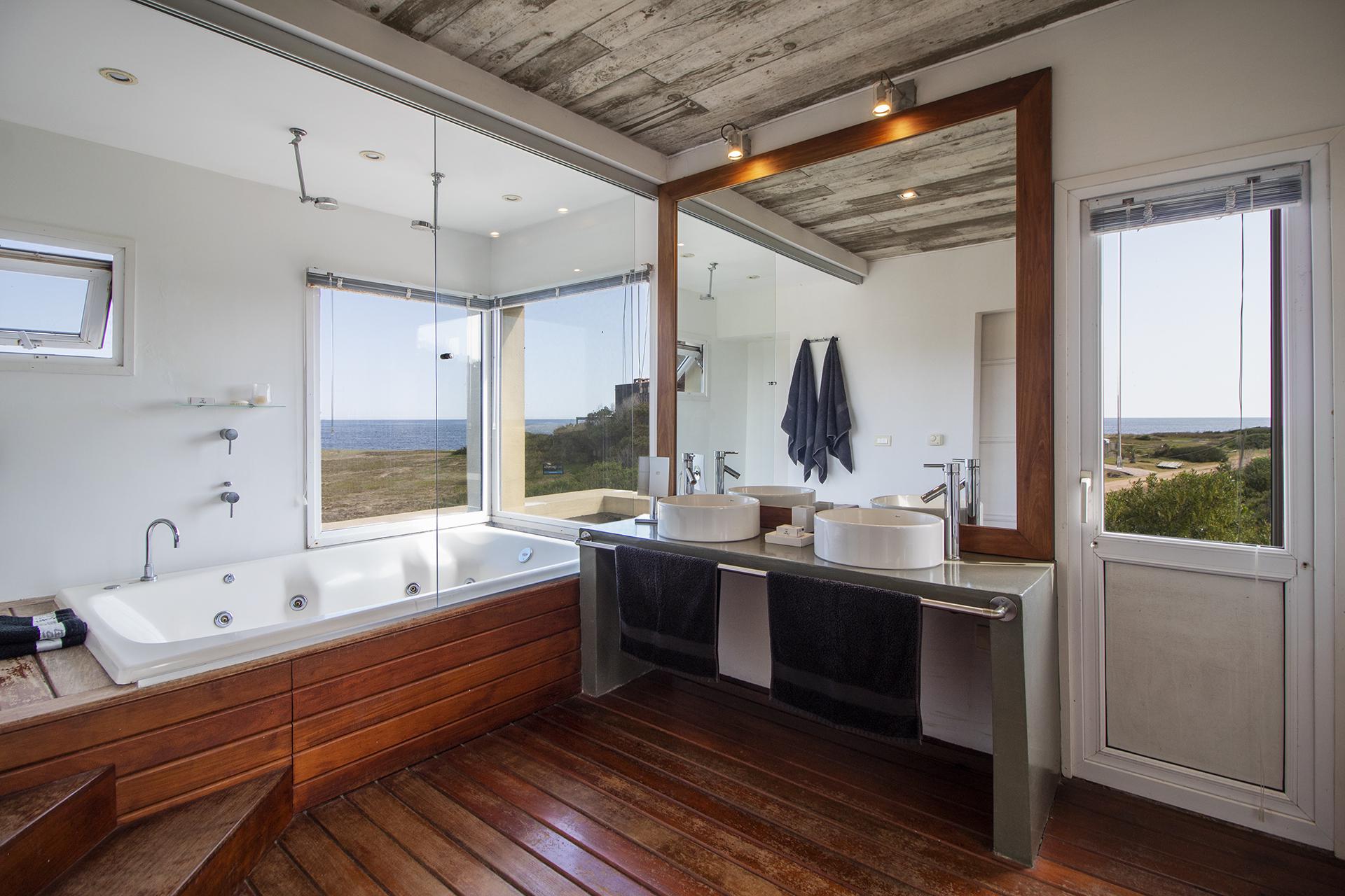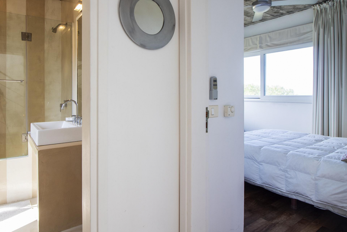 En la planta alta se encuentra un escritorio/dormitorio con vista de 300 grados, hall con salida al balcon y master suite con vestidor, baño con doble bacha, jacuzzi doble y terraza privada, todo con increíble vista al mar y al bosque.
