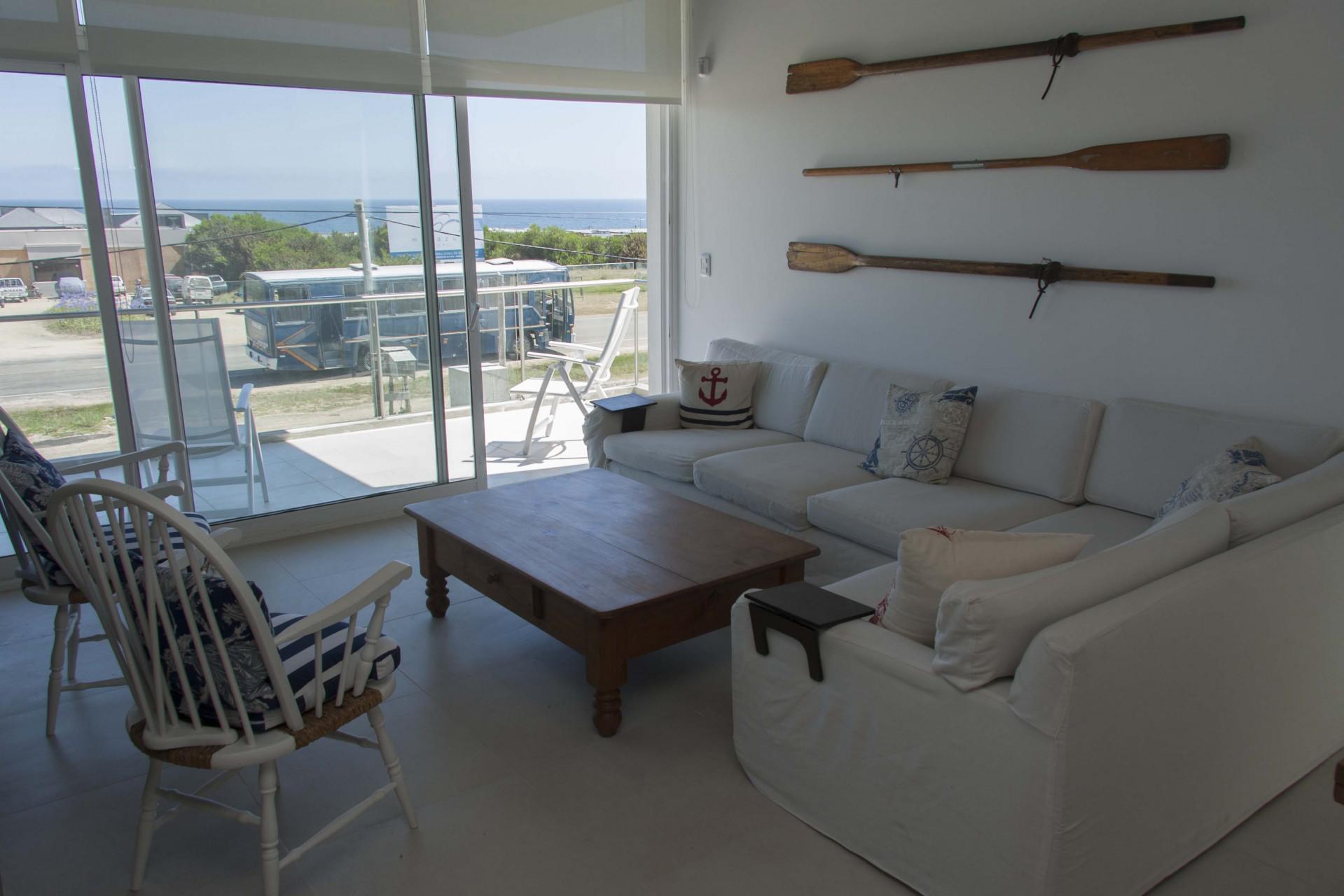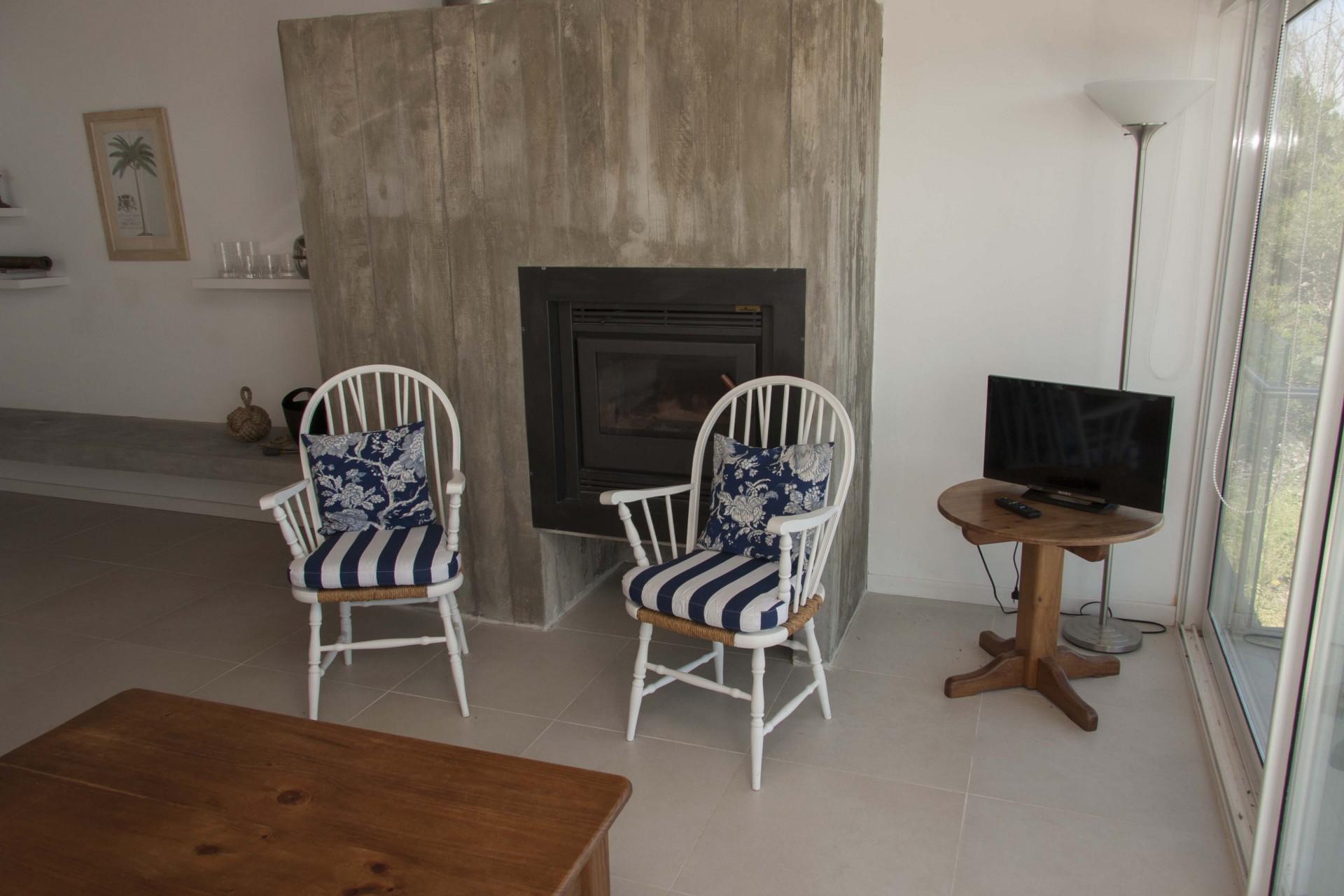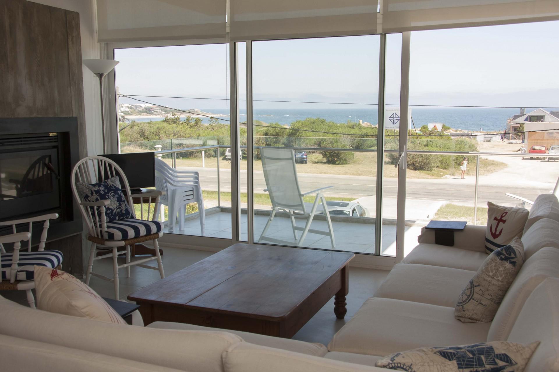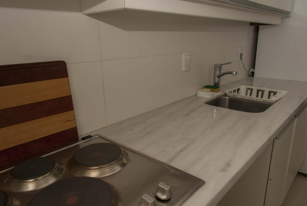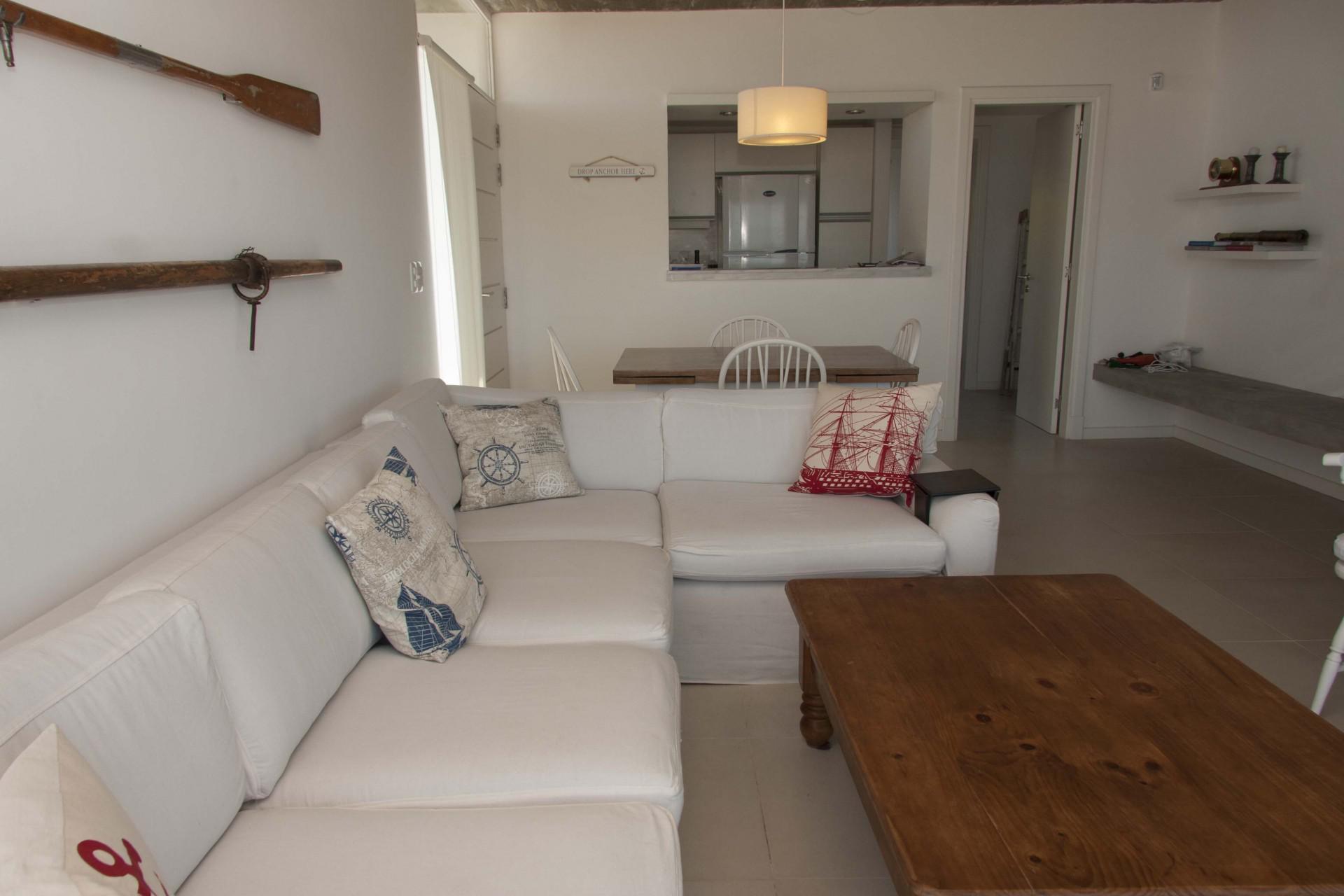 El área común integra cocina con horno y microondas, comedor y living los cuales miran al mar.
