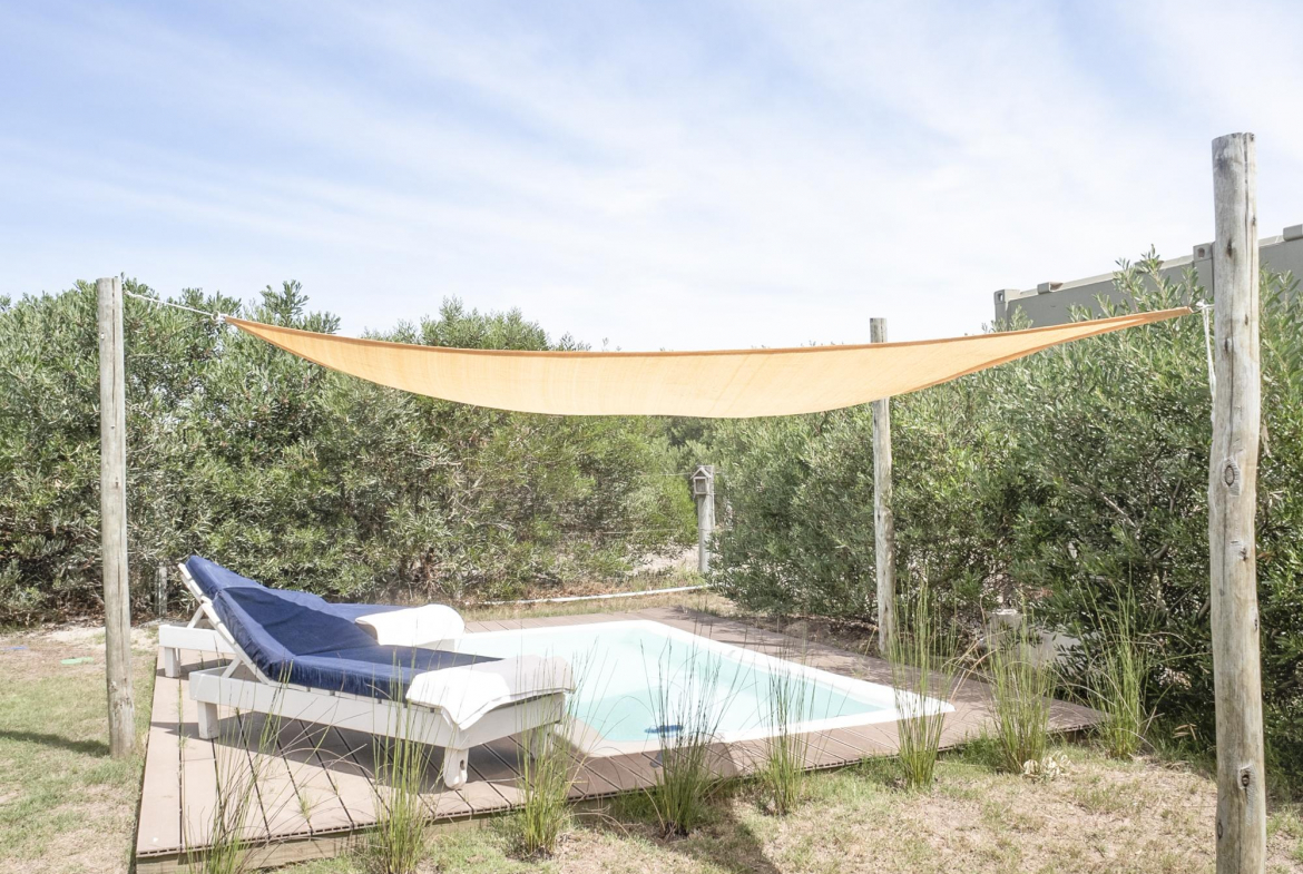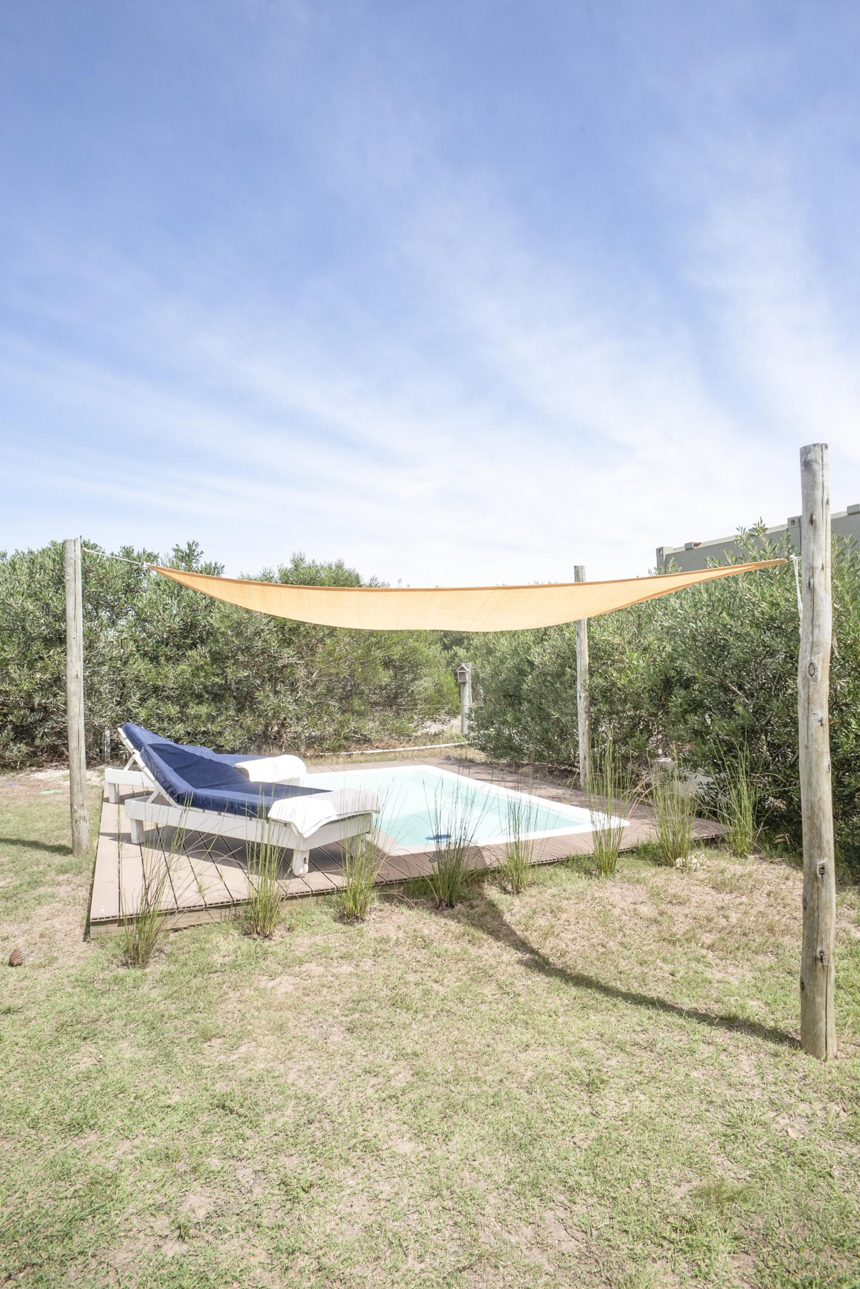En el jardin trasero, totalmente cercado, se encuentra la piscina y camastros para disfrutar.