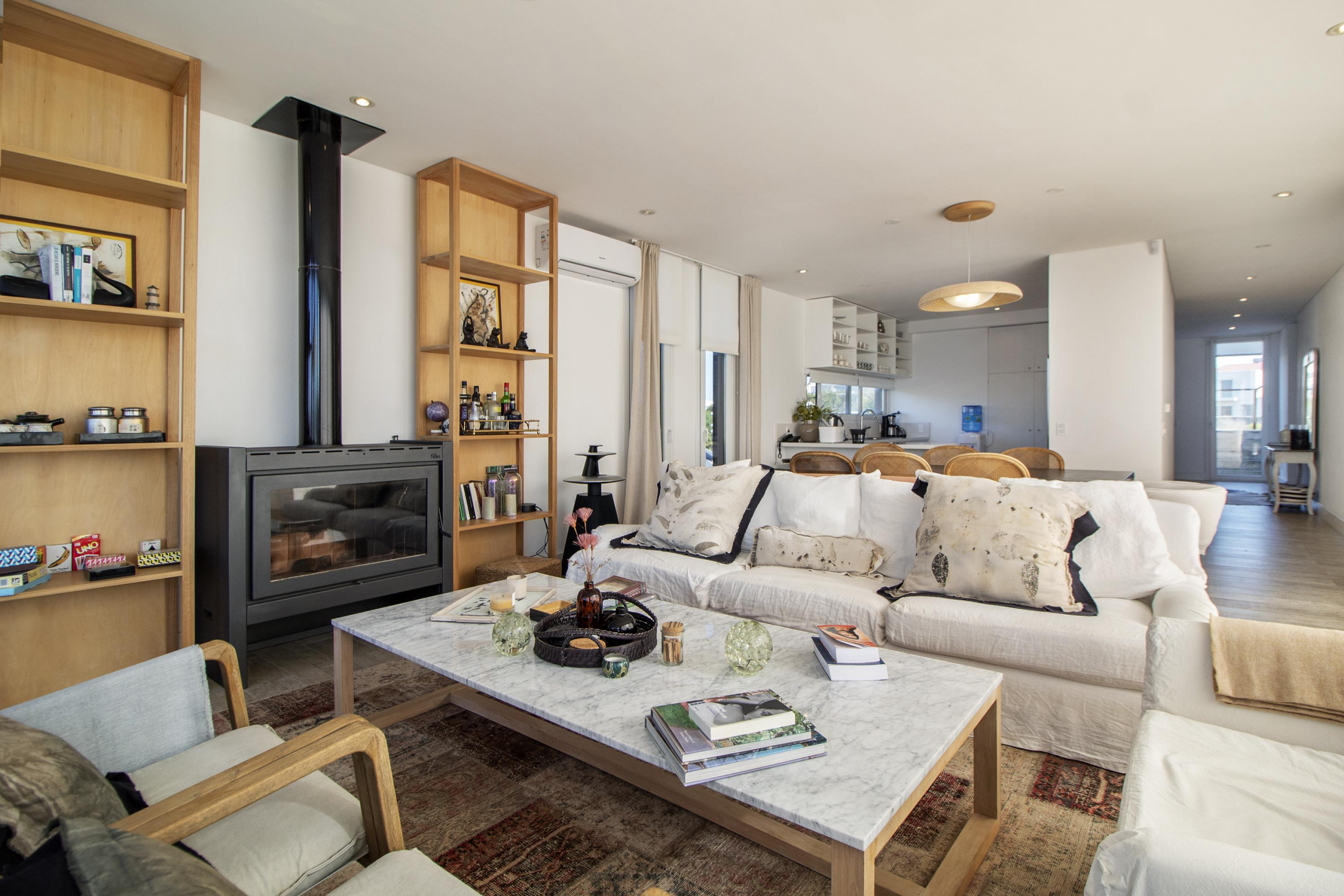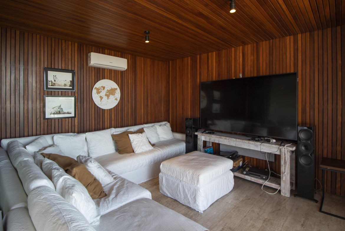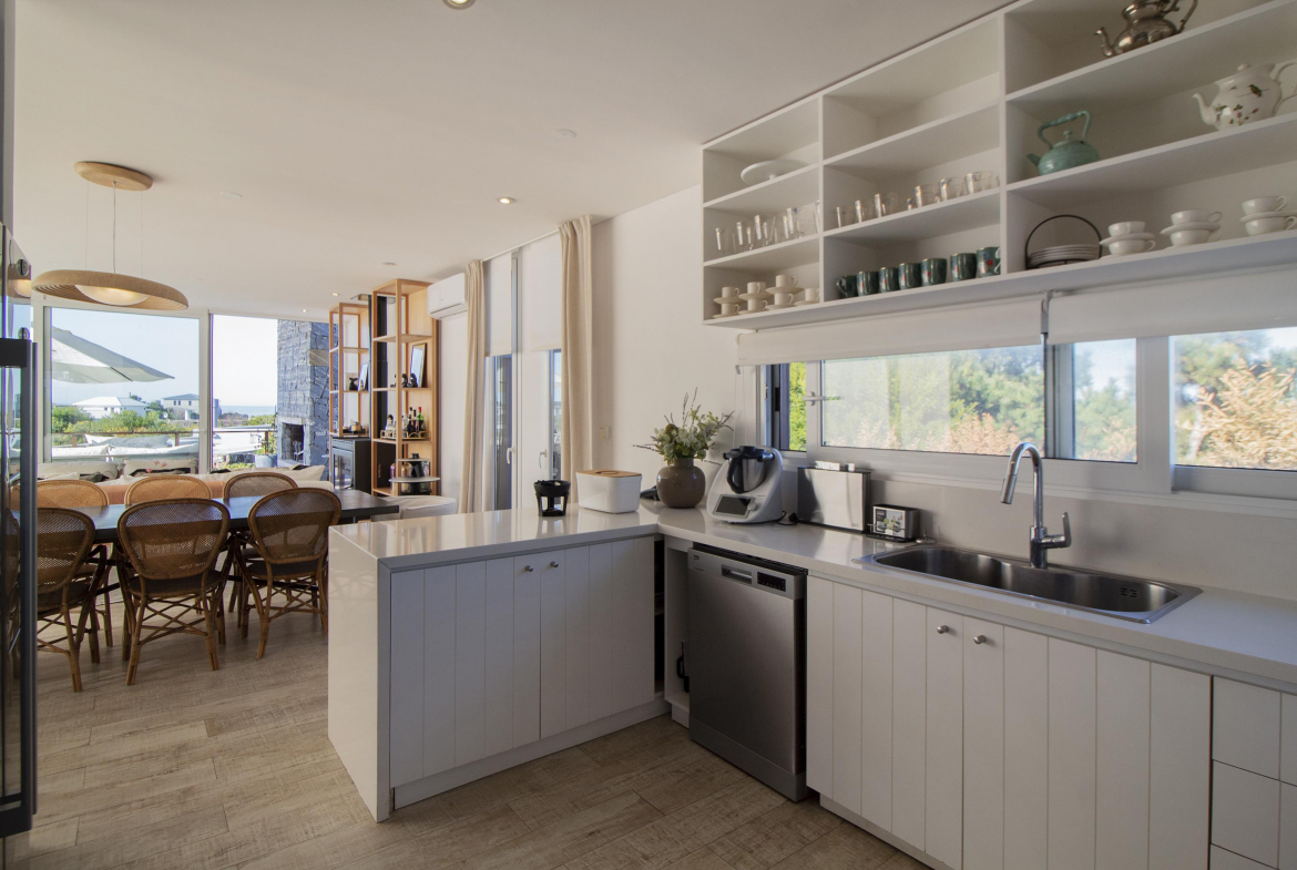 El area social de la casa se encuentra en planta alta. Living comedor y cocina integrada muy bien equipada, comoda terraza hacia el mar, con living exterior, y fogon. Toillete y master suite completan la propiedad. La master suite posee vestidor, living independiente y una linda terraza para desayunar o disfrutar de la vista al mar y escalera hacia solarium.