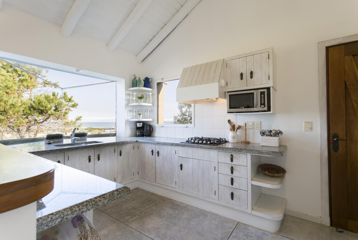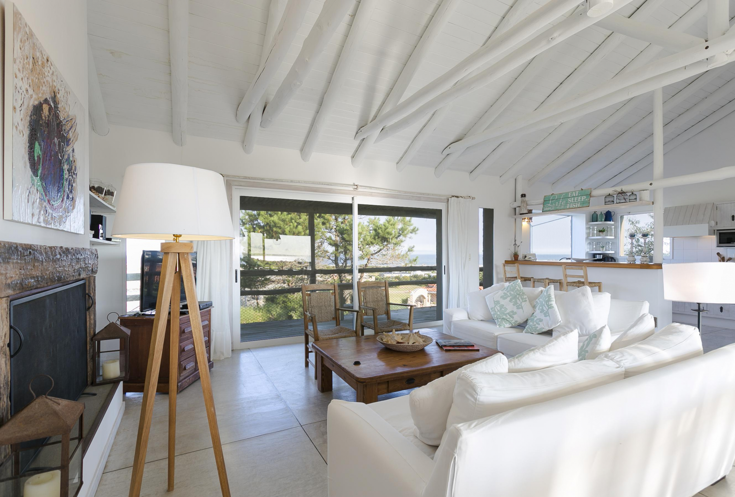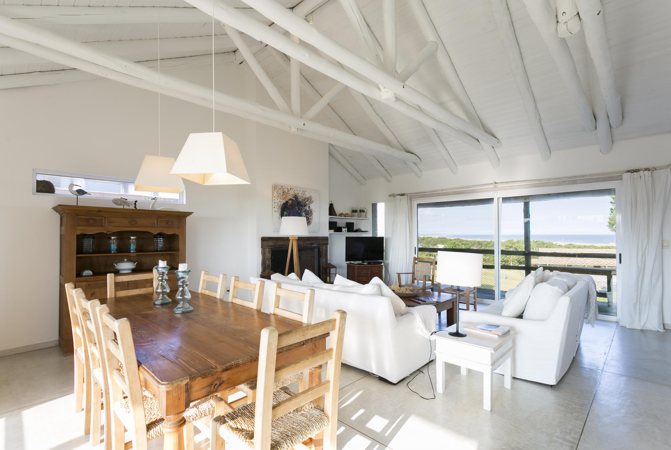 Living comedor y cocina, estufa a leña. Balcón en planta alta con vista al mar.