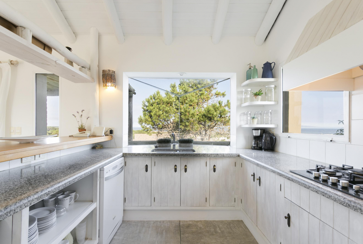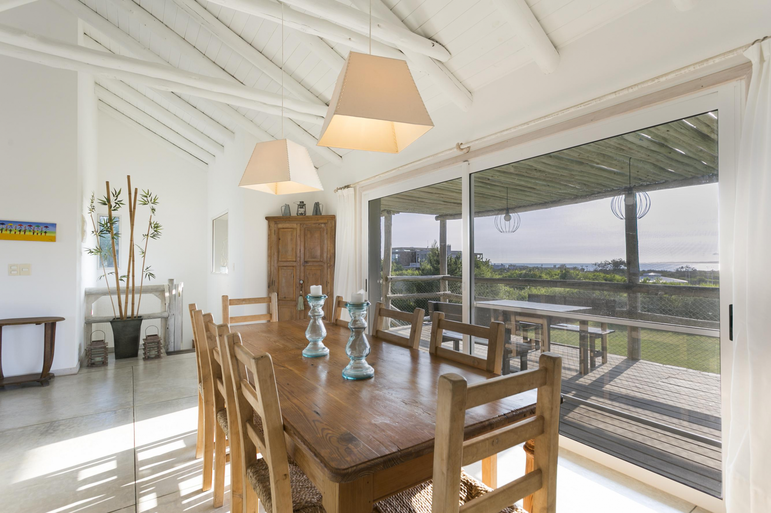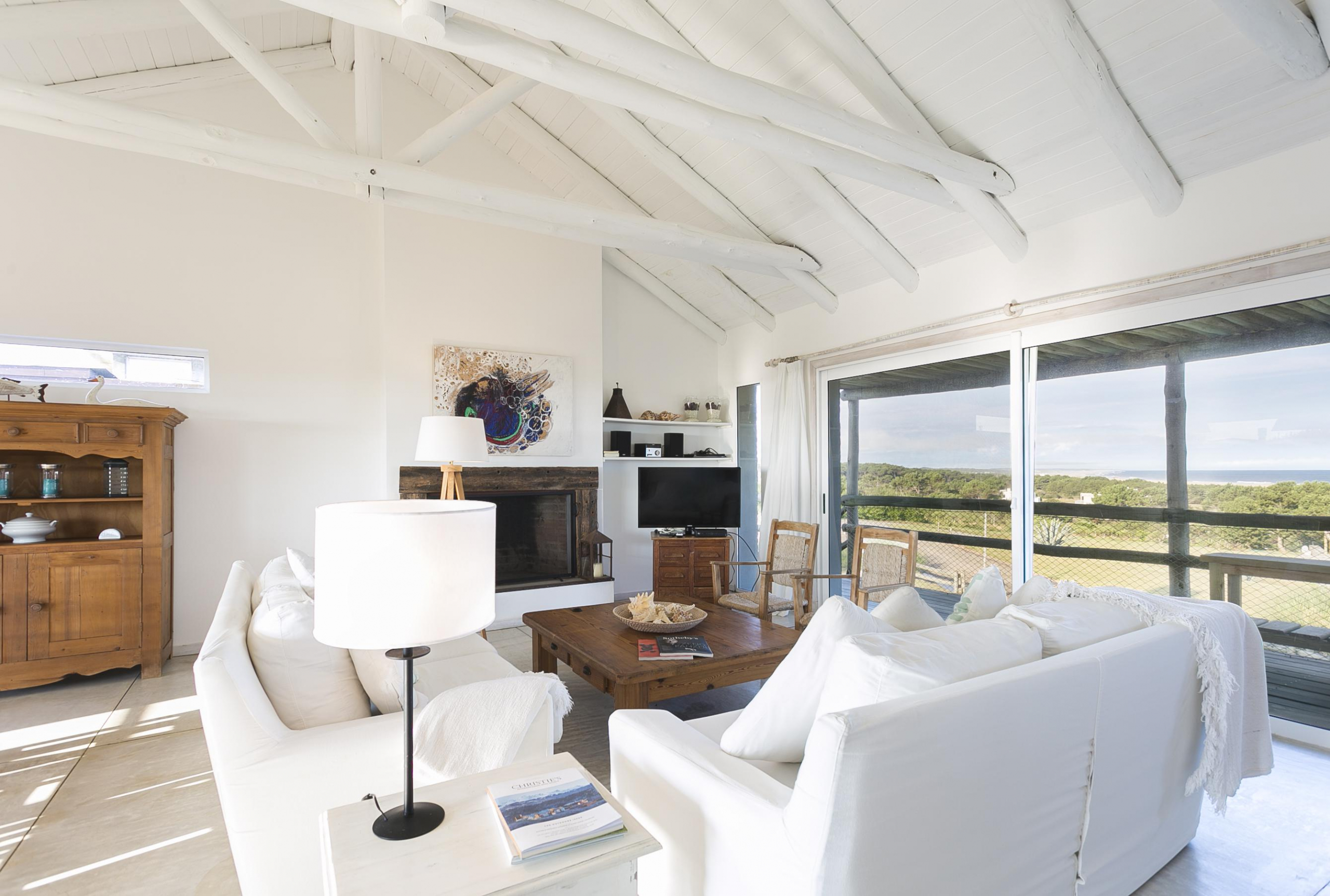 Living comedor y cocina, estufa a leña. Balcón en planta alta con vista al mar.