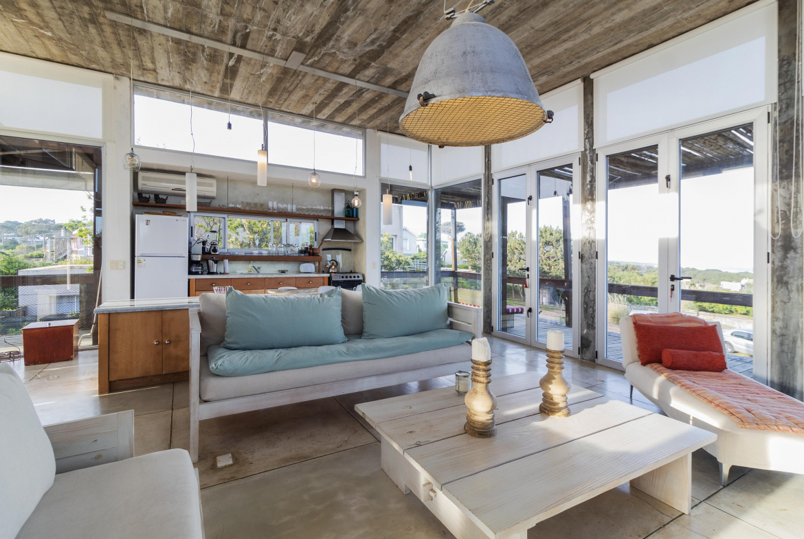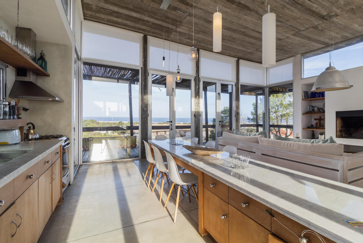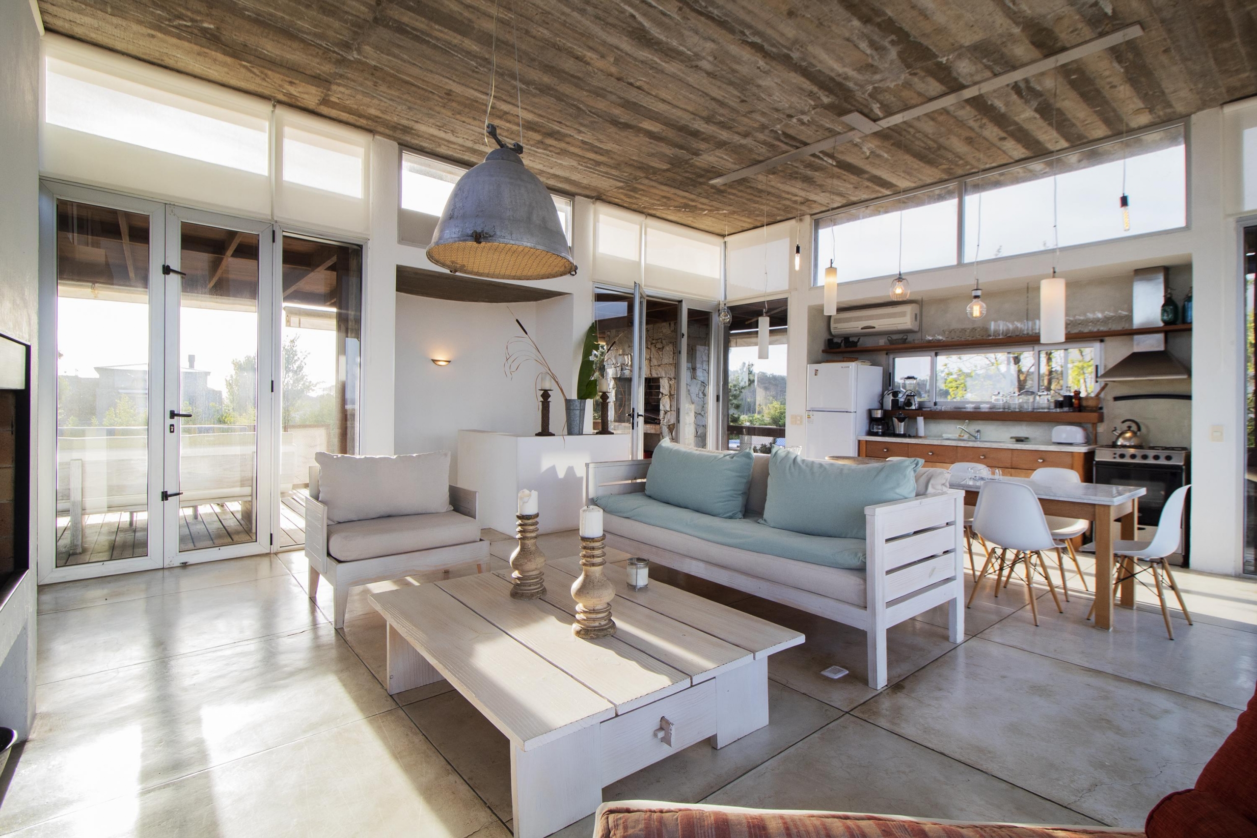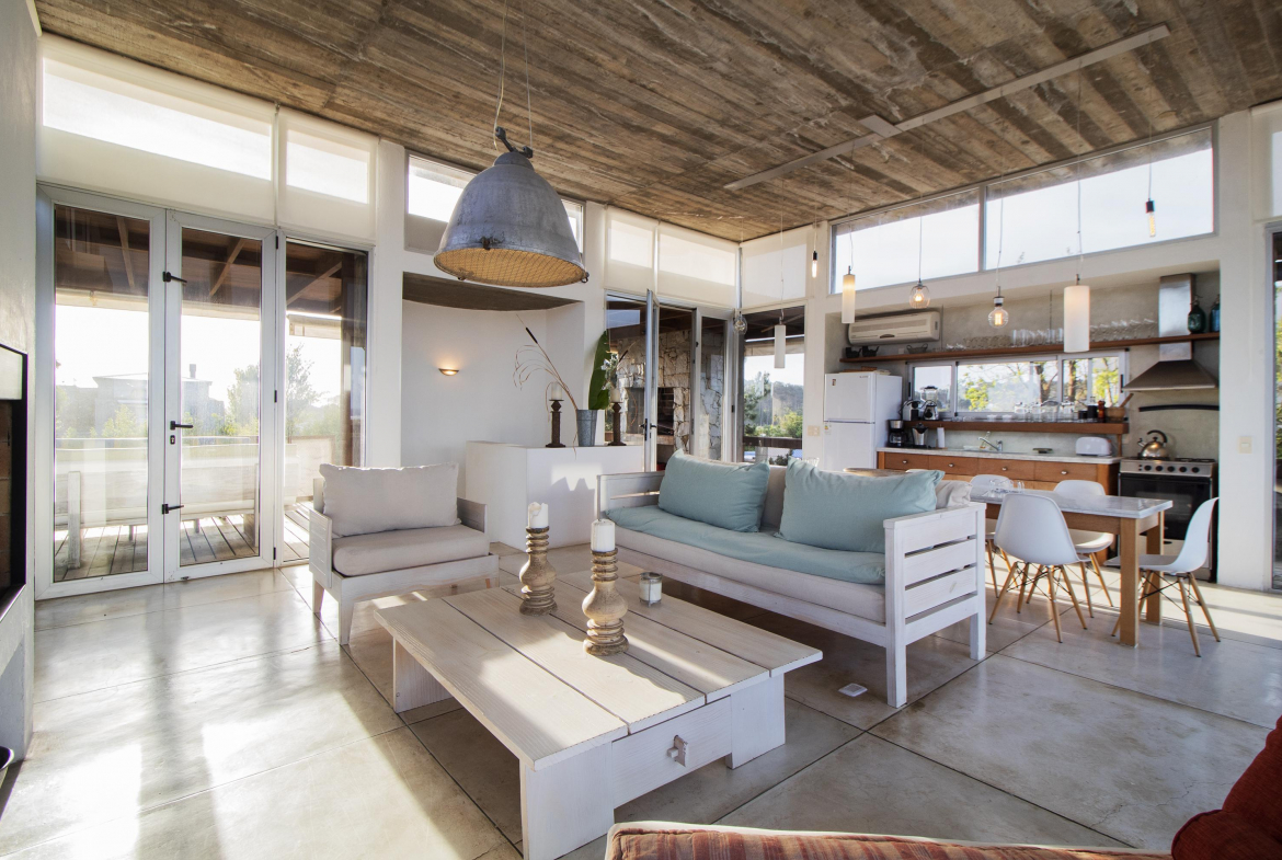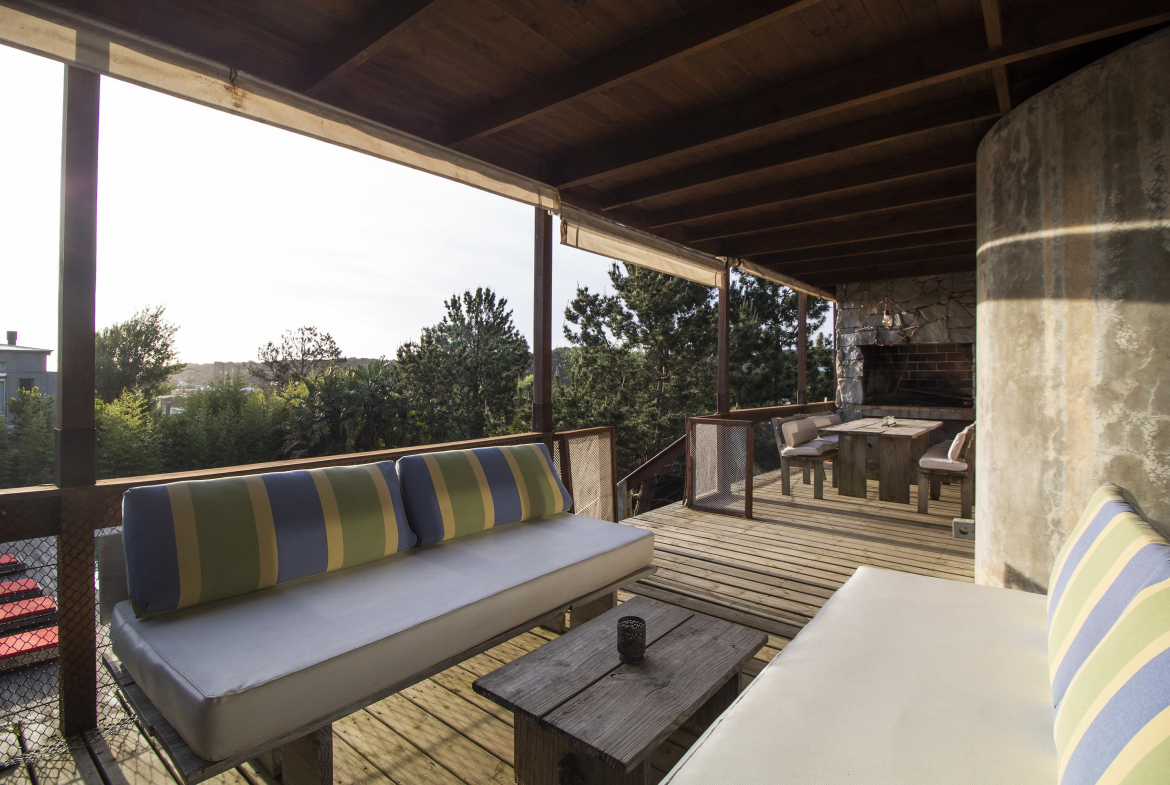 Arriba living comedor y cocina integrado.. amplio deck con fogon y parrilla al atardecer.