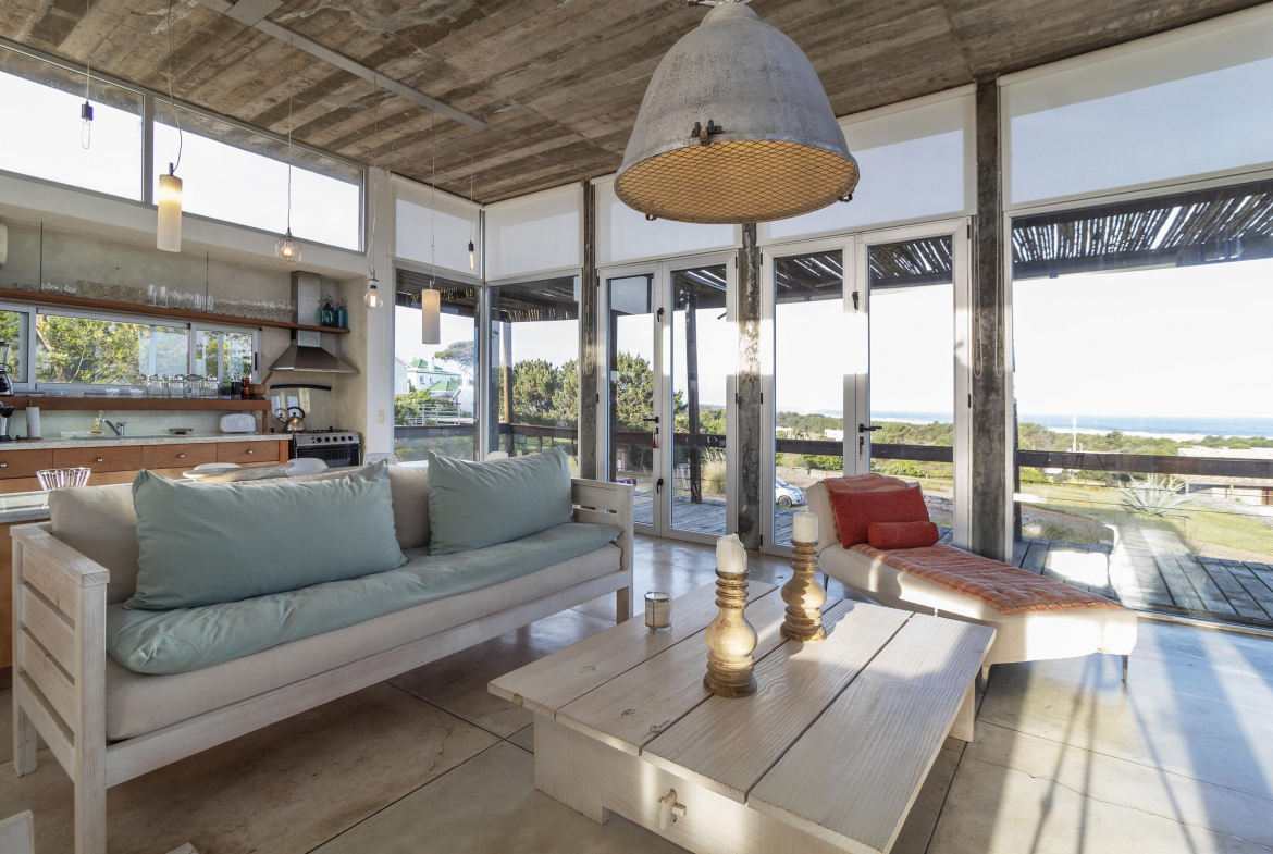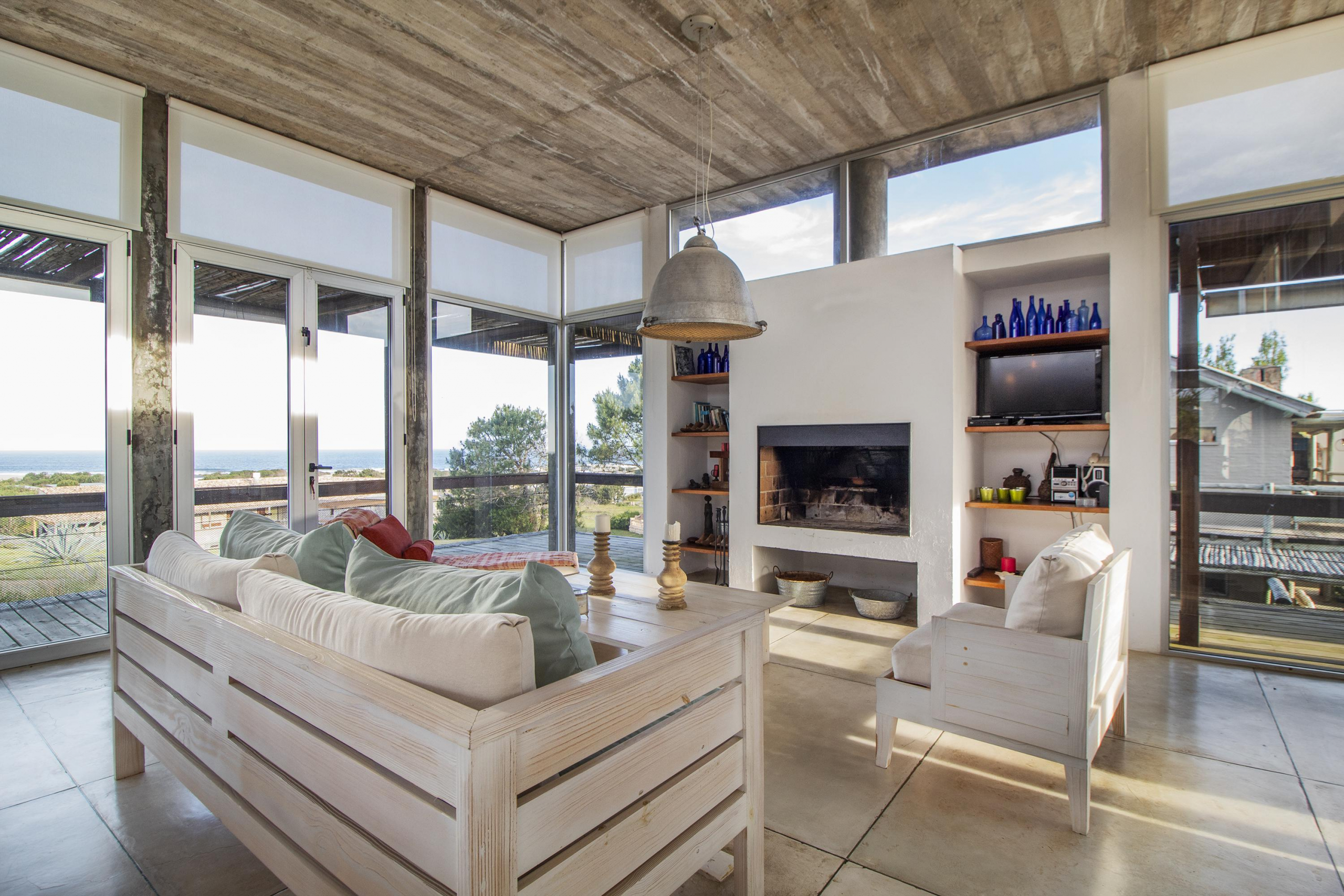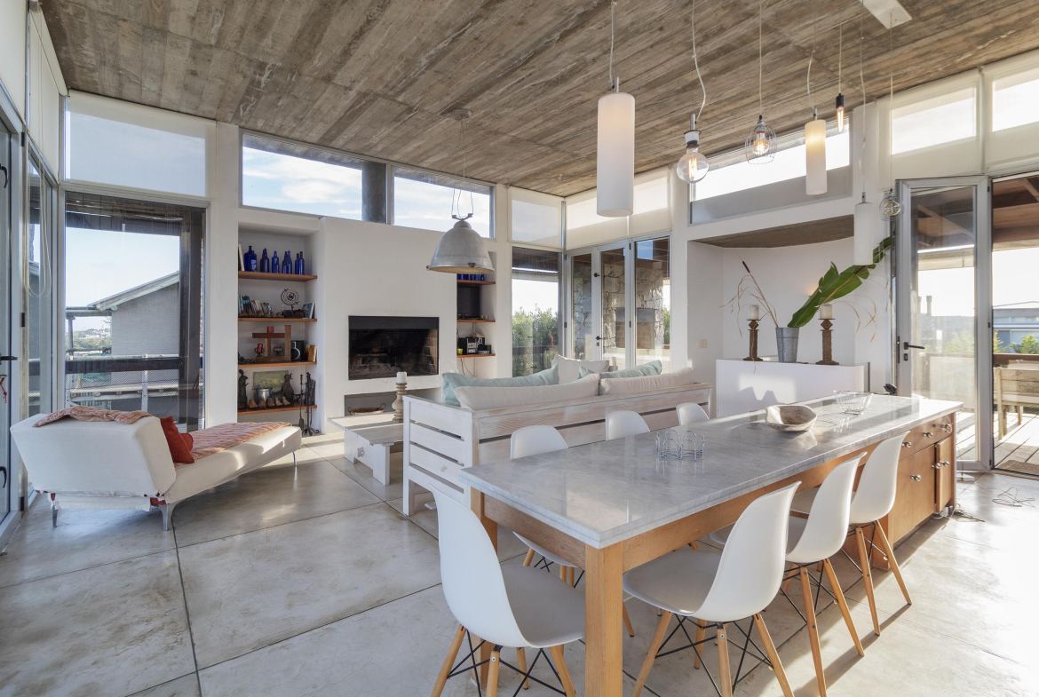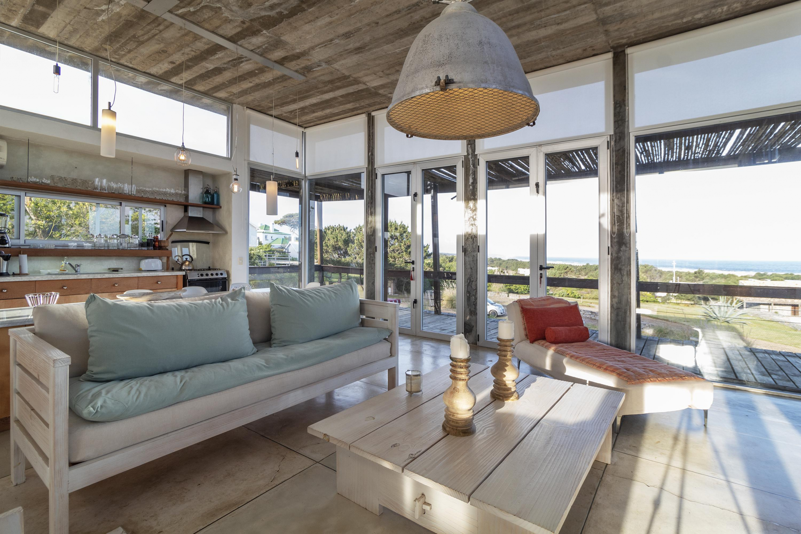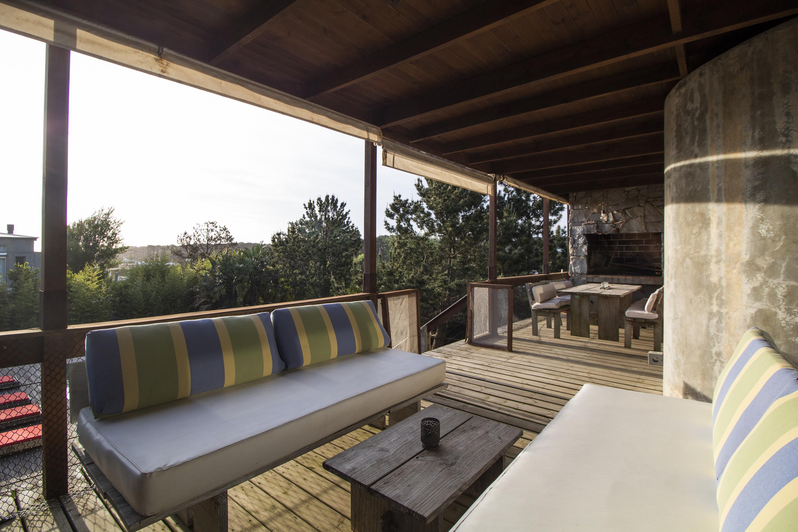 Arriba living comedor y cocina integrado.. amplio deck con fogon y parrilla al atardecer.