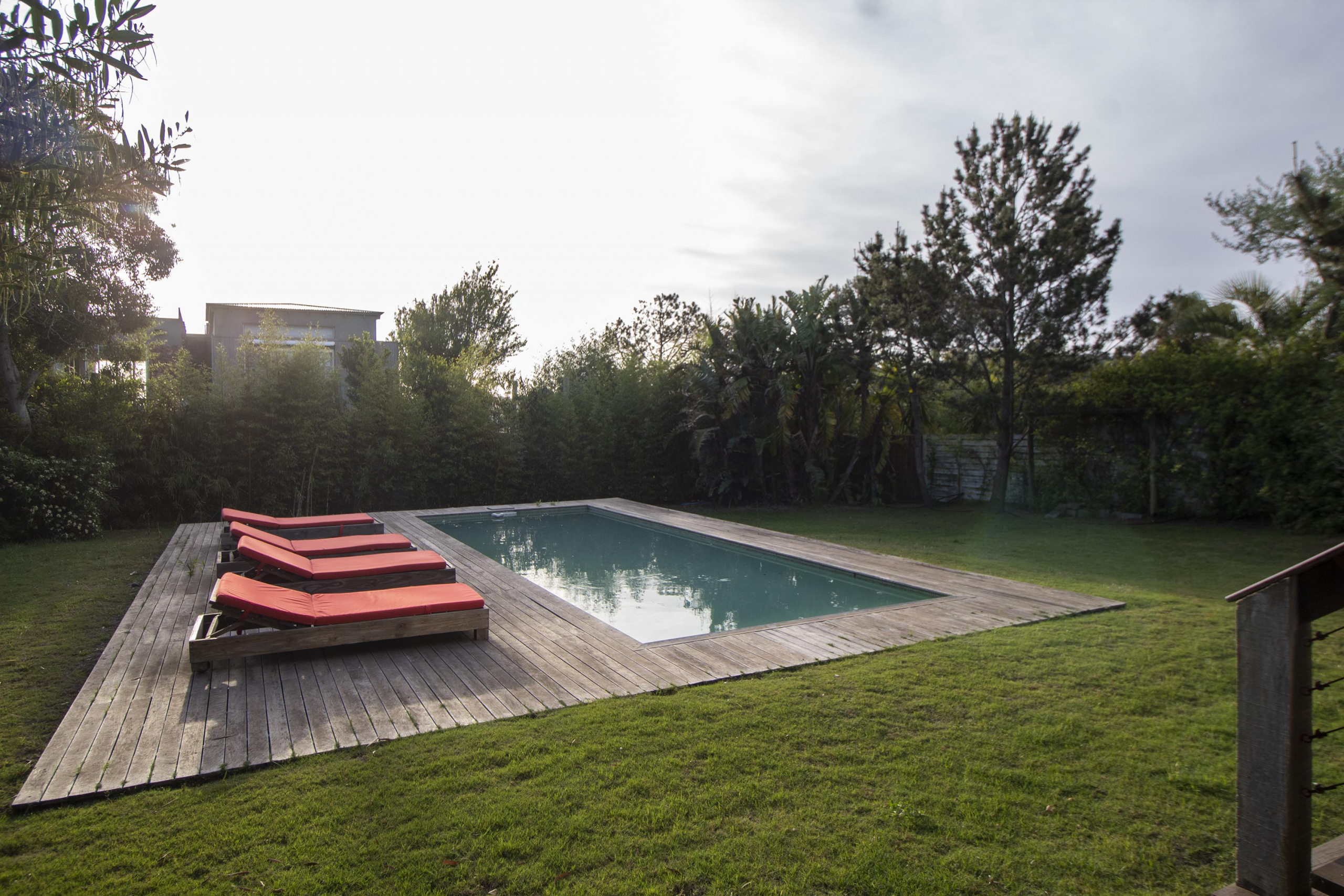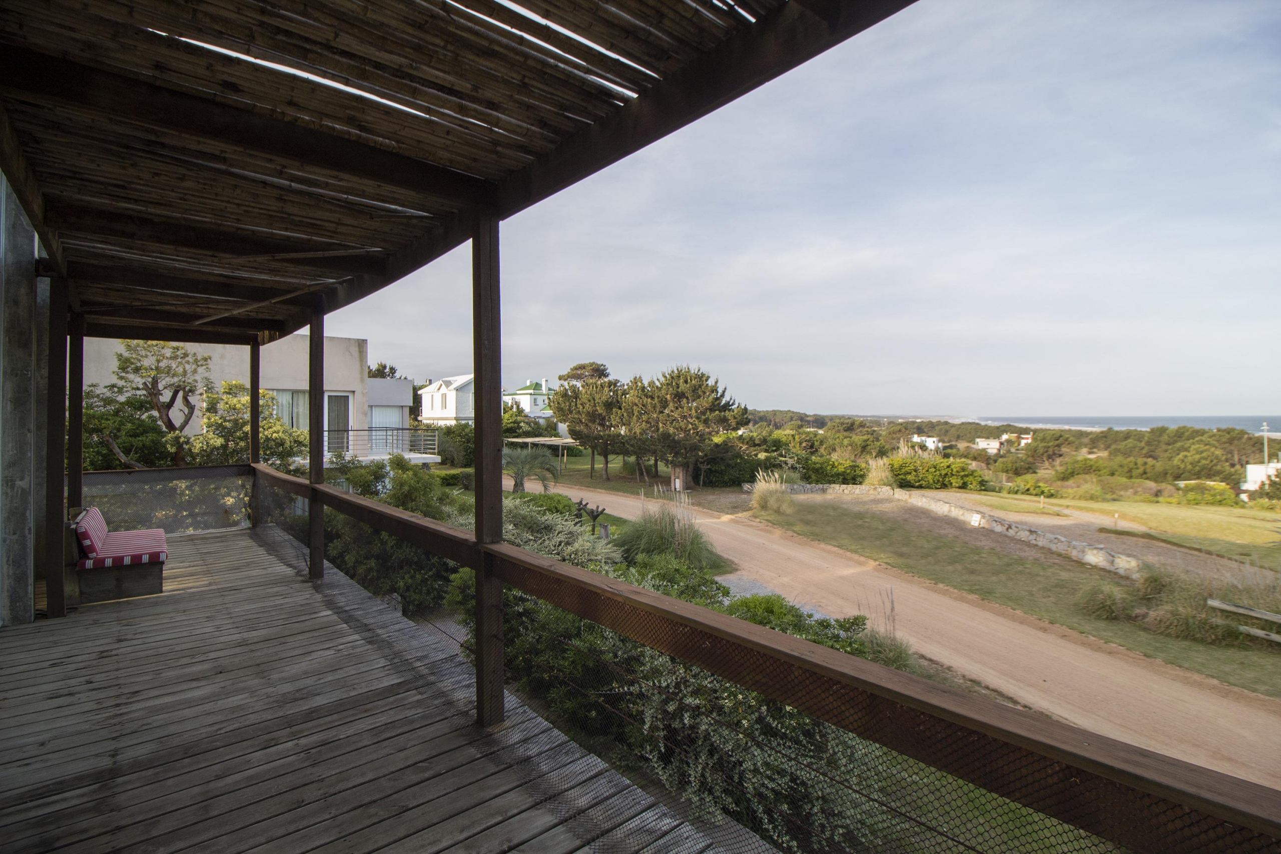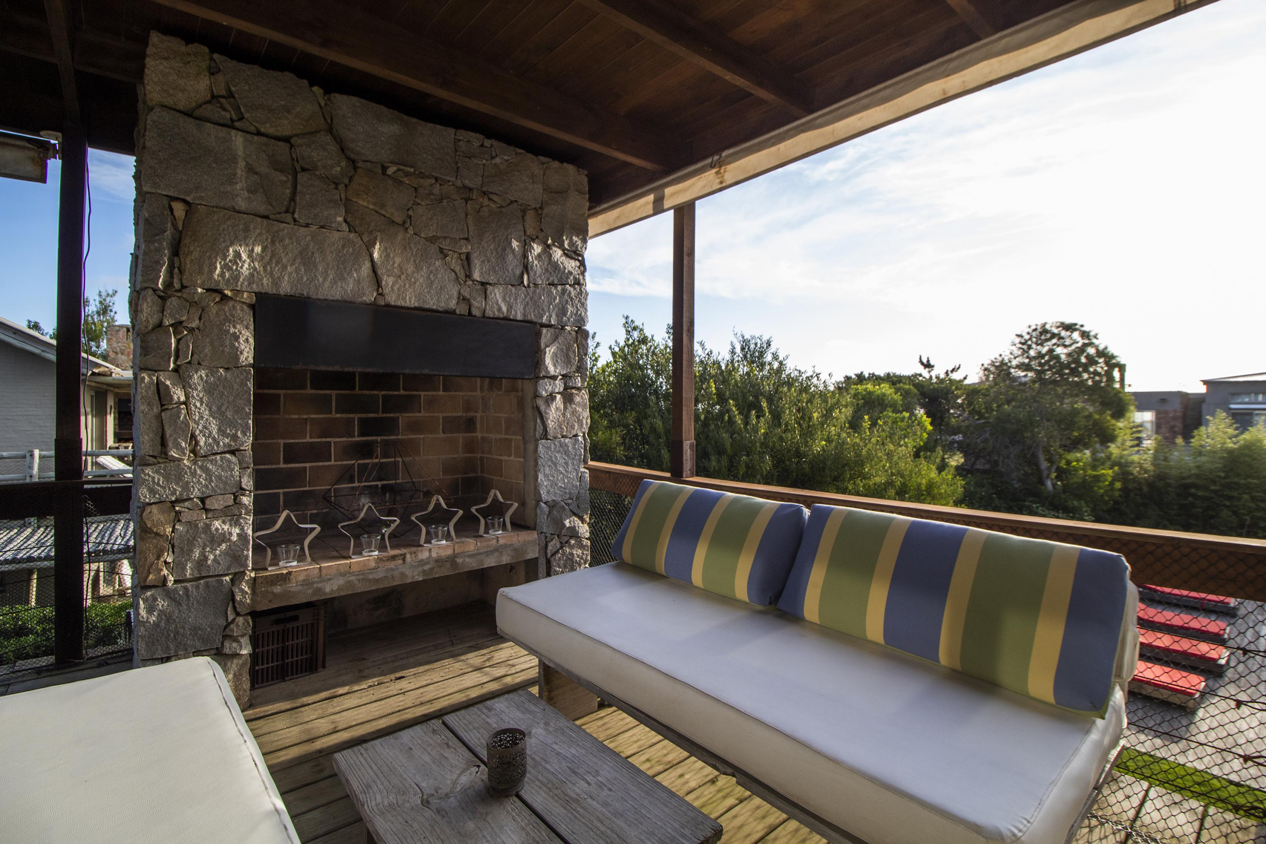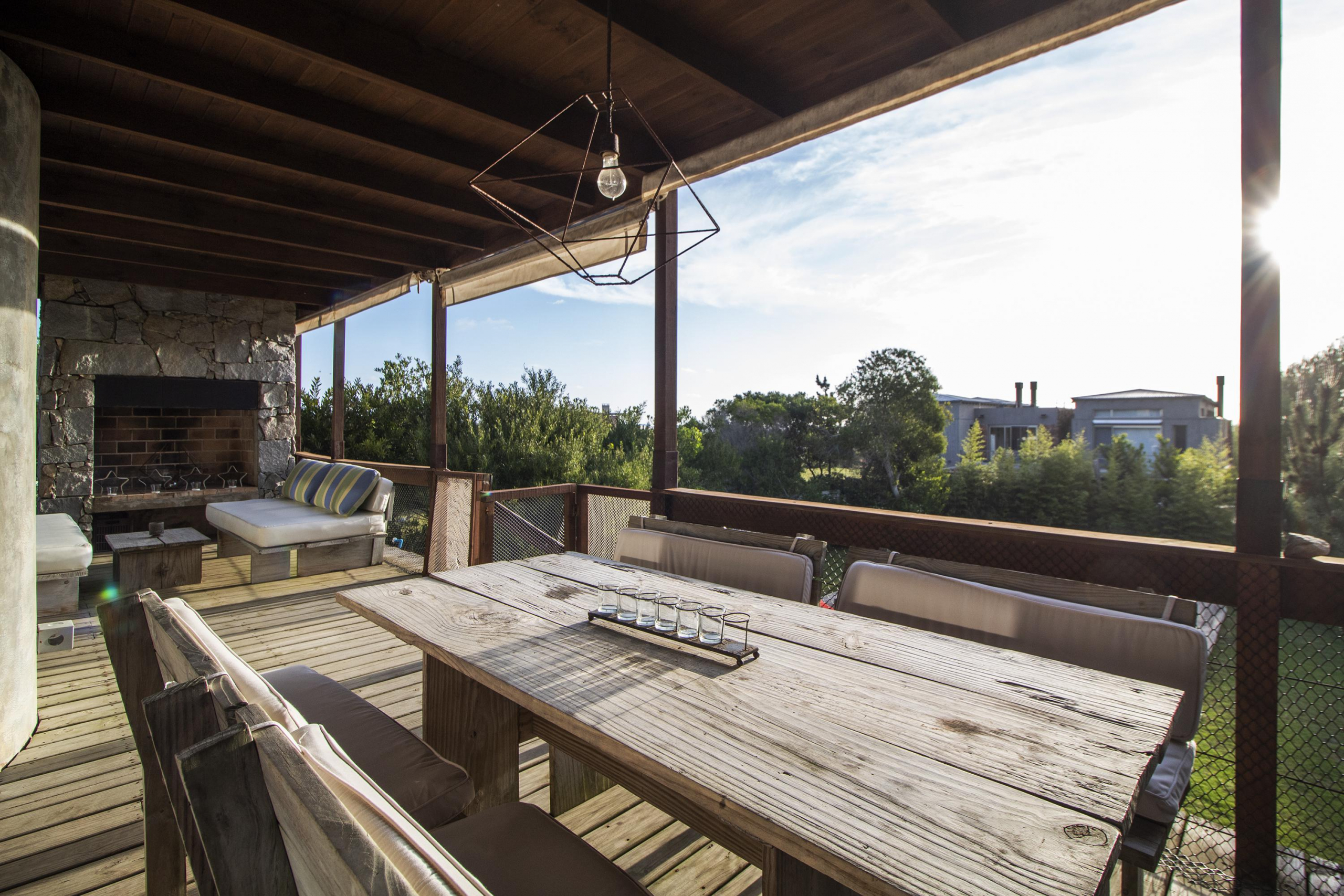 Arriba living comedor y cocina integrado.. amplio deck con fogon y parrilla al atardecer.