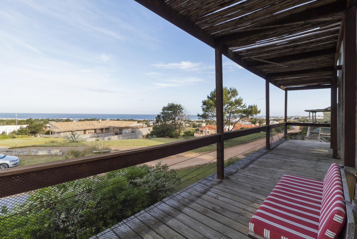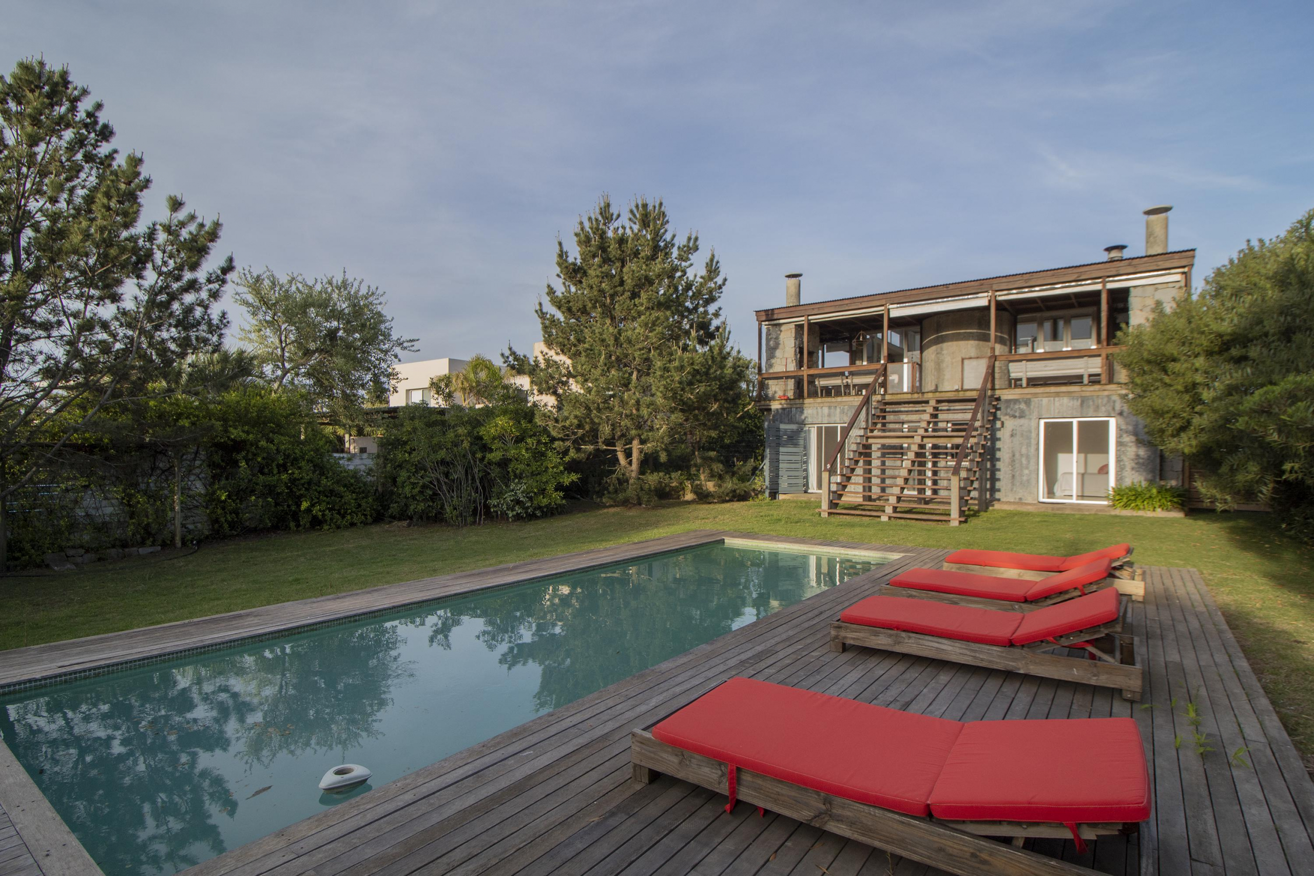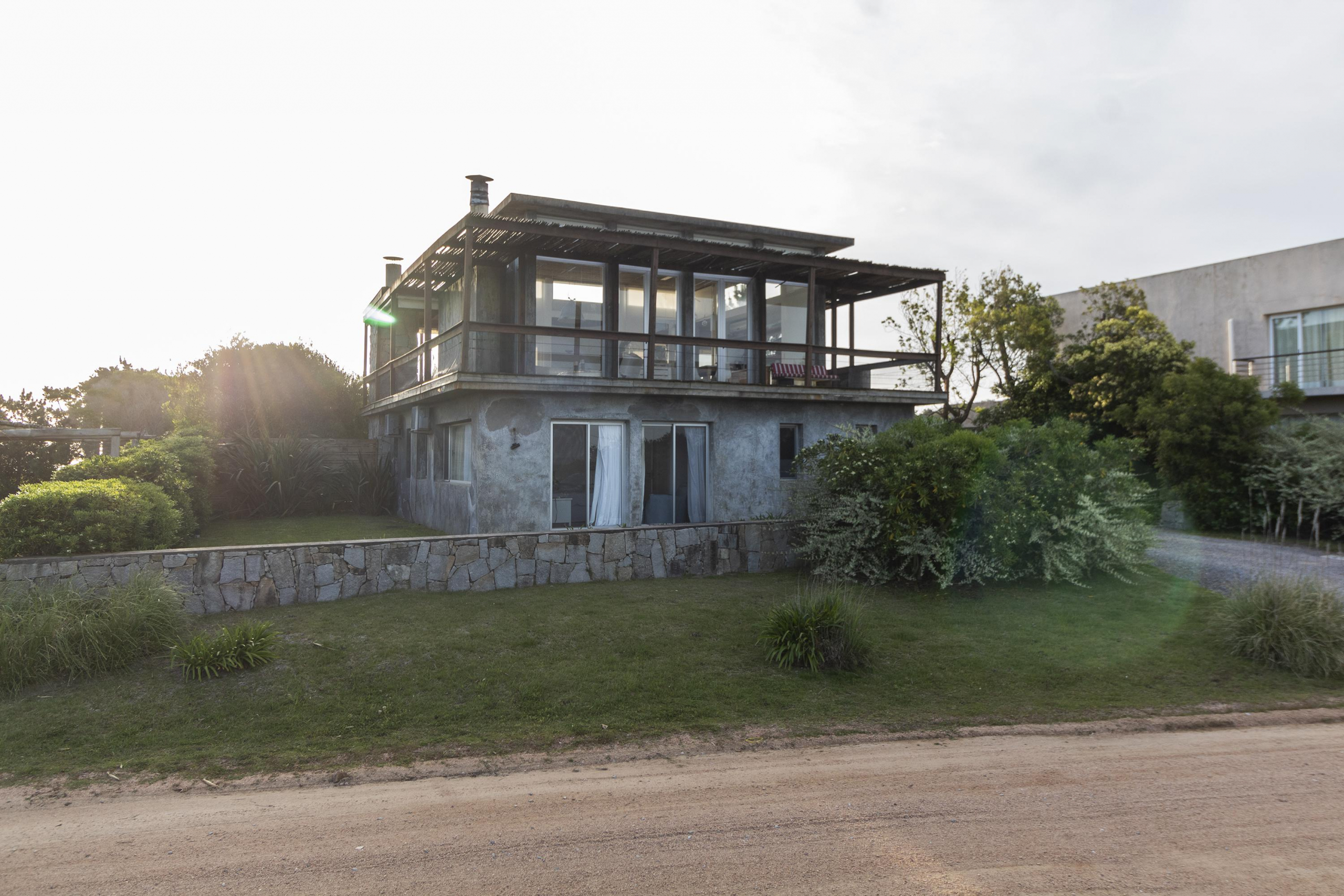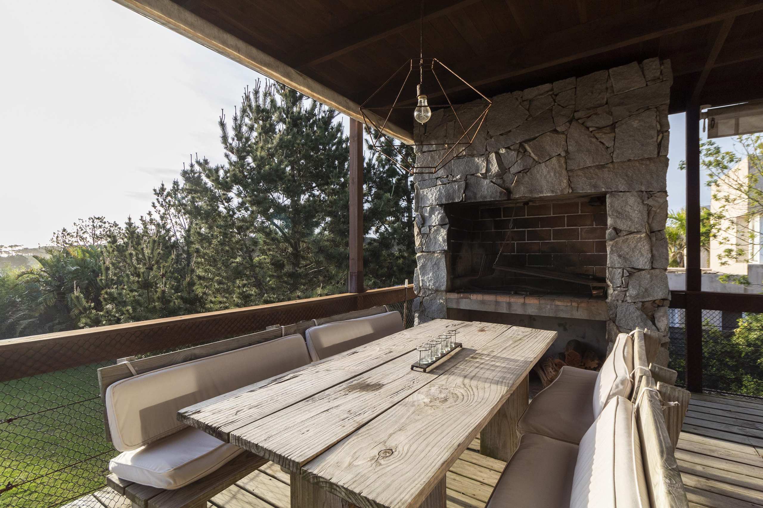 Arriba living comedor y cocina integrado.. amplio deck con fogon y parrilla al atardecer.