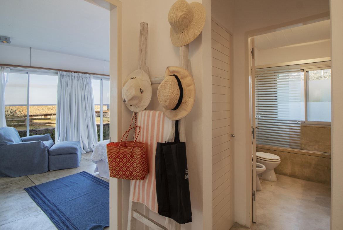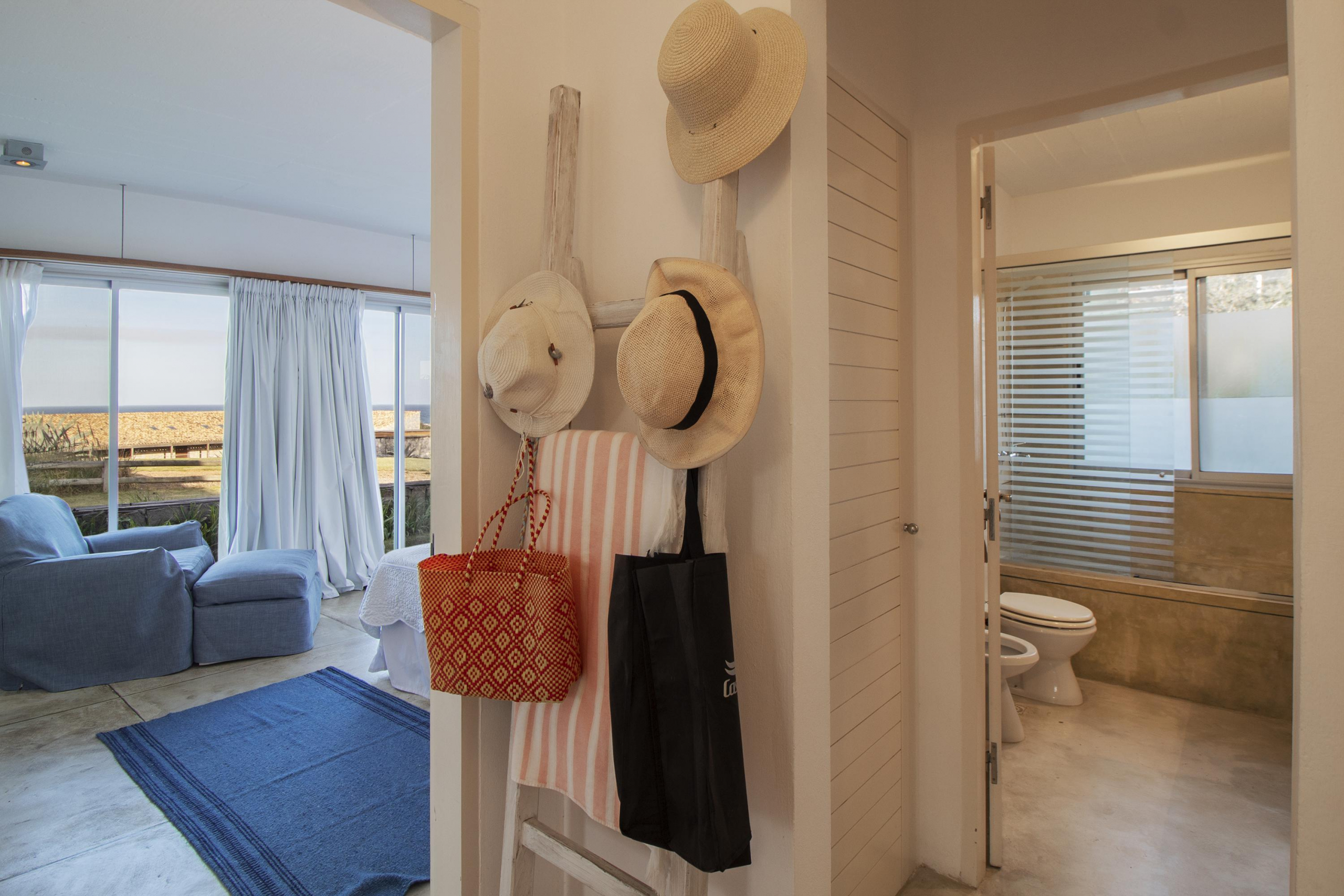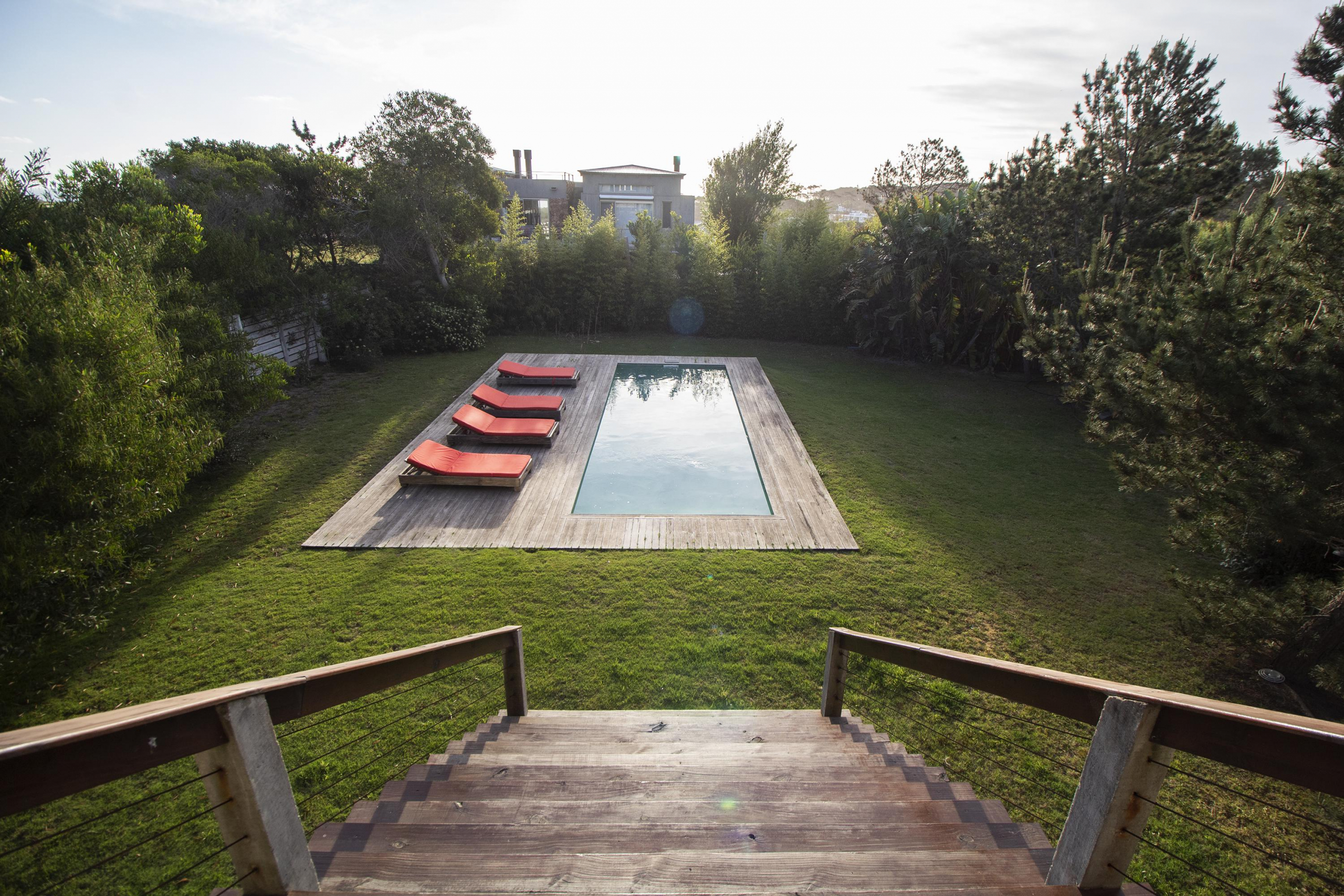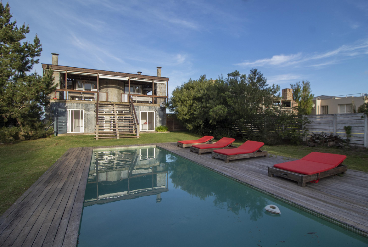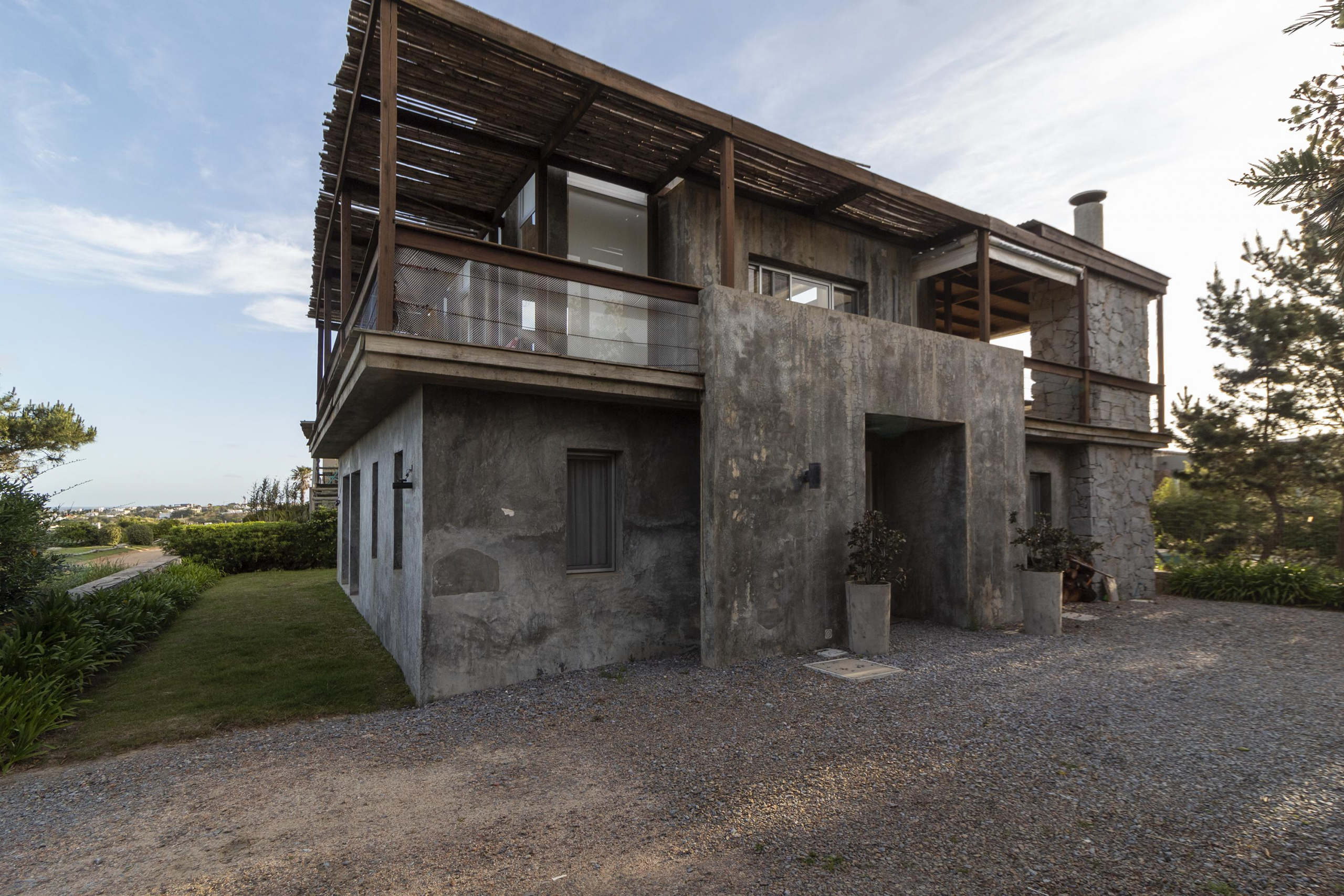 Arriba living comedor y cocina integrado.. amplio deck con fogon y parrilla al atardecer.