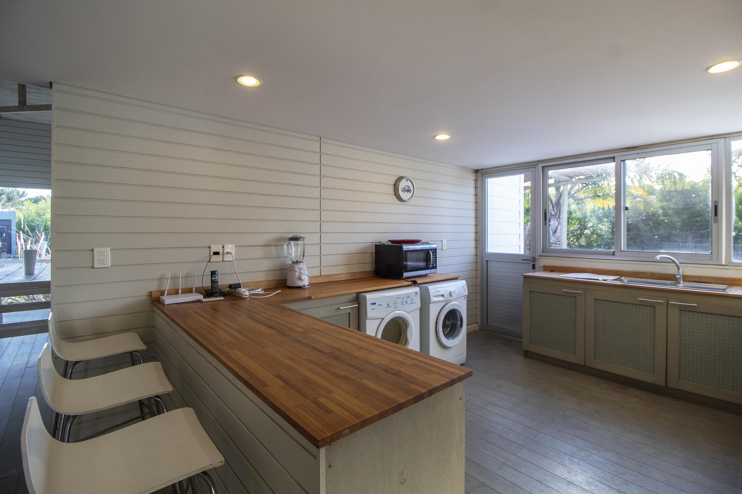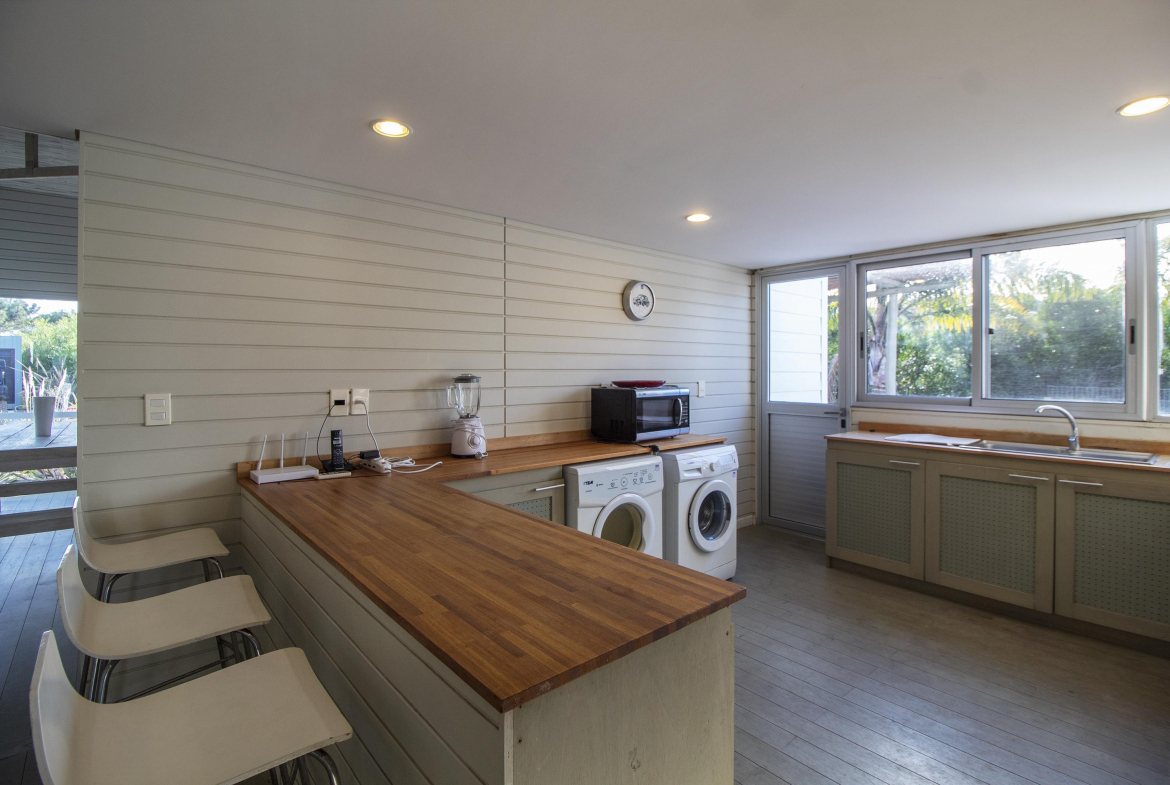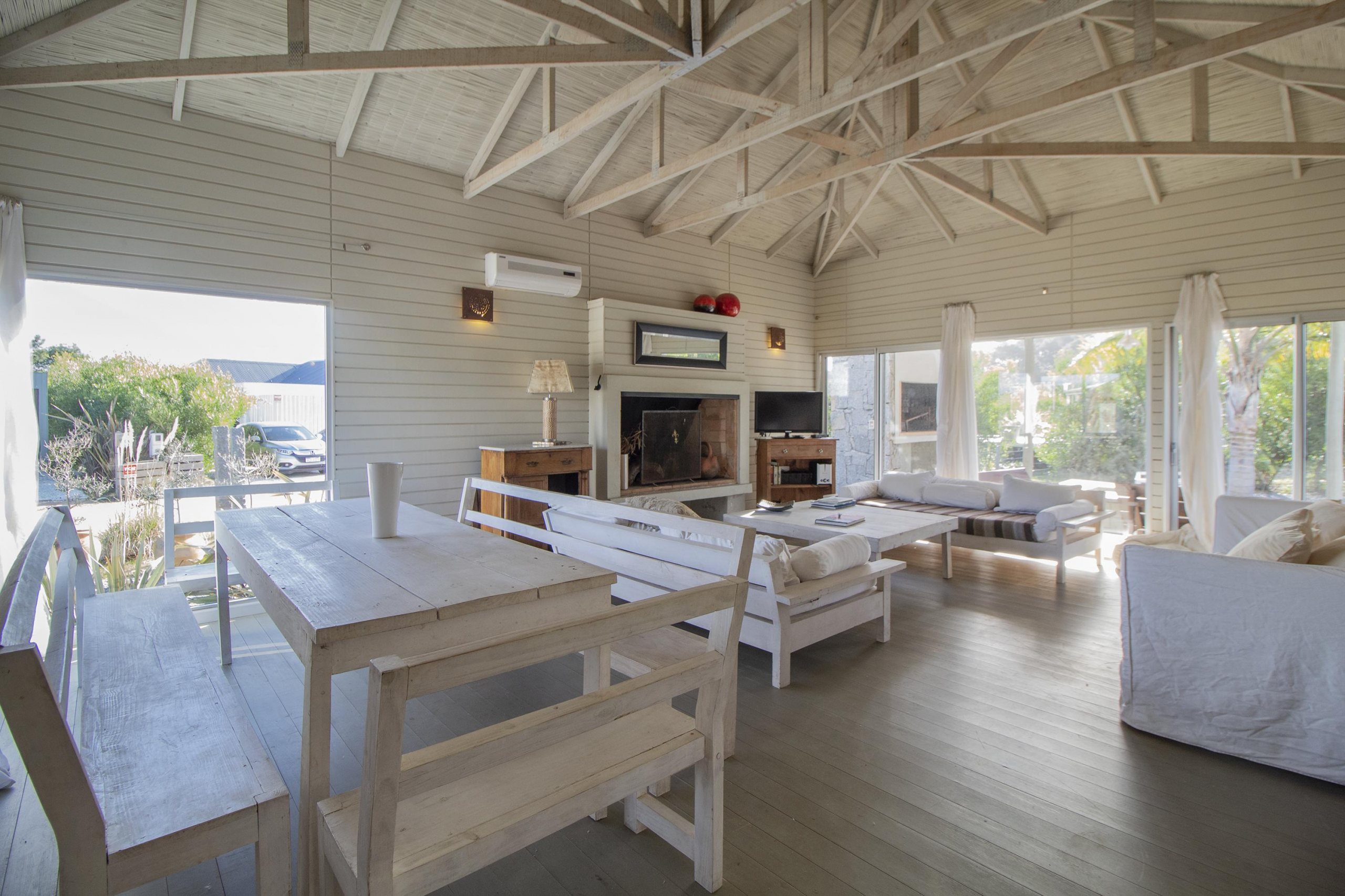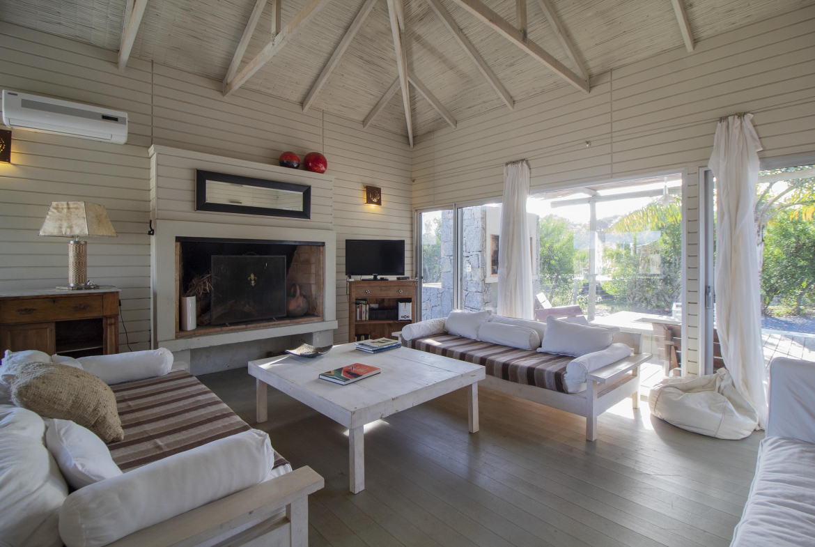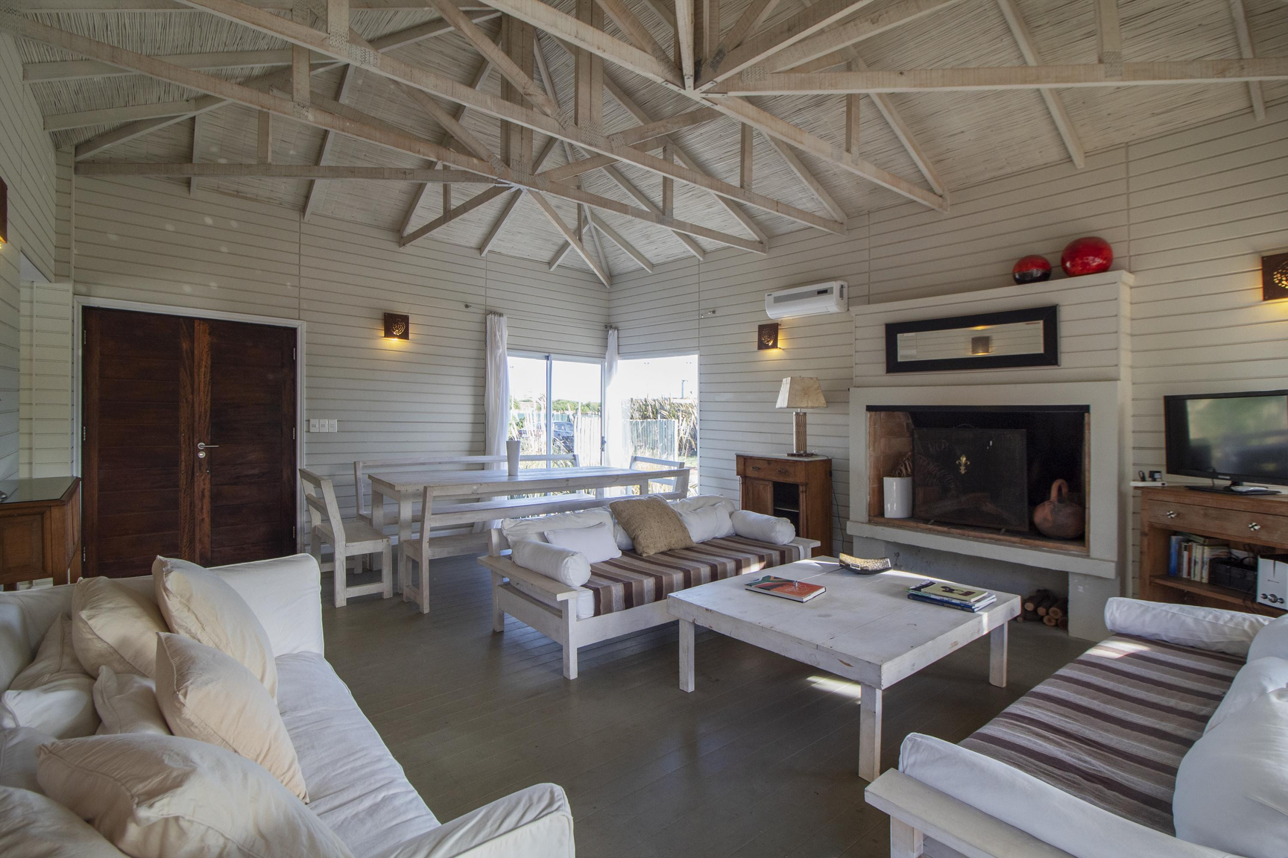 Living comedor integrado, hogar a leña, cocina americana con barra, muy bien equipada, y toillete.