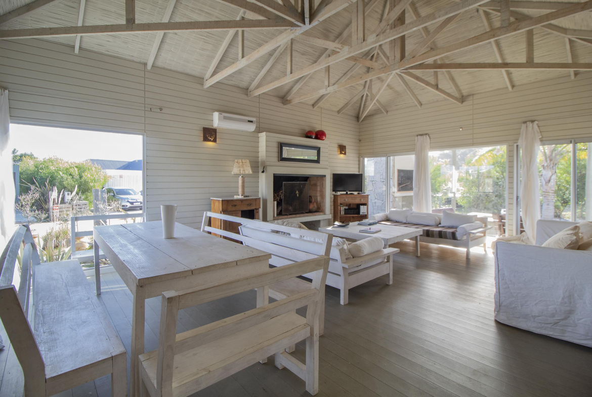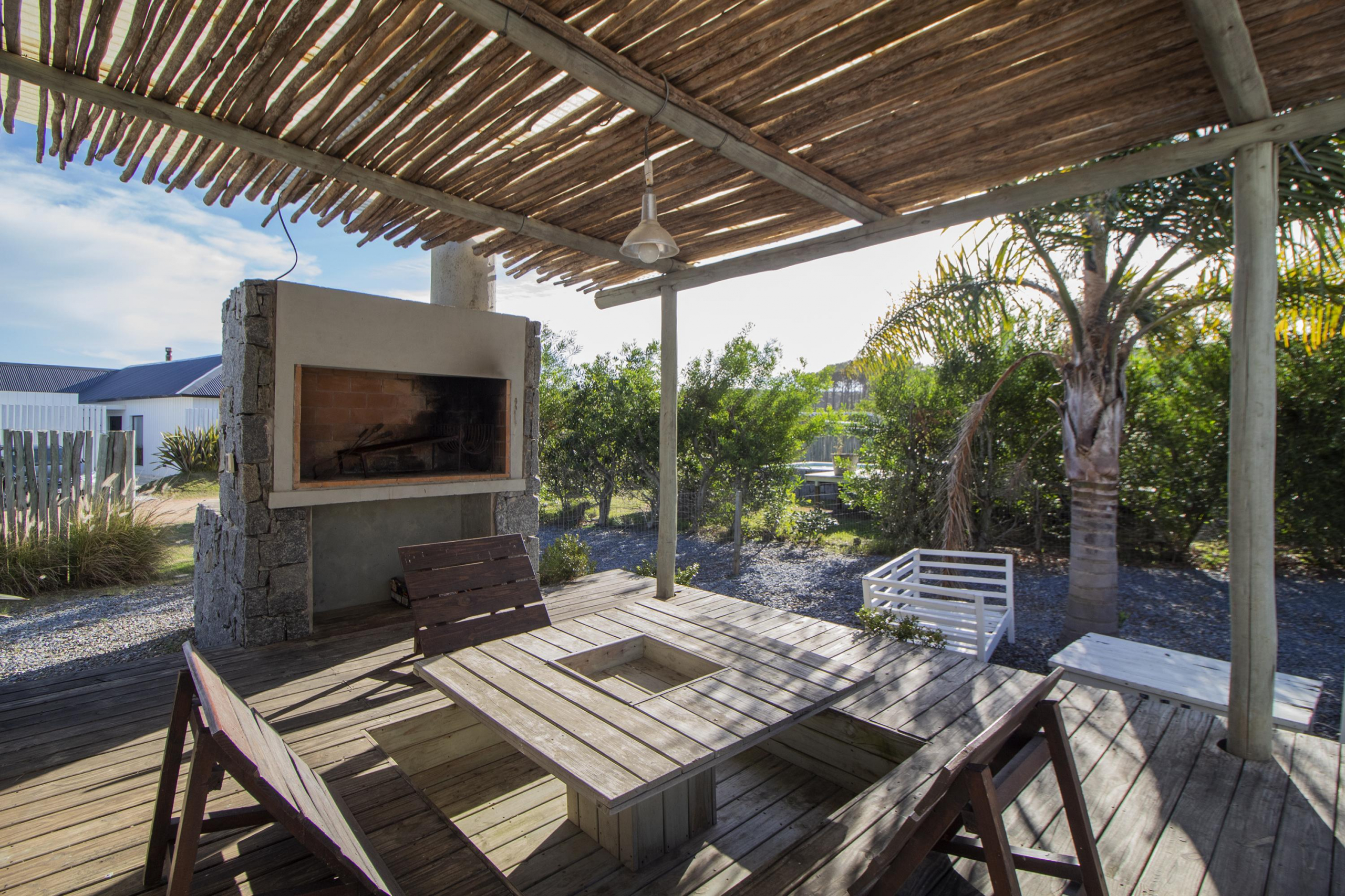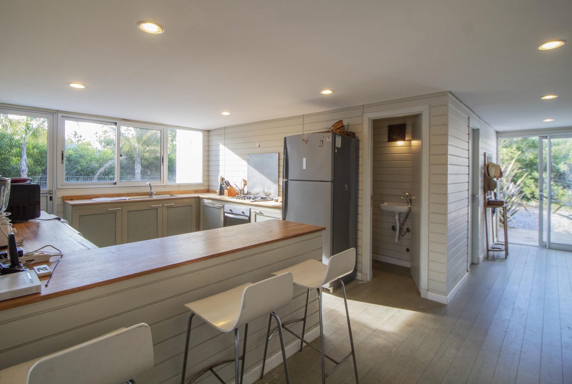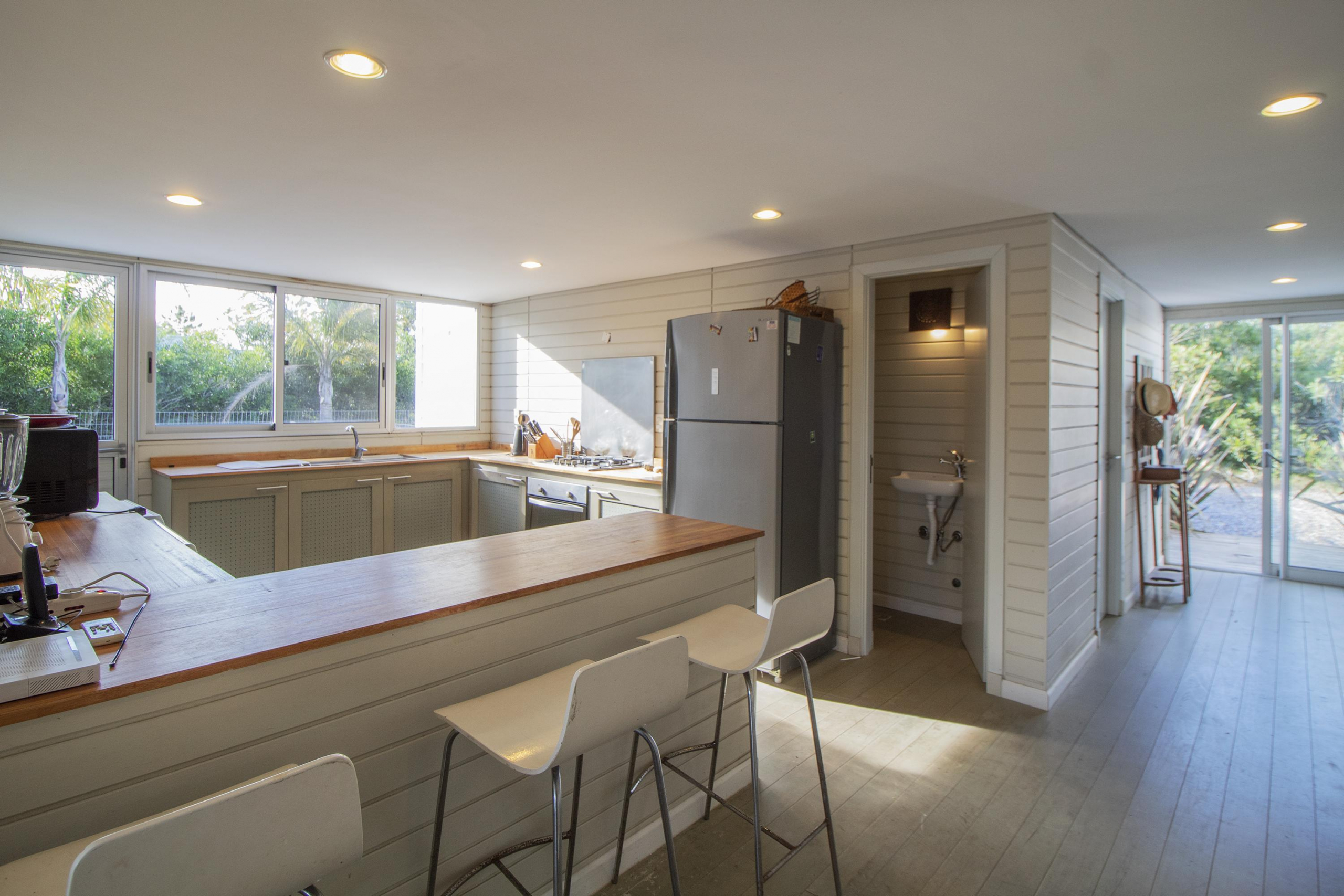 Living comedor integrado, hogar a leña, cocina americana con barra, muy bien equipada, y toillete.
