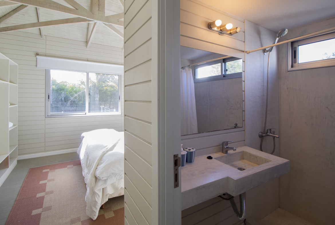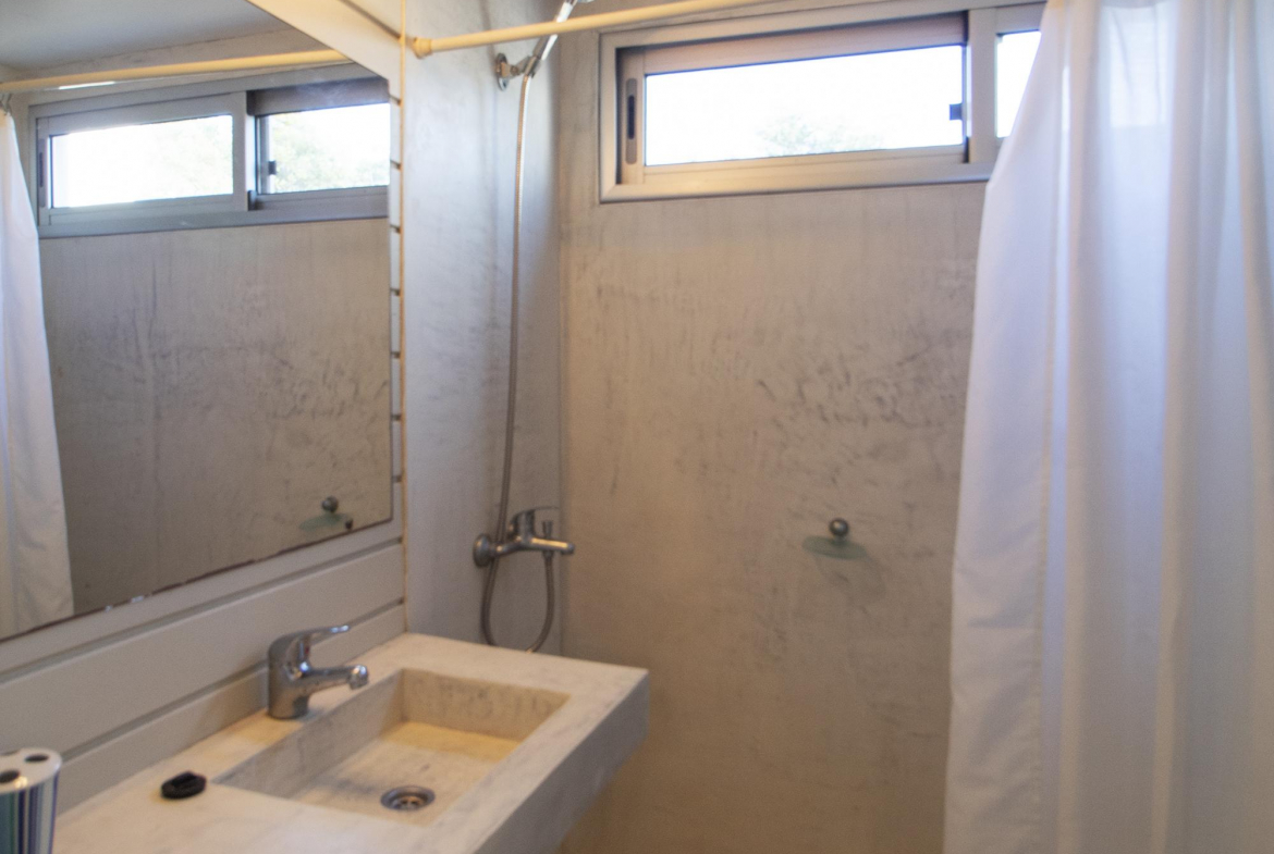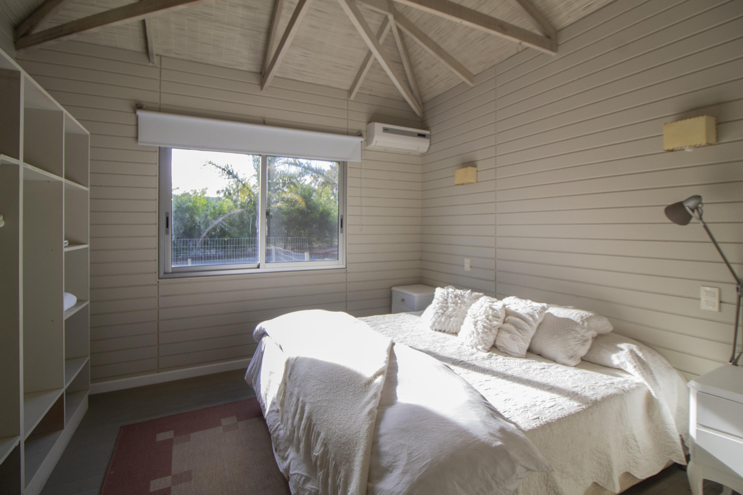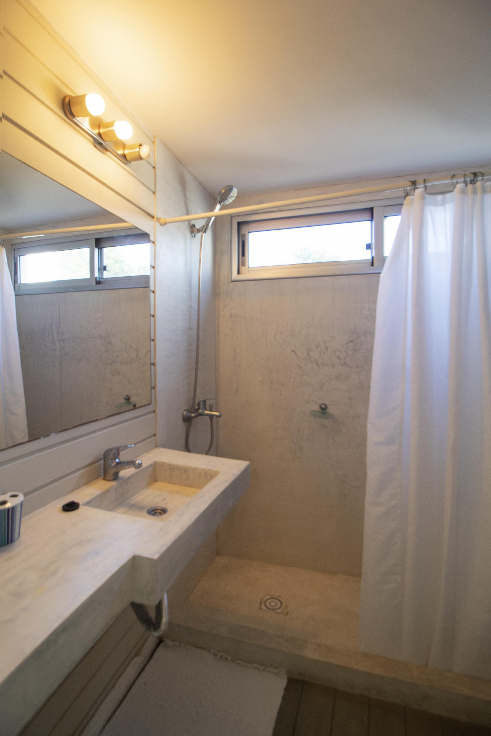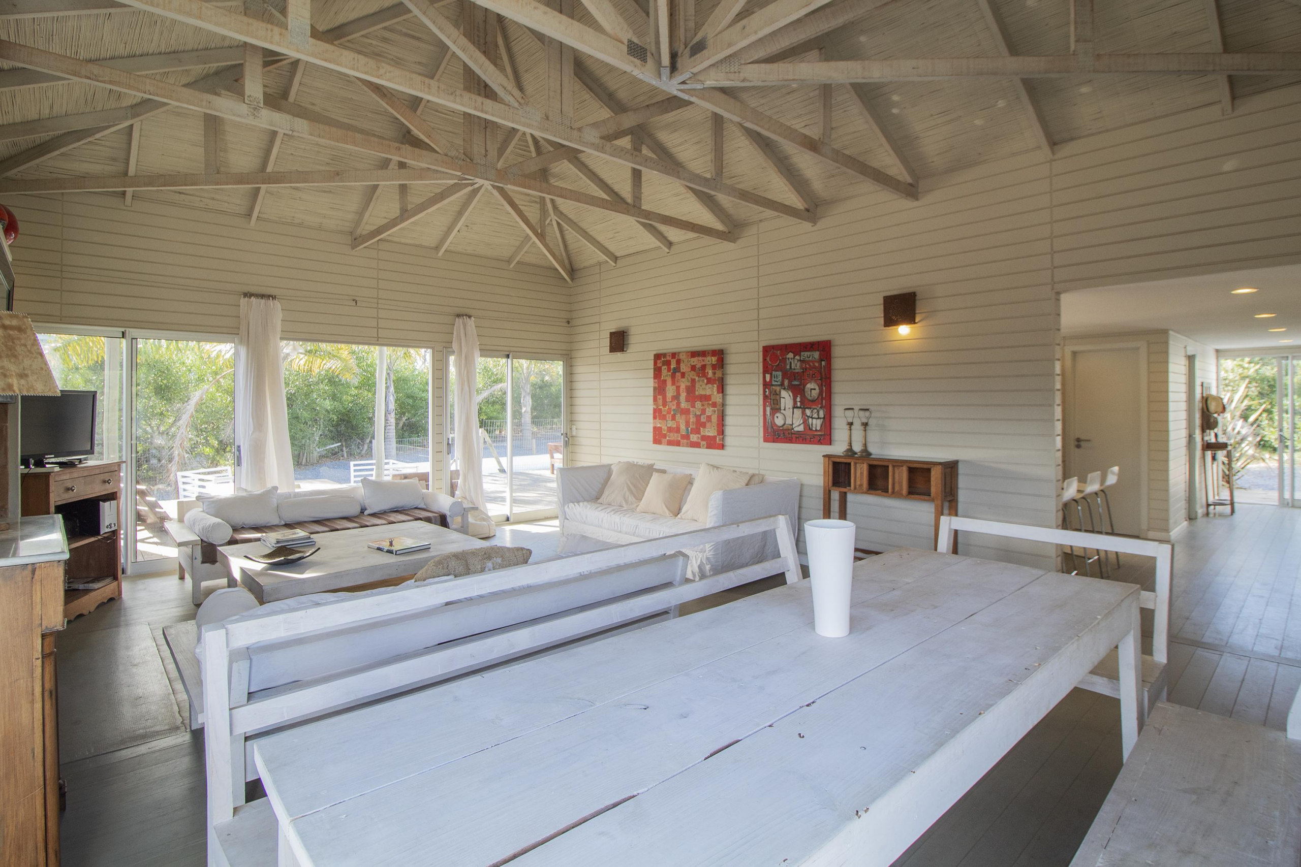 Living comedor integrado, hogar a leña, cocina americana con barra, muy bien equipada, y toillete.