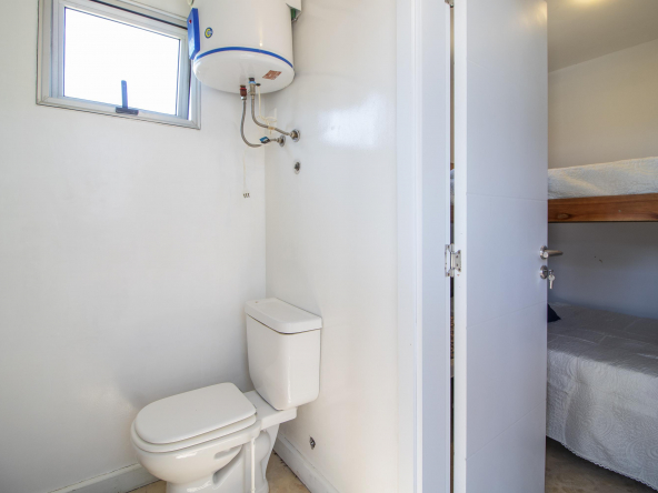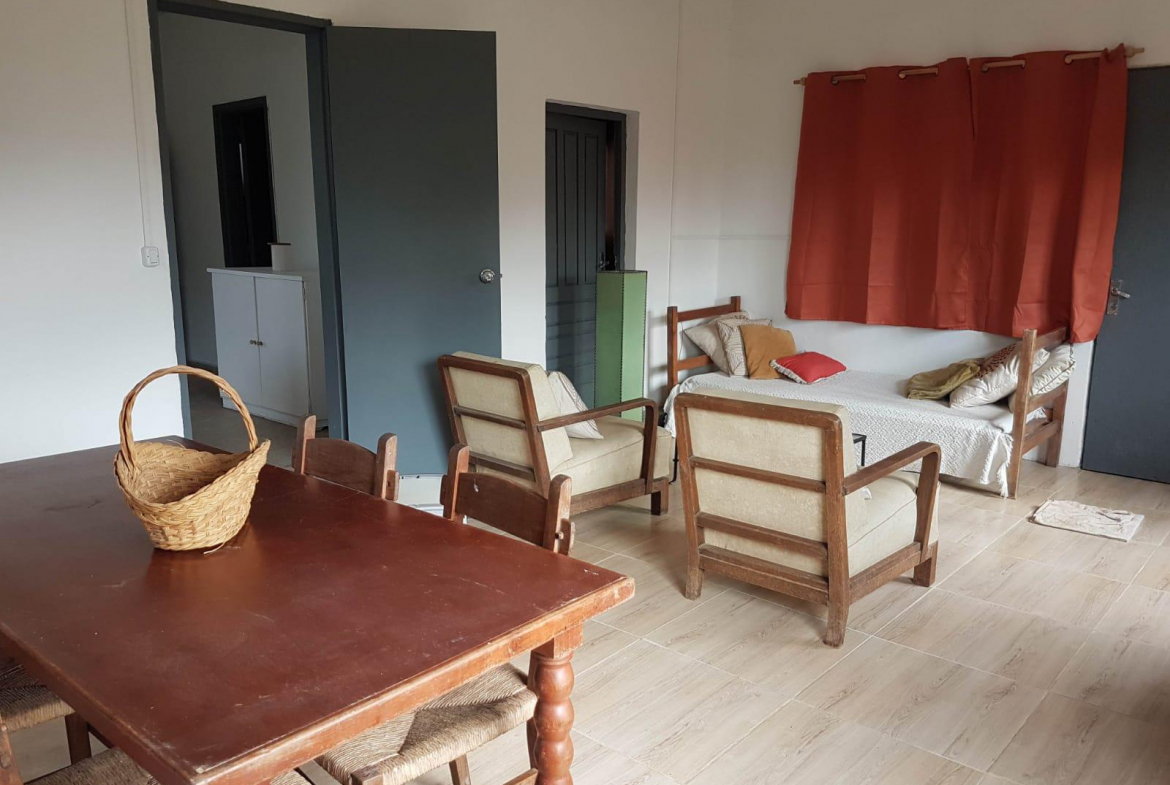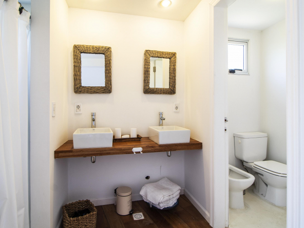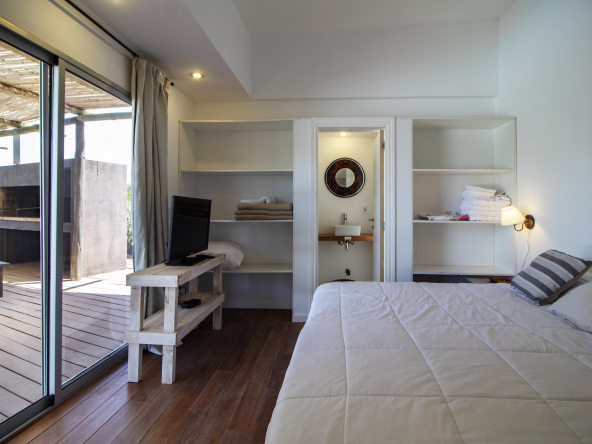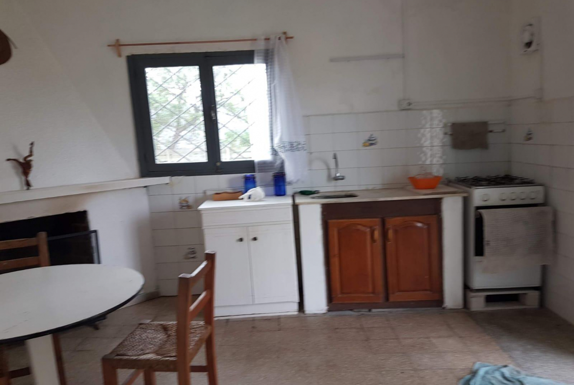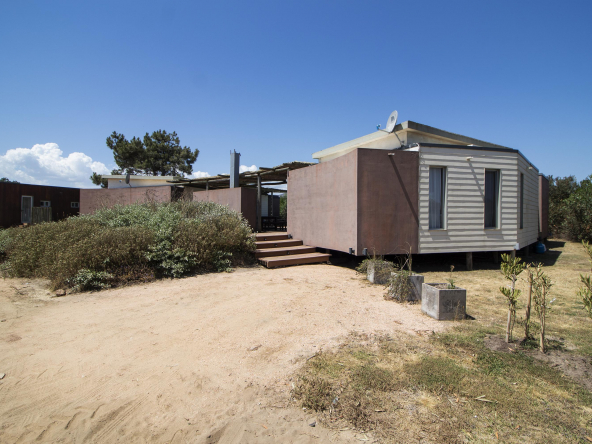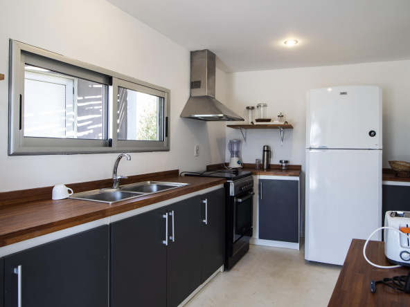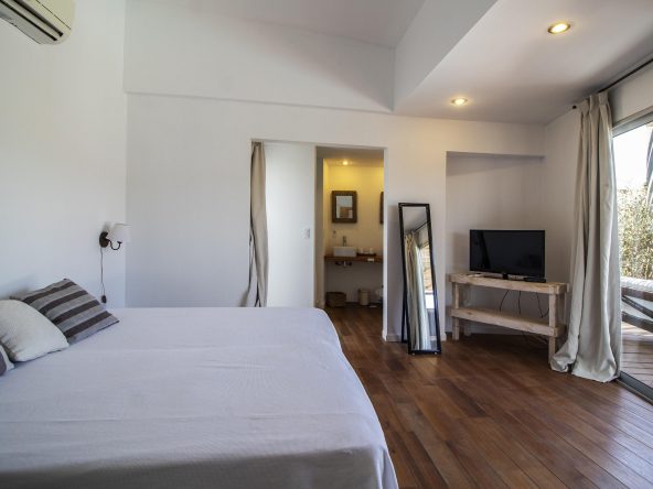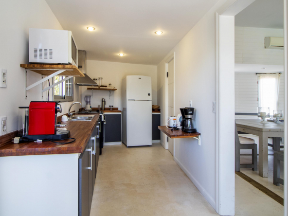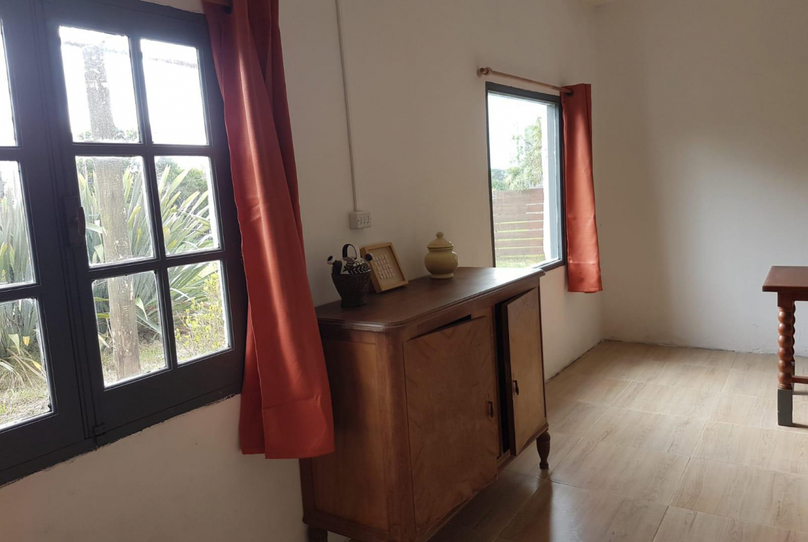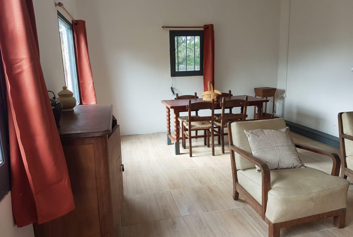 Living comedor integrado, cocina con comedor diario y estufa a leña; dormitorio en suite con vestidor; ambos con piso rustico de madera.