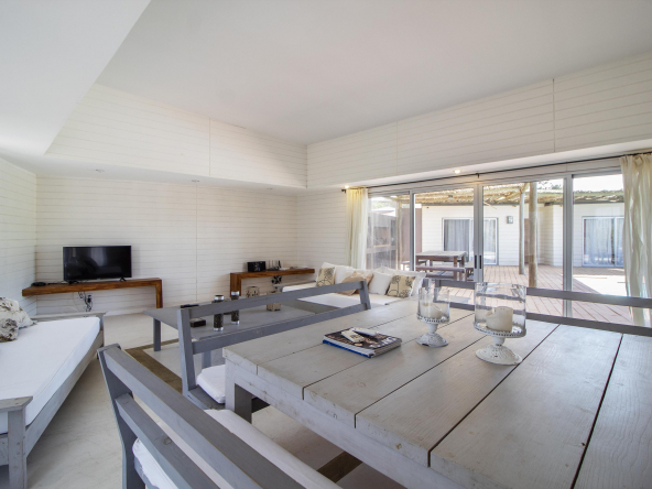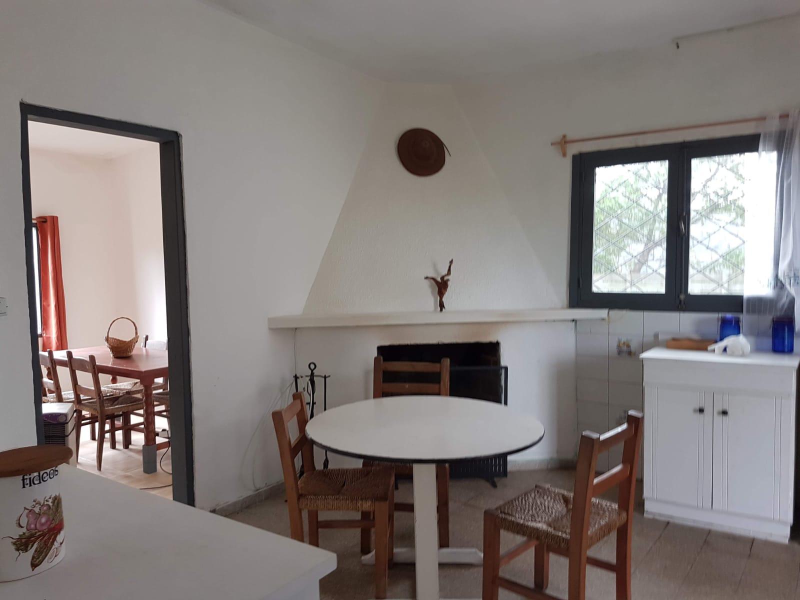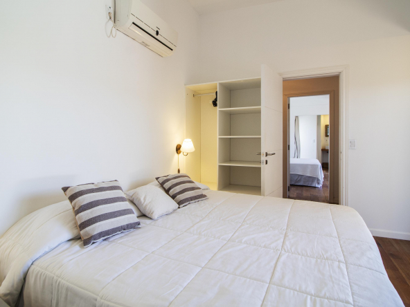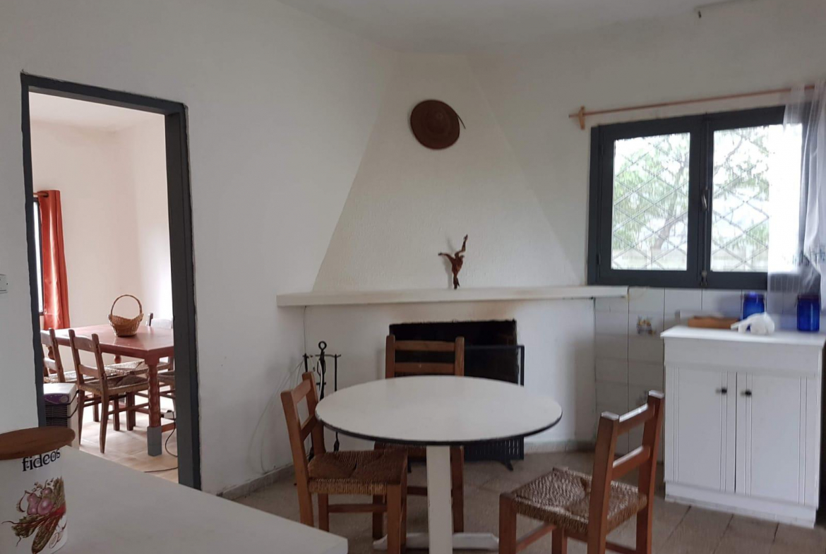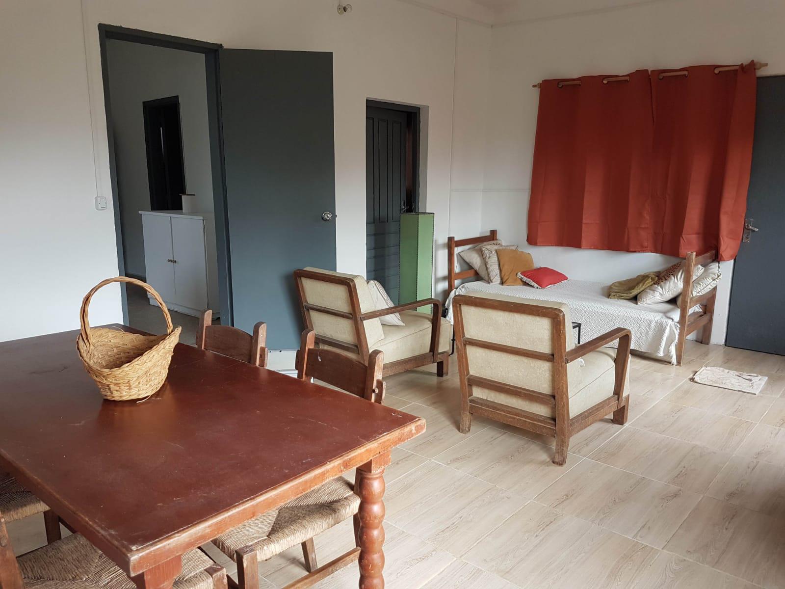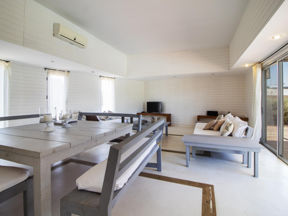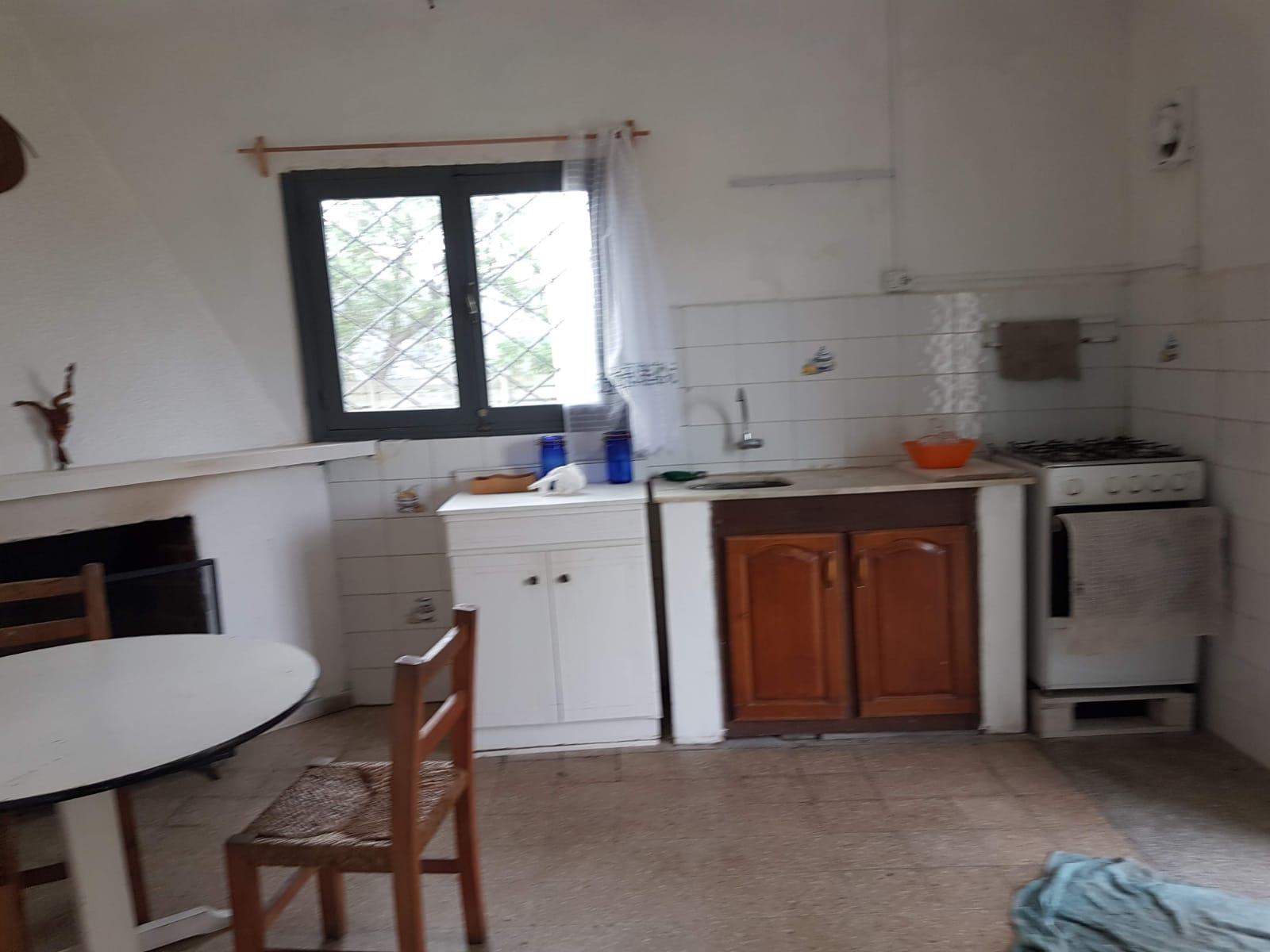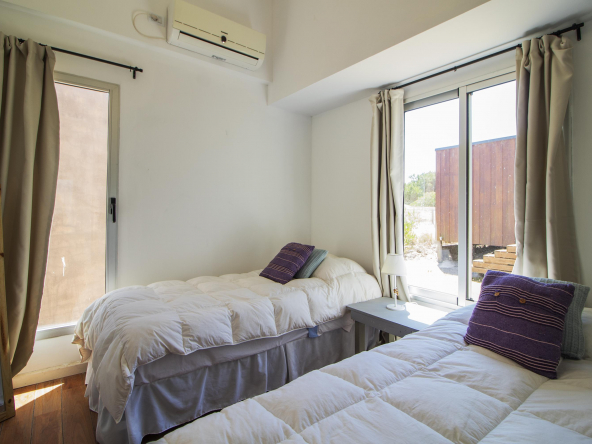 Living comedor integrado, cocina con comedor diario y estufa a leña; dormitorio en suite con vestidor; ambos con piso rustico de madera.