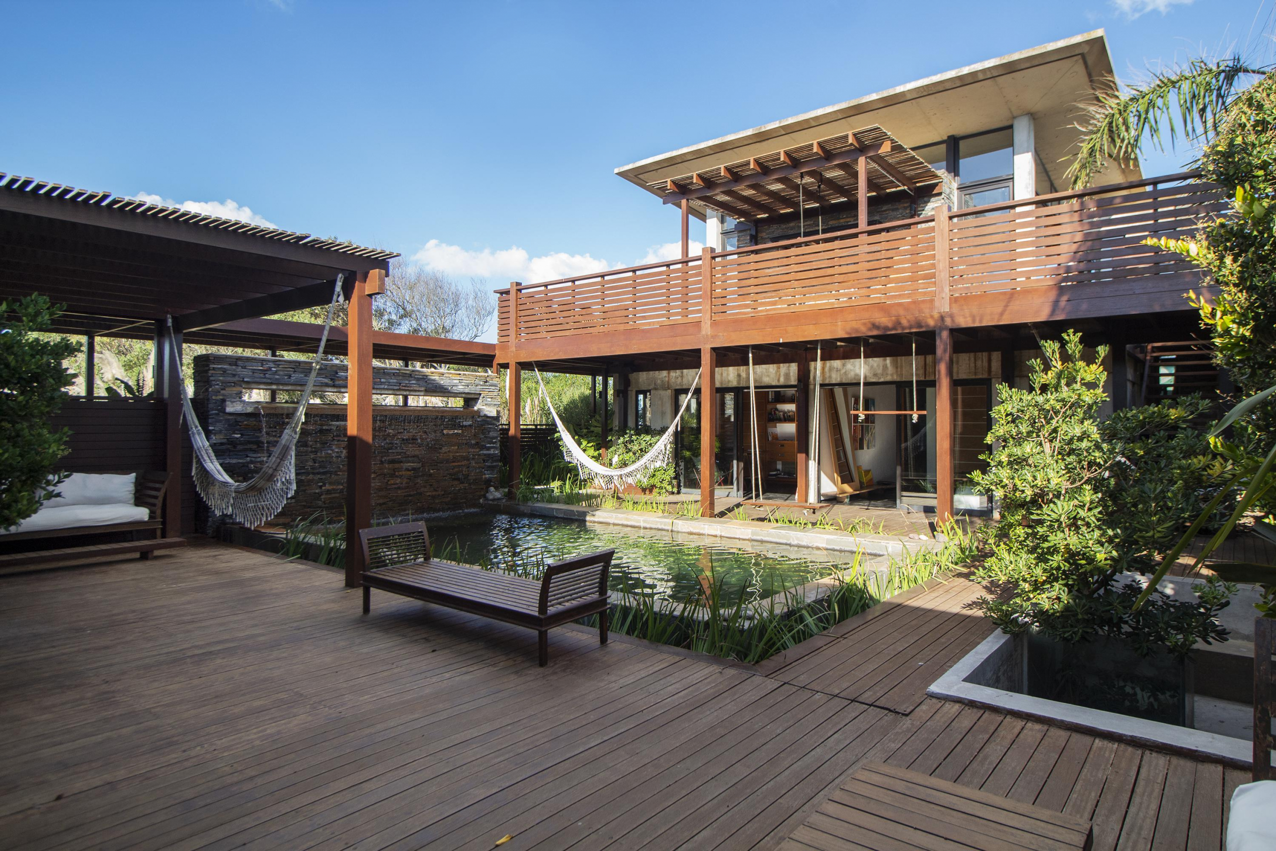 El modulo principal, de dos niveles, posee en la parte superior un único espacio para el salón y la cocina separados con una barra, un espacio de techos altos y amplios ventanales que te ofrecen una inigualable vista al mar y permiten la entrada de luz natural, entre la casa y el océano se planteó una zona aterrazada de gran belleza. En la planta baja se encuentra la master con doble baño, un espacio de gran tamaño y muy iluminado con ventanas que te permiten apreciar de manera hermosa la vegetación que rodea a la casa. Dos dormitorios en suite con salida al deck completan la planta baja del módulo principal.