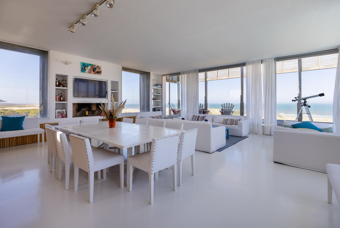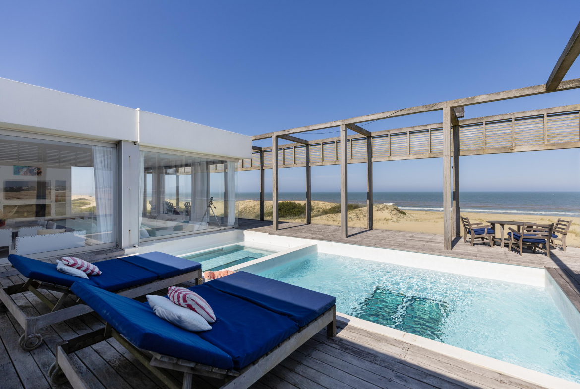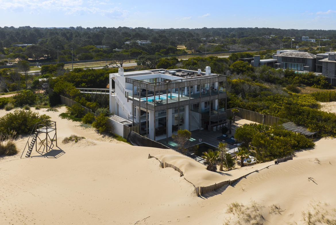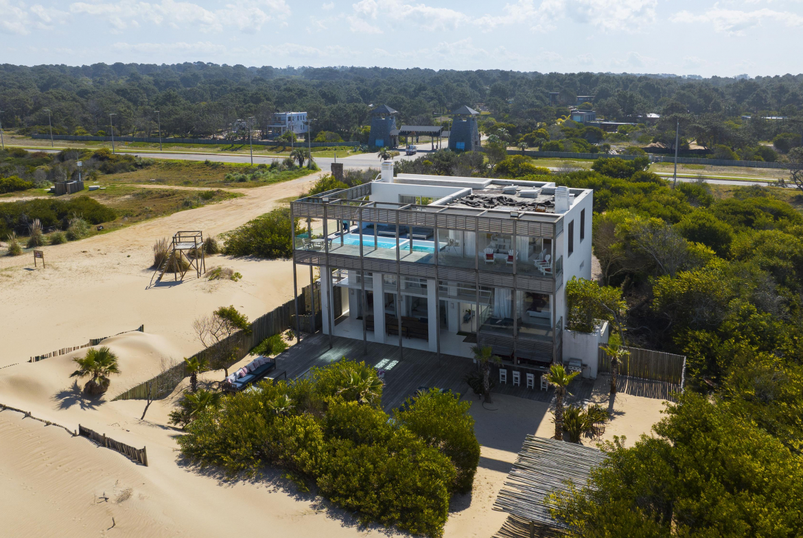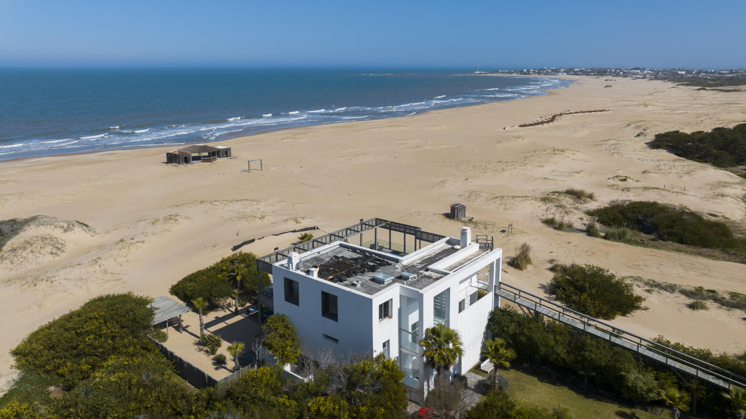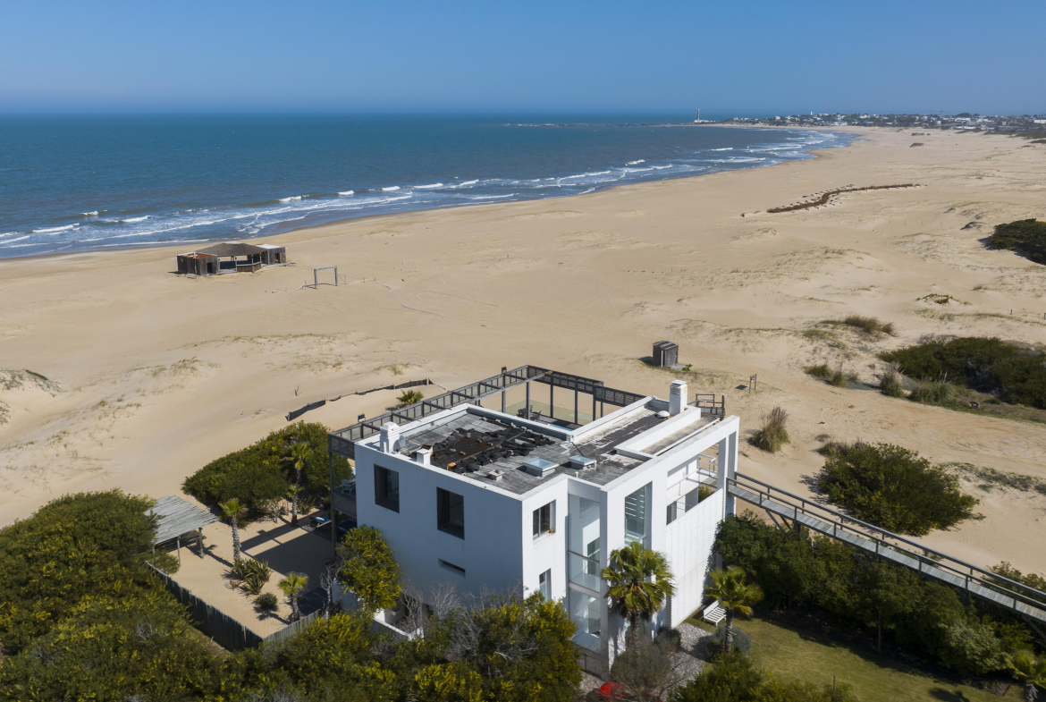 Impactante casa sobre la playa brava de Josè Ignacio , la mejor vista directa al faro, amanecer, salida de la Luna , amplias playas, puente laguna Garzon. Se dispone en tres niveles, con dos piscinas , una climatizada en la terraza y otra en el jardín. En el primer nivel encontramos el hall de entrada, con amplio ambiente de estar que se comunica con el jardín y la piscina ,barra y chill out. Dos suites , áreas de servicio con baño y cocina propias y garage. En el segundo nivel encontramos la master suite, estar, dos suites iguales a las de primer nivel.