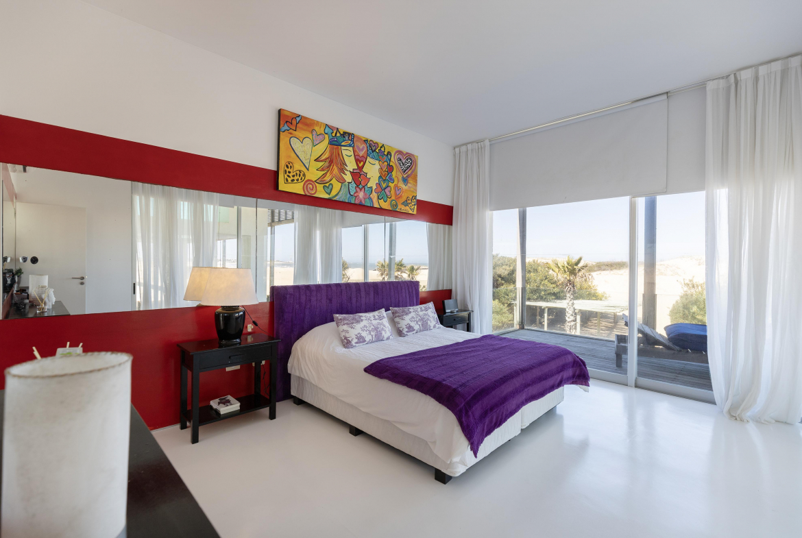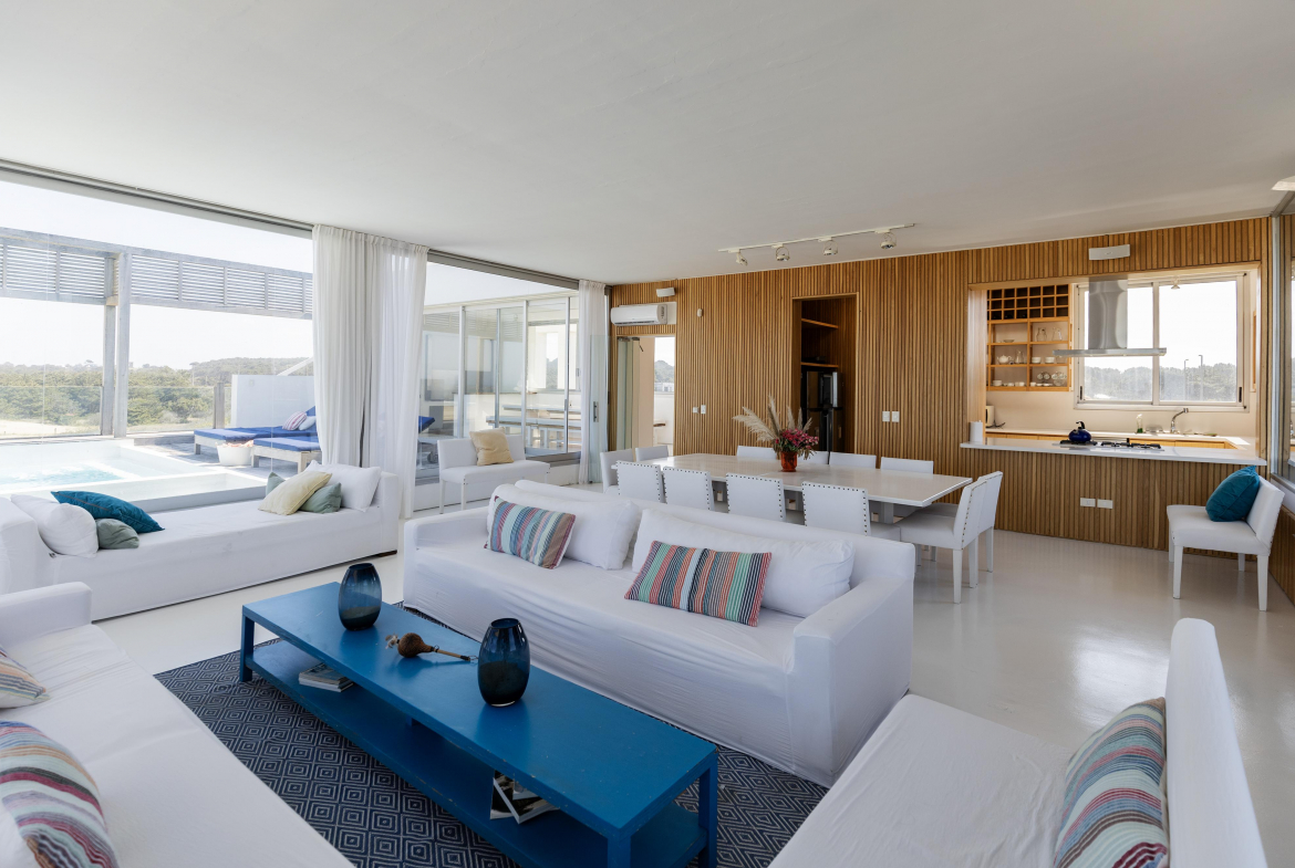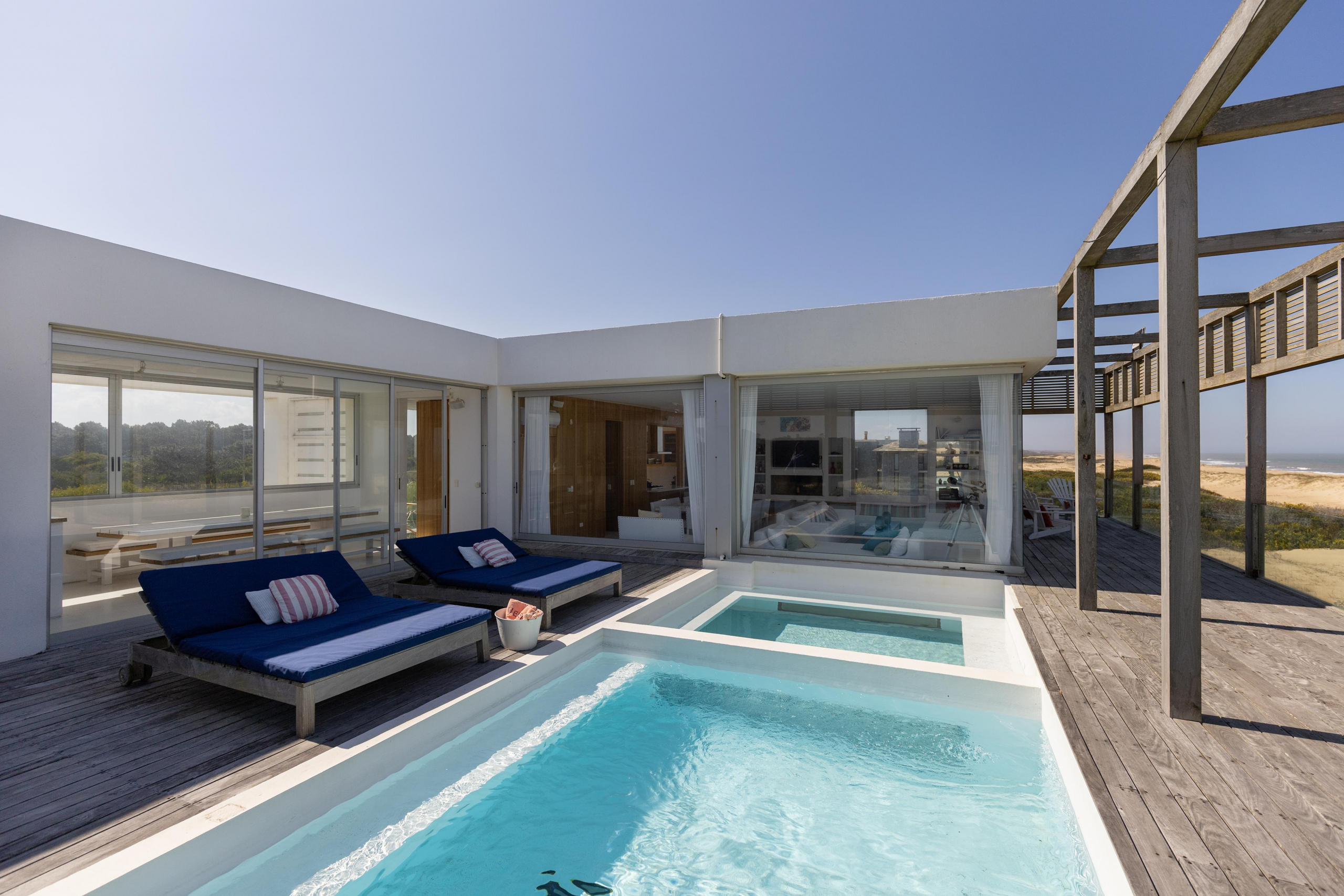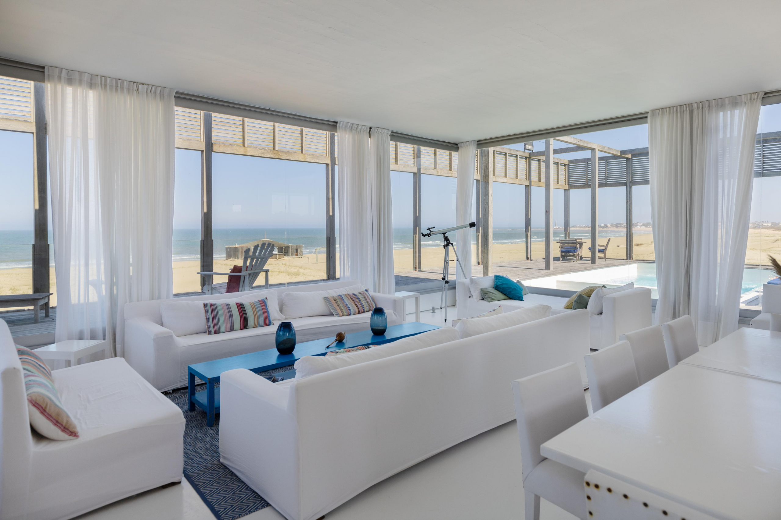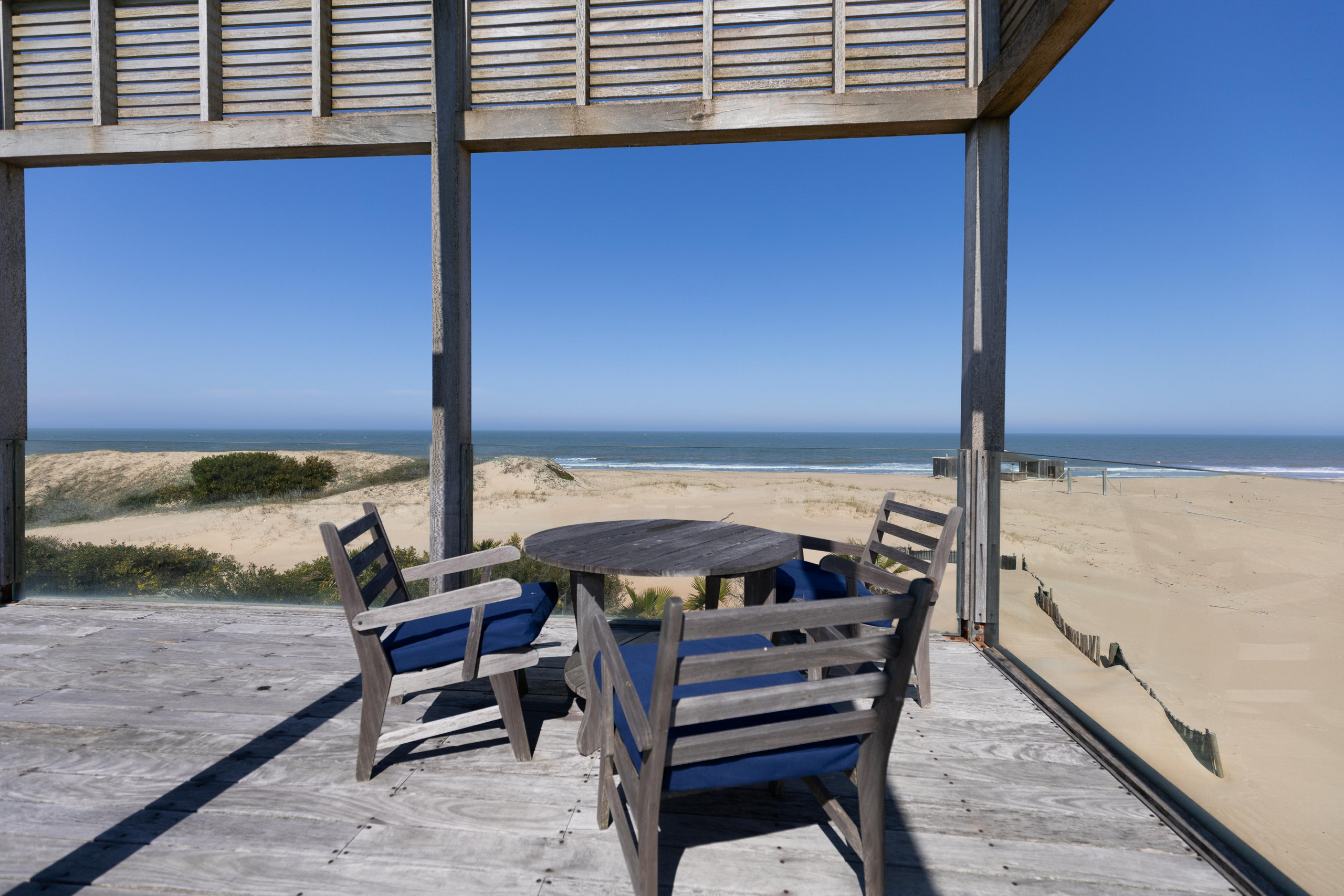 Impactante casa sobre la playa brava de Josè Ignacio , la mejor vista directa al faro, amanecer, salida de la Luna , amplias playas, puente laguna Garzon. Se dispone en tres niveles, con dos piscinas , una climatizada en la terraza y otra en el jardín. En el primer nivel encontramos el hall de entrada, con amplio ambiente de estar que se comunica con el jardín y la piscina ,barra y chill out. Dos suites , áreas de servicio con baño y cocina propias y garage. En el segundo nivel encontramos la master suite, estar, dos suites iguales a las de primer nivel.