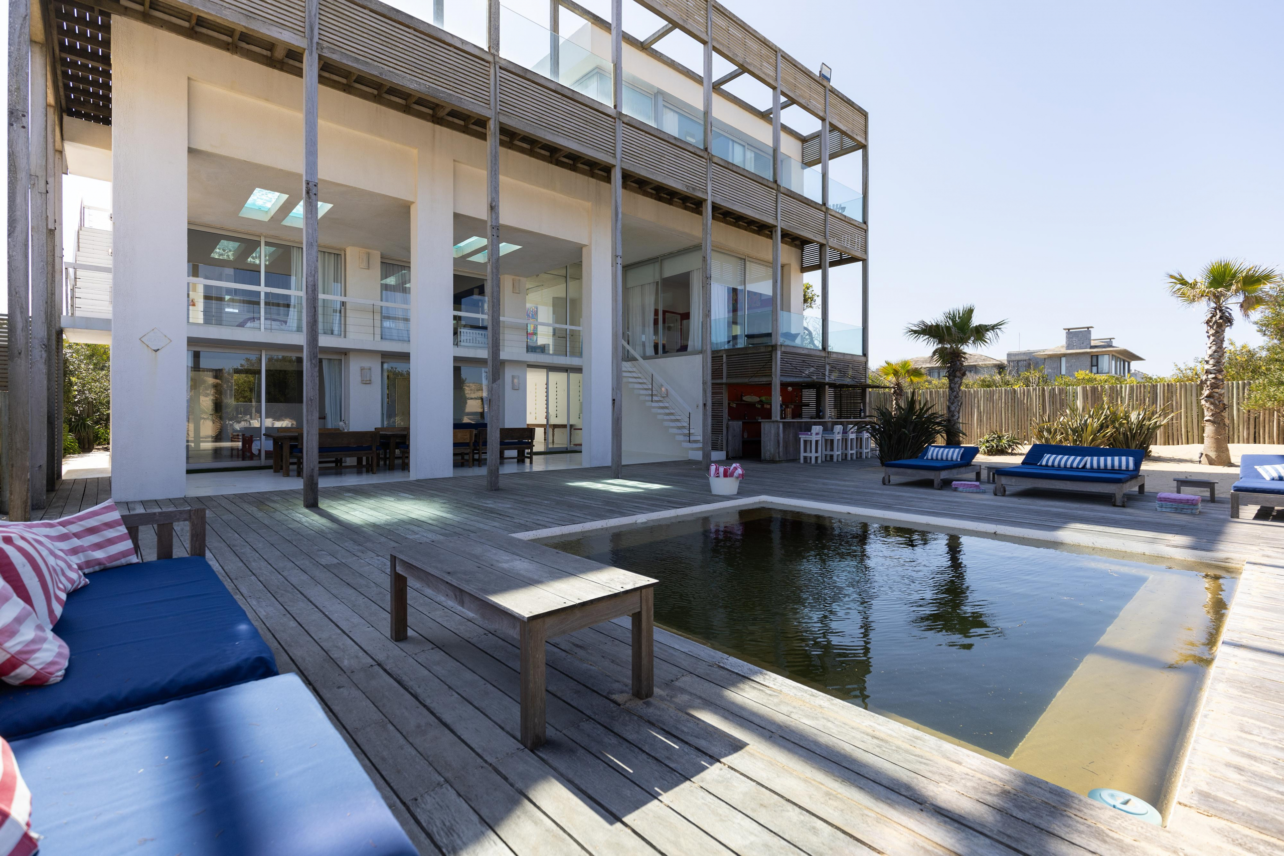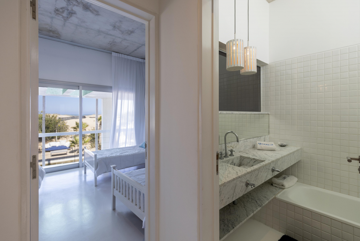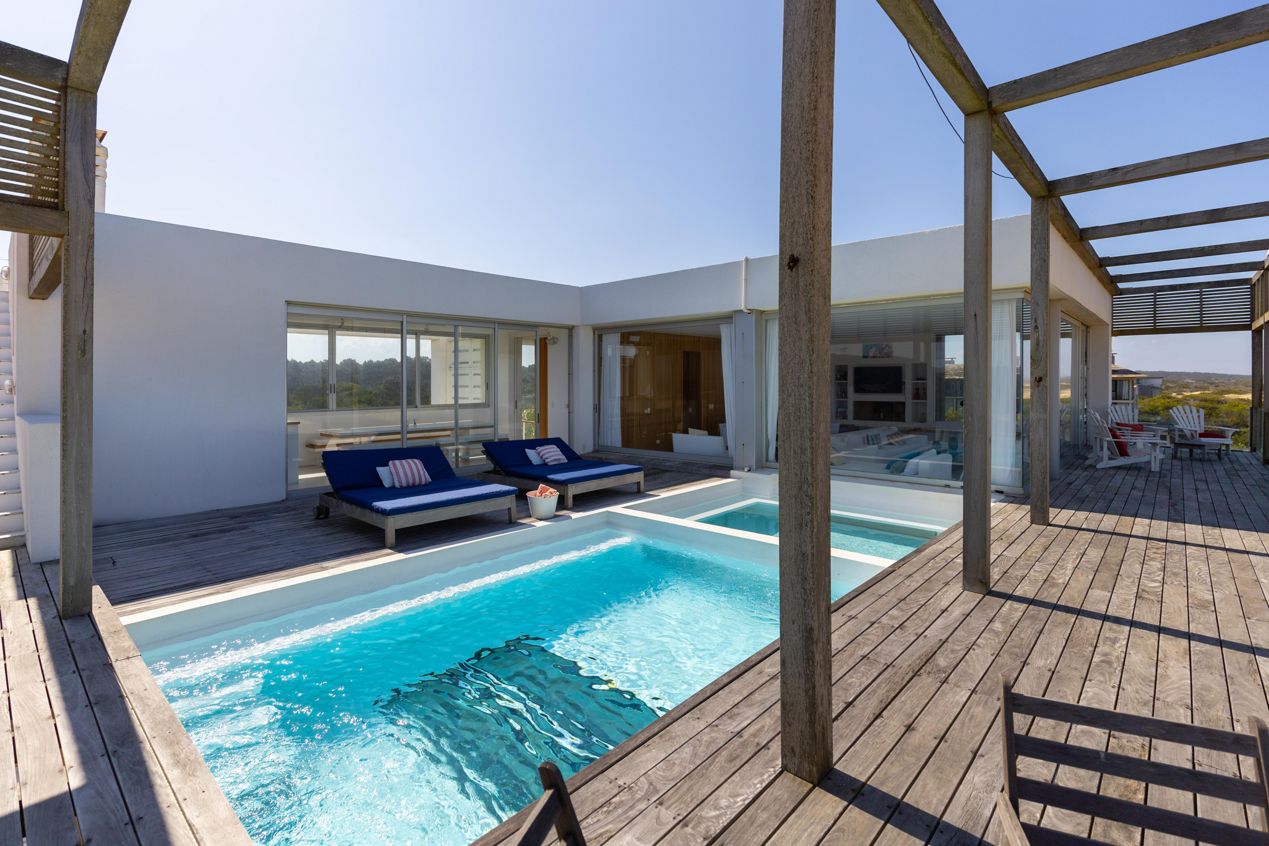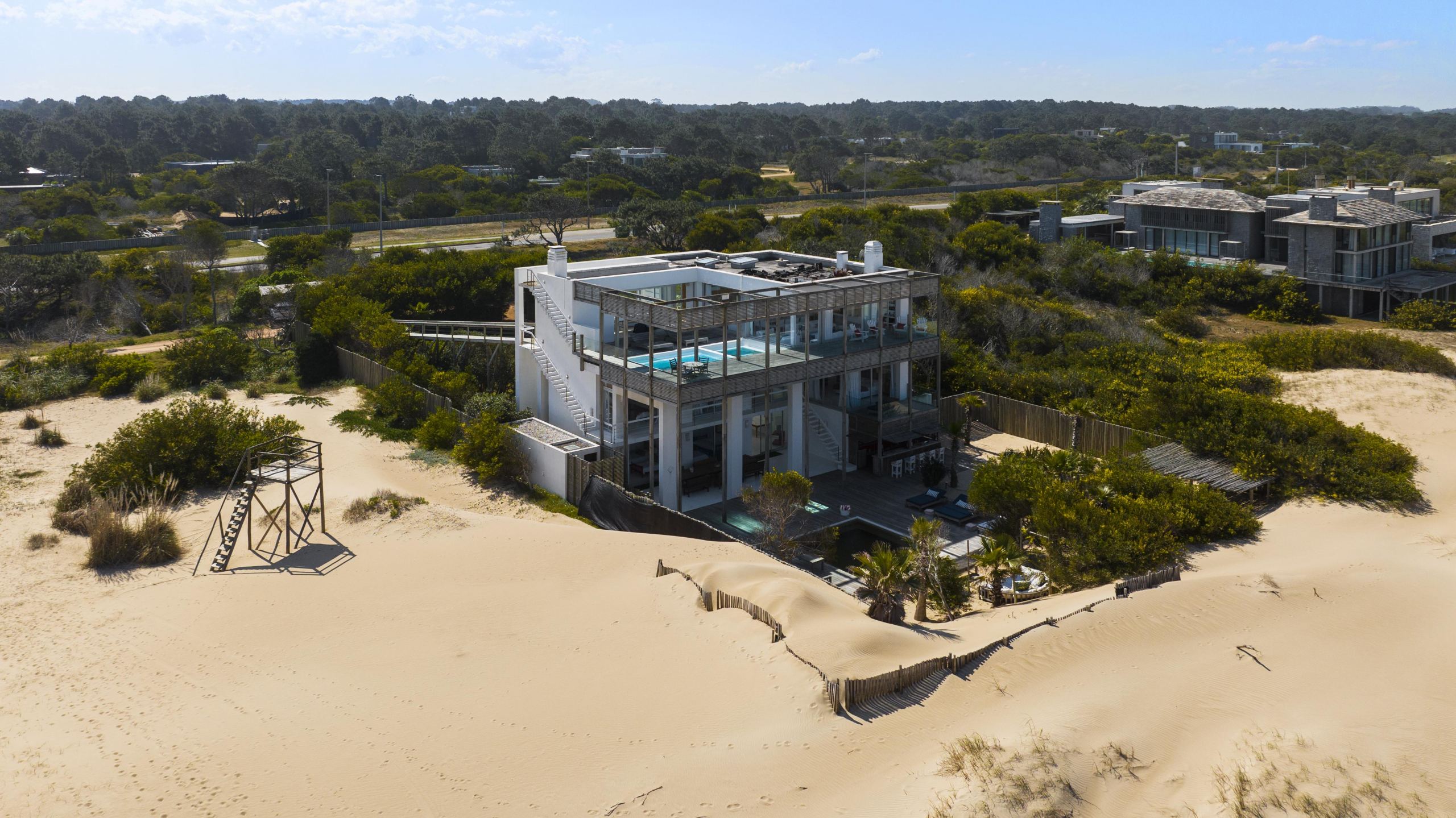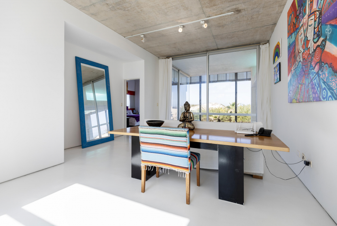 Impactante casa sobre la playa brava de Josè Ignacio , la mejor vista directa al faro, amanecer, salida de la Luna , amplias playas, puente laguna Garzon. Se dispone en tres niveles, con dos piscinas , una climatizada en la terraza y otra en el jardín. En el primer nivel encontramos el hall de entrada, con amplio ambiente de estar que se comunica con el jardín y la piscina ,barra y chill out. Dos suites , áreas de servicio con baño y cocina propias y garage. En el segundo nivel encontramos la master suite, estar, dos suites iguales a las de primer nivel.