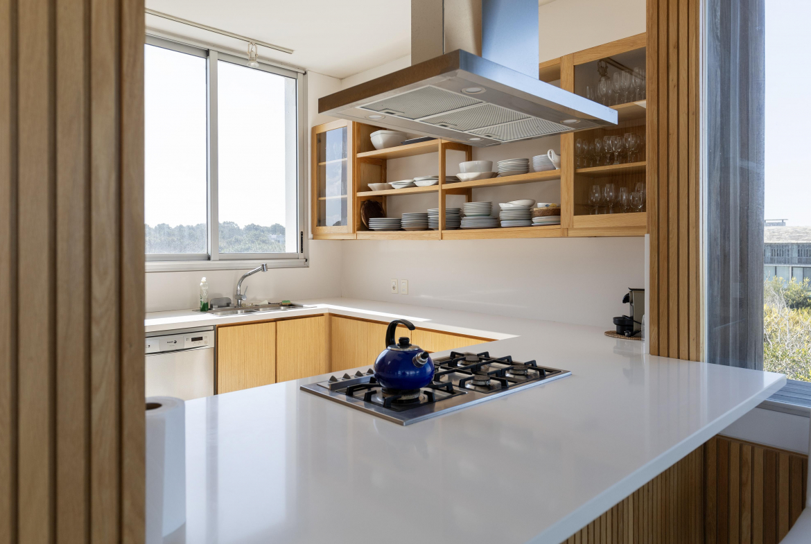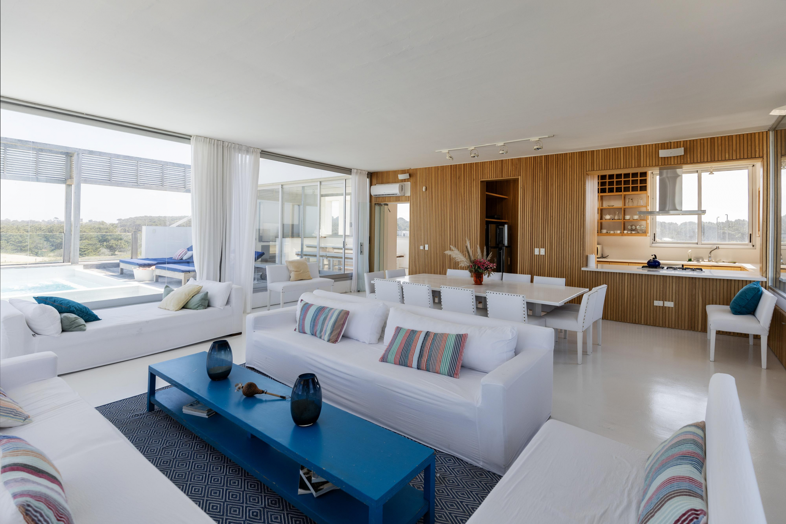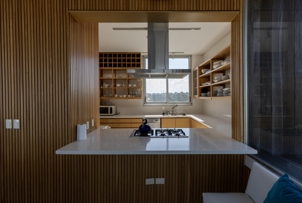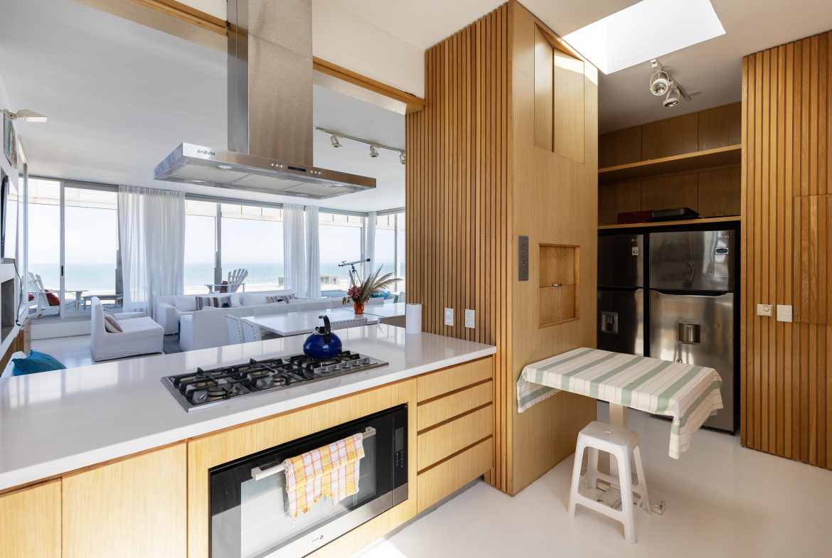 Living comedor, cocina, parrillero cerrado, terrazas y piscinas se disponen todo en tercer nivel ganando una vista al mar destacada.